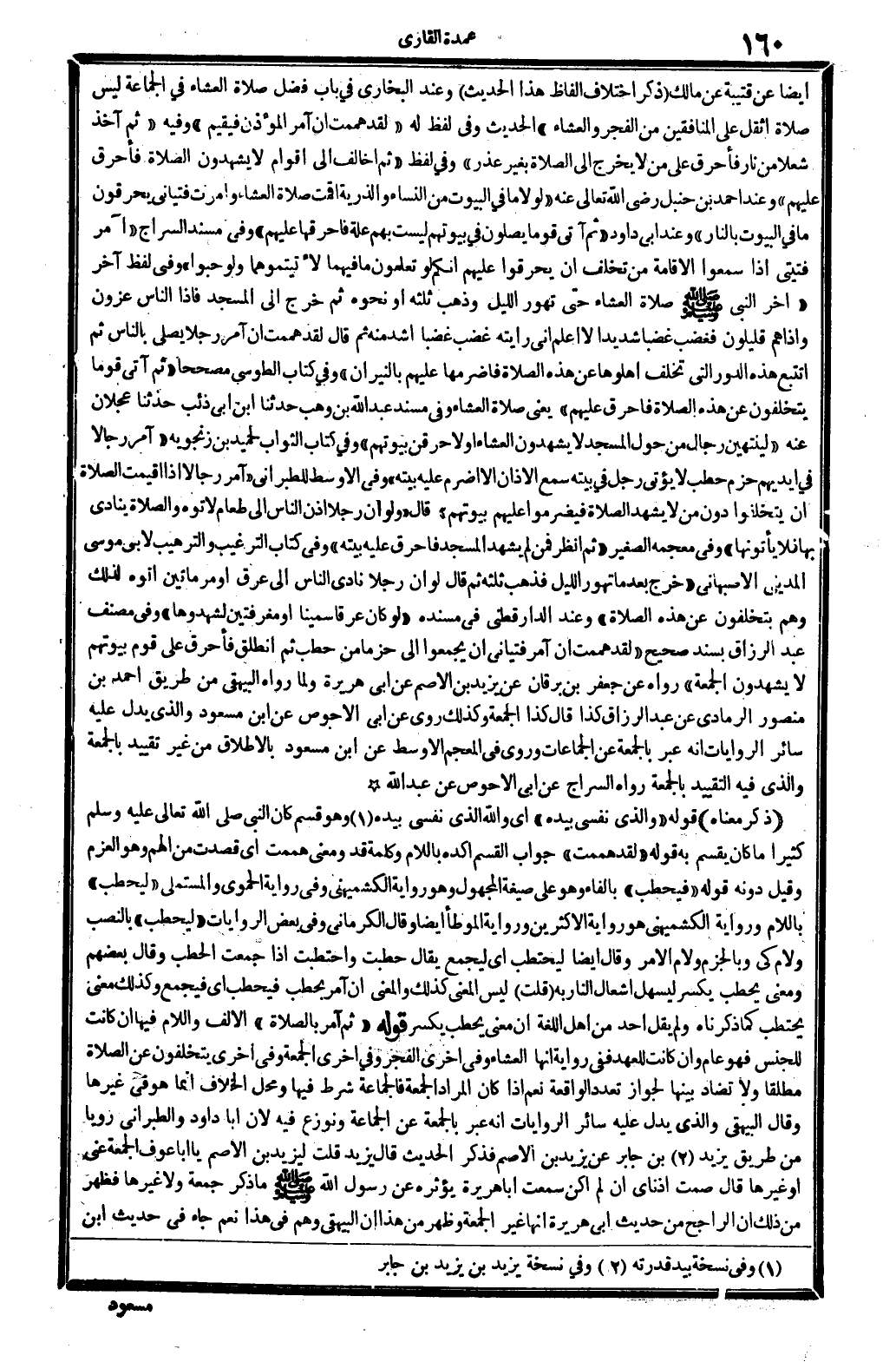 أَيْضا عَن قُتَيْبَة عَن مَالك. (ذكر اخْتِلَاف أَلْفَاظ هَذَا الحَدِيث) وَعند البُخَارِيّ فِي بَاب فضل صَلَاة الْعشَاء فِي الْجَمَاعَة لَيْسَ صَلَاة أثقل على الْمُنَافِقين من الْفجْر وَالْعشَاء " الحَدِيث وَفِي لفظ لَهُ " لقد هَمَمْت أَن آمُر الْمُؤَذّن فيقيم " وَفِيه " ثمَّ آخذ شعلا من نَار فَأحرق على من لَا يخرج إِلَى الصَّلَاة بِغَيْر عذر " وَفِي لفظ " ثمَّ أُخَالِف إِلَى أَقوام لَا يشْهدُونَ الصَّلَاة فَأحرق عَلَيْهِم " وَعند أَحْمد بن حَنْبَل رَضِي الله تَعَالَى عَنهُ " لَوْلَا مَا فِي الْبيُوت من النِّسَاء والذرية أَقمت صَلَاة الْعشَاء وَأمرت فتياني يحرقون مَا فِي الْبيُوت بالنَّار " وَعند أبي دَاوُد " ثمَّ آتِي قوما يصلونَ فِي بُيُوتهم لَيست بهم عِلّة فأحرقها عَلَيْهِم " وَفِي مُسْند السراج " آمُر فتيتي إِذا سمعُوا الْإِقَامَة من تخلف أَن يحرقوا عَلَيْهِم أَنكُمْ لَو تعلمُونَ مَا فيهمَا لأتيتموهما وَلَو حبوا " وَفِي لفظ آخر " أخر النَّبِي - صَلَّى اللَّهُ عَلَيْهِ وَسَلَّم َ - صَلَاة الْعشَاء حَتَّى تهور اللَّيْل وَذهب ثلثه أَو نَحوه ثمَّ خرج إِلَى الْمَسْجِد فَإِذا النَّاس عزون وَإِذا هم قَلِيلُونَ فَغَضب غَضبا شَدِيدا لَا أعلم أَنِّي رَأَيْته غضب غَضبا أَشد مِنْهُ ثمَّ قَالَ لقد هَمَمْت أَن آمُر رجلا يُصَلِّي بِالنَّاسِ ثمَّ أتتبع هَذِه الدّور الَّتِي تخلف أهلوها عَن هَذِه الصَّلَاة فأضرمها عَلَيْهِم بالنيران " وَفِي كتاب الطوسي مصححا " ثمَّ آتِي قوما يتخلفون عَن هَذِه الصَّلَاة فَأحرق عَلَيْهِم " يَعْنِي صَلَاة الْعشَاء وَفِي مُسْند عبد الله بن وهب حَدثنَا ابْن أبي ذِئْب حَدثنَا عجلَان عَنهُ " لينتهين رجال من حول الْمَسْجِد لَا يشْهدُونَ الْعشَاء أَو لأحرقن بُيُوتهم " وَفِي كتاب الثَّوَاب لحميد بن زَنْجوَيْه " آمُر رجَالًا فِي أَيْديهم حزم حطب لَا يُؤْتى رجل فِي بَيته سمع الْأَذَان إِلَّا أضرم عَلَيْهِ بَيته " وَفِي الْأَوْسَط للطبراني " آمُر رجَالًا إِذا أُقِيمَت الصَّلَاة أَن يتخلفوا دون من لَا يشْهد الصَّلَاة فيضرموا عَلَيْهِم بُيُوتهم " قَالَ " وَلَو أَن رجلا أذن النَّاس إِلَى طَعَام لأتوه وَالصَّلَاة يُنَادى بهَا فَلَا يأتونها " وَفِي مُعْجمَة الصَّغِير " ثمَّ أنظر فَمن لم يشْهد الْمَسْجِد فَأحرق عَلَيْهِ بَيته " وَفِي كتاب التَّرْغِيب والترهيب لأبي مُوسَى الْمَدِينِيّ الْأَصْبَهَانِيّ " خرج بَعْدَمَا تهور اللَّيْل فَذهب ثلثه ثمَّ قَالَ لَو أَن رجلا نَادَى النَّاس إِلَى عرق أَو مرماتين أَتَوْهُ لذَلِك وهم يتخلفون عَن هَذِه الصَّلَاة " وَعند الدَّارَقُطْنِيّ فِي مُسْنده " لَو كَانَ عرقا سمينا أَو مغرفتين لشهدوها " وَفِي مُصَنف عبد الرَّزَّاق بِسَنَد صَحِيح " لقد هَمَمْت أَن آمُر فتياني أَن يجمعوا إِلَيّ حزما من حطب ثمَّ أَنطلق فَأحرق على قوم بُيُوتهم لَا يشْهدُونَ الْجُمُعَة " رَوَاهُ عَن جَعْفَر بن برْقَان عَن يزِيد بن الْأَصَم عَن أبي هُرَيْرَة وَلما رَوَاهُ الْبَيْهَقِيّ من طَرِيق أَحْمد بن مَنْصُور الرَّمَادِي عَن عبد الرَّزَّاق كَذَا قَالَ كَذَا الْجُمُعَة وَكَذَلِكَ رُوِيَ عَن أبي الْأَحْوَص عَن ابْن مَسْعُود وَالَّذِي يدل عَلَيْهِ سَائِر الرِّوَايَات أَنه عبر بِالْجمعَةِ عَن الْجَمَاعَات وَرُوِيَ فِي المعجم الْأَوْسَط عَن ابْن مَسْعُود بِالْإِطْلَاقِ من غير تَقْيِيد بِالْجمعَةِ وَالَّذِي فِيهِ التَّقْيِيد بِالْجمعَةِ رَوَاهُ السراج عَن أبي الْأَحْوَص عَن عبد الله (ذكر مَعْنَاهُ) قَوْله " وَالَّذِي نَفسِي بِيَدِهِ " أَي وَالله الَّذِي نَفسِي بِيَدِهِ وَهُوَ قسم كَانَ النَّبِي - صَلَّى اللَّهُ عَلَيْهِ وَسَلَّم َ - كثيرا مَا كَانَ يقسم بِهِ قَوْله " لقد هَمَمْت " جَوَاب الْقسم أكده بِاللَّامِ وَكلمَة قد وَمعنى هَمَمْت أَي قصدت من الْهم وَهُوَ الْعَزْم وَقيل دونه قَوْله " فيحطب " بِالْفَاءِ وَهُوَ على صِيغَة 