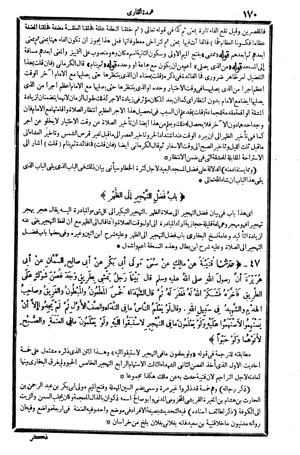 652 - ح دَّثنا قُتَيْبَةُ عنْ مالكٍ عنْ سُمَيّ مَوْلَى أبي بَكْرٍ عنْ أبي صالْحٍ السَّمَّانِ عنْ أبي هُرَيْرَةَ أنَّ رسْولَ الله صلى الله عَلَيْهِ وَسلم قَالَ بَيْنَمَا رَجُلٌ يَمْشِي بِطَرِيقٍ وَجَدَ غُصْنَ شَوْكٍ عَلى الطَّرِيقِ فَأَخَّرَهُ فَشَكَرَ الله لَهُ فَغَفَرَ لَهُ. ثمَّ قَالَ الشُّهَدَاءُ خَمْسٌ المَطْعُونُ والمَبْطُونُ والغَرِيقُ وصَاحِبُ الهدْمِ والشَّهِيدُ فِي سبِيلِ الله. وَقَالَ لَوْ يَعْلَمُ االنَّاسُ مَا فِي النِّدَاءِ والصَّفِّ الأَوَّلِ ثُمَّ لَمْ يَجِدُوا إلاَّ أنْ يَسْتَهِمُوا لاَسْتَهَمُوا عَلَيْهِ. وَلَوْ يَعْلَمُون مَا فِي التَّهْجِيرِ لاسْتَبَقُوا إلَيْهِ. ولَوْ يَعْلَمُونَ مَا فِي العَتَمَةِ والصُّبْحِ لأتَوْهُمَا حَبْوا.