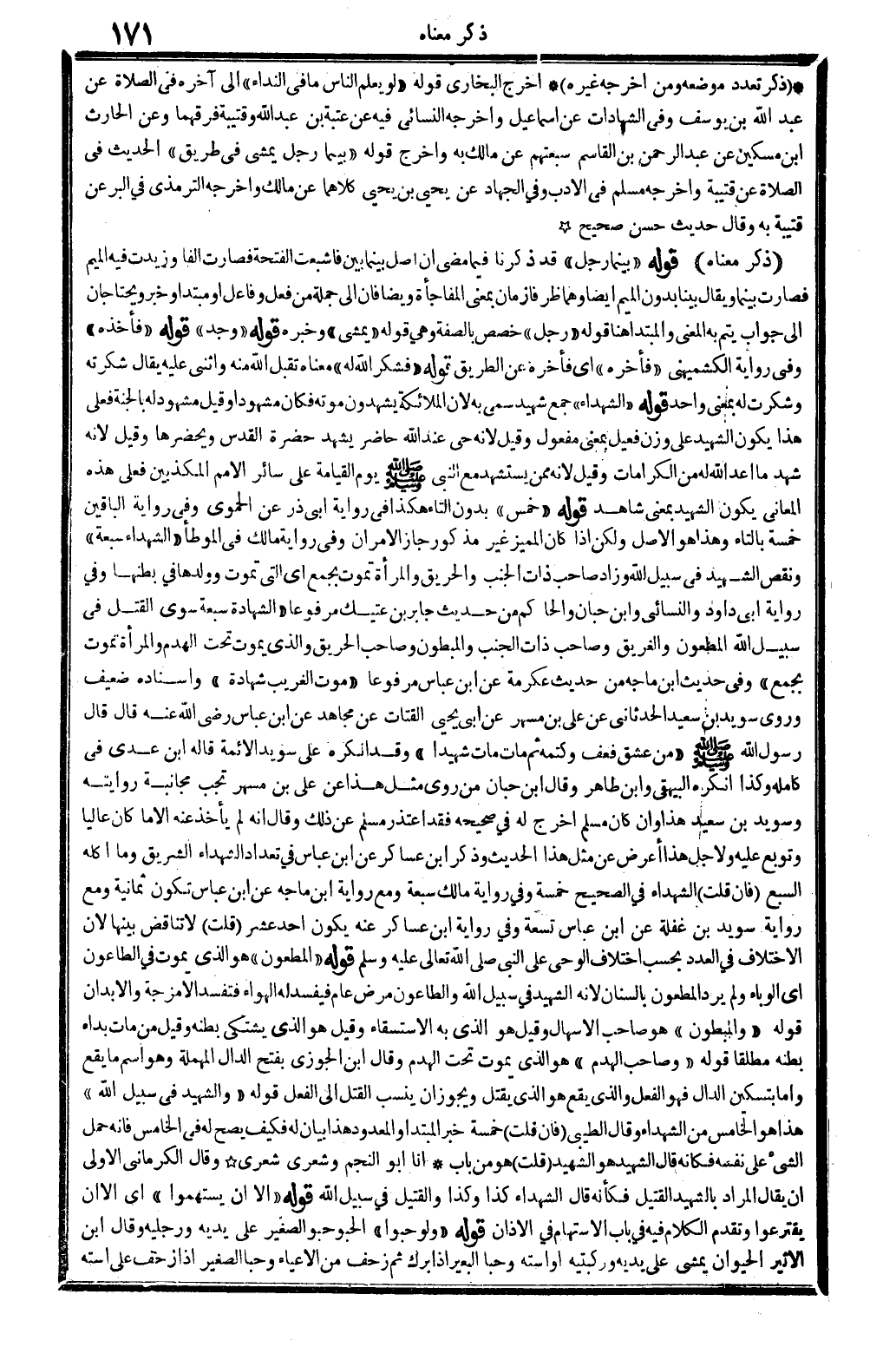 ذكر مَعْنَاهُ: قَوْله: (بَيْنَمَا رجل) ، قد ذكرنَا فِيمَا مضى أَن أصل: بَيْنَمَا، بَين، فاشبعت الفتحة فَصَارَت ألفا، وزيدت فِيهِ الْمِيم، فَصَارَت: بَيْنَمَا. وَيُقَال: بَينا، بِدُونِ الْمِيم، أَيْضا، وهما ظرفا زمَان بِمَعْنى المفاجأة، ويضافان إِلَى جملَة من فعل وفاعل ومبتدأ وَخبر، ويحتاجان إِلَى جَوَاب يتم بِهِ الْمَعْنى، والمبتدأ هُنَا قَوْله: (رجل) خصص بِالصّفةِ وَهِي قَوْله: (يمشي) وَخَبره قَوْله (وجد) قَوْله (فَأَخذه) وَفِي رِوَايَة الْكشميهني (فَأَخَّرَهُ) عَن طَرِيق قَوْله (فَشكر الله لَهُ) ، مَعْنَاهُ: تقبل الله مِنْهُ وَأثْنى عَلَيْهِ، يُقَال: شكرته وشكرت لَهُ بِمَعْنى وَاحِد. قَوْله: (الشُّهَدَاء) جمع: شَهِيد، سمي بِهِ لِأَن الْمَلَائِكَة يشْهدُونَ مَوته، فَكَانَ مشهودا. وَقيل: مشهود لَهُ بِالْجنَّةِ، فعلى هَذَا يكون الشَّهِيد على وزن: فعيل، بِمَعْنى: مفعول، وَقيل: لِأَنَّهُ حَيّ عِنْد الله حَاضر يشْهد حَضْرَة الْقُدس ويحضرها، وَقيل: لِأَنَّهُ شهد مَا أعد الله لَهُ من الكرامات. وَقيل: لِأَنَّهُ مِمَّن يستشهد مَعَ النَّبِي صلى الله عَلَيْهِ وَسلم يَوْم الْقِيَامَة على سَائِر الْأُمَم المكذبين، فعلى هَذِه الْمعَانِي يكون: الشَّهِيد، بِمَعْنى: شَاهد. قَوْله: (خمس) ، بِدُونِ التَّاء، هَكَذَا فِي رِوَايَة أبي ذَر عَن الْحَمَوِيّ، وَفِي رِوَايَة البَاقِينَ: خَمْسَة، بِالتَّاءِ، وَهَذَا هُوَ الأَصْل. وَلَكِن إِذا كَانَ الْمُمَيز غير مَذْكُور جَازَ الْأَمْرَانِ، وَفِي رِوَايَة مَالك فِي (الْمُوَطَّأ) : (الشُّهَدَاء سَبْعَة) ، وَنقص: الشَّهِيد فِي سَبِيل الله، وَزَاد: صَاحب ذَات الْجنب والحريق، وَالْمَرْأَة تَمُوت بِجمع، أَي: الَّتِي تَمُوت وَوَلدهَا فِي بَطنهَا. وَفِي رِوَايَة أبي دَاوُد وَالنَّسَائِيّ وَابْن حبَان وَالْحَاكِم، من حَدِيث جَابر بن عتِيك مَرْفُوعا: (الشَّهَادَة سَبْعَة سوى الْقَتْل فِي سَبِيل الله: المطعون والغريق وَصَاحب الْجنب والمبطون وَصَاحب الْحَرِيق وَالَّذِي يَمُوت تَحت الْهدم وَالْمَرْأَة تَمُوت بِجمع) . وَفِي حَدِيث ابْن مَاجَه، من حَدِيث عِكْرِمَة عَن ابْن عَبَّاس مَرْفُوعا: (موت الْغَرِيب شَهَادَة) ، وَإِسْنَاده ضَعِيف. وروى سُوَيْد بن سعيد الحدثاني عَن عَليّ بن مسْهر عَن أبي يحيى القَتَّات، عَن مُجَاهِد عَن ابْن عَبَّاس، رَضِي الله تَعَالَى عَنهُ قَالَ: قَالَ رَسُول الله صلى الله عَلَيْهِ وَسلم: (من عشق فعف وكتمه ثمَّ مَاتَ مَاتَ شَهِيدا) . وَقد أنكرهُ على سُوَيْد الْأَئِمَّة، قَالَه ابْن عدي فِي كَامِله، وَكَذَا أنكرهُ الْبَيْهَقِيّ وَابْن طَاهِر، وَقَالَ ابْن حبَان: من روى مثل هَذَا عَن عَليّ بن مسْهر تجب مجانبة رِوَايَته، وسُويد بن سعيد هَذَا وَإِن كَانَ مُسلم أخرج لَهُ فِي صَحِيحه فقد اعتذر مُسلم عَن ذَلِك، وَقَالَ: إِنَّه لم يَأْخُذ عَنهُ إلاَّ مَا كَانَ عَالِيا وتوبع عَلَيْهِ، وَلأَجل هَذَا أعرض عَن مثل هَذَا الحَدِيث، وَذكر ابْن عَسَاكِر عَن ابْن عَبَّاس فِي تعداد الشُّهَدَاء: الشريق وَمَا أكله السَّبع. فَإِن قلت: الشُّهَدَاء فِي الصَّحِيح: خَمْسَة، وَفِي رِوَايَة مَالك: سَبْعَة، وَمَعَ رِوَايَة ابْن مَاجَه عَن ابْن عَبَّاس تكون: ثَمَانِيَة، وَمَعَ رِوَايَة سُوَيْد بن غَفلَة عَن بن عَبَّاس: تِسْعَة، وَفِي رِوَايَة ابْن عَسَاكِر عَنهُ يكون أحد عشر؟ قلت: لَا تنَاقض بَينهَا لِأَن الِاخْتِلَاف فِي الْعدَد بِحَسب اخْتِلَاف الْوَحْي على النَّبِي، صلى الله عَلَيْهِ وَسلم، قَوْله: (المطعون) : هُوَ، الَّذِي يَمُوت فِي الطَّاعُون، أَي: الوباء، وَلم يرد المطعون بِالسِّنَانِ، لِأَنَّهُ الشَّهِيد فِي سَبِيل الله، والطاعون مرض عَام فَيفْسد لَهُ الْهَوَاء فتفسد الأمزجة والأبدان. قَوْله: (والمبطون) ، هُوَ صَاحب الإسهال، وَقيل: هُوَ الَّذِي بِهِ الاسْتِسْقَاء، وَقيل: هُوَ الَّذِي يشتكي بَطْنه. وَقيل: من 