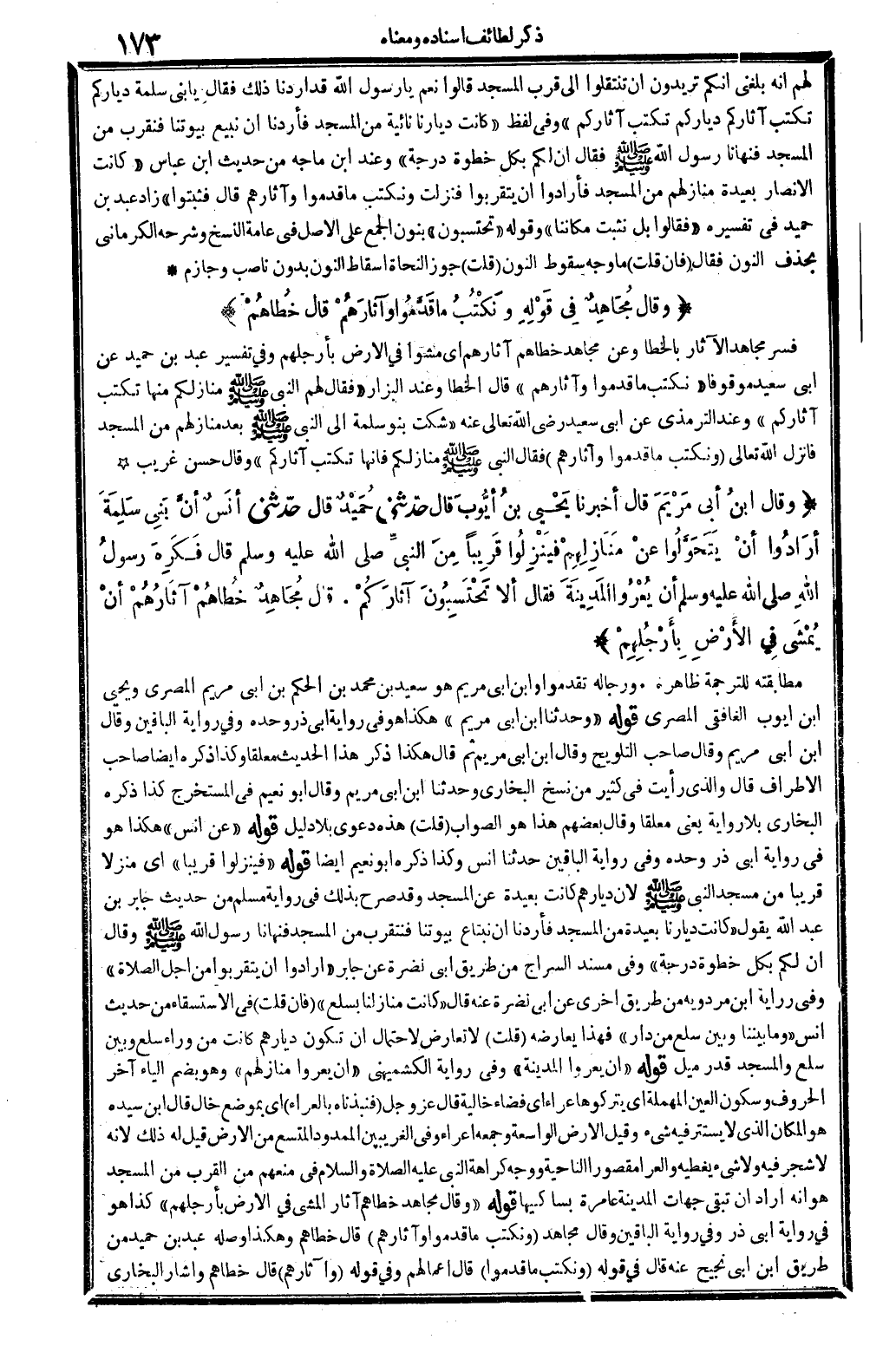 (وَقَالَ ابْن أبي مَرْيَم قَالَ أخبرنَا يحيى بن أَيُّوب قَالَ حَدثنِي حميد قَالَ حَدثنِي أنس أَن بني سَلمَة أَرَادوا أَن يَتَحَوَّلُوا عَن مَنَازِلهمْ فينزلوا قَرِيبا من النَّبِي - صَلَّى اللَّهُ عَلَيْهِ وَسَلَّم َ - قَالَ فكره رَسُول الله - صَلَّى اللَّهُ عَلَيْهِ وَسَلَّم َ - أَن يعروا الْمَدِينَة فَقَالَ أَلا تحتسبون آثَاركُم. قَالَ مُجَاهِد خطاهم آثَارهم أَن يمشى فِي الأَرْض بأرجلهم) مطابقته للتَّرْجَمَة ظَاهِرَة. وَرِجَاله تقدمُوا وَابْن أبي مَرْيَم هُوَ سعيد بن مُحَمَّد بن الحكم بن أبي مَرْيَم الْمصْرِيّ وَيحيى بن أَيُّوب الغافقي الْمصْرِيّ قَوْله " وَحدثنَا ابْن أبي مَرْيَم " هَكَذَا هُوَ فِي رِوَايَة أبي ذَر وَحده وَفِي رِوَايَة البَاقِينَ وَقَالَ ابْن أبي مَرْيَم وَقَالَ صَاحب التَّلْوِيح وَقَالَ ابْن أبي مَرْيَم ثمَّ قَالَ هَكَذَا ذكر هَذَا الحَدِيث مُعَلّقا وَكَذَا ذكره أَيْضا صَاحب الْأَطْرَاف قَالَ وَالَّذِي رَأَيْت فِي كثير من نسخ البُخَارِيّ وَحدثنَا ابْن أبي مَرْيَم وَقَالَ أَبُو نعيم فِي الْمُسْتَخْرج كَذَا ذكره البُخَارِيّ بِلَا رِوَايَة يَعْنِي مُعَلّقا وَقَالَ بَعضهم هَذَا هُوَ الصَّوَاب (قلت) هَذِه دَعْوَى بِلَا دَلِيل قَوْله " عَن أنس " هَكَذَا هُوَ فِي رِوَايَة أبي ذَر وَحده وَفِي رِوَايَة البَاقِينَ حَدثنَا أنس وَكَذَا ذكره أَبُو نعيم أَيْضا قَوْله " فينزلوا قَرِيبا " أَي منزلا قَرِيبا من مَسْجِد النَّبِي - صَلَّى اللَّهُ عَلَيْهِ وَسَلَّم َ - لِأَن دِيَارهمْ كَانَت بعيدَة عَن الْمَسْجِد وَقد صرح بذلك فِي رِوَايَة مُسلم من حَدِيث جَابر بن عبد الله يَقُول " كَانَت دِيَارنَا بعيدَة من الْمَسْجِد فأردنا أَن نبتاع بُيُوتنَا فنتقرب من الْمَسْجِد فنهانا رَسُول الله - صَلَّى اللَّهُ عَلَيْهِ وَسَلَّم َ - وَقَالَ إِن لكم بِكُل خطْوَة دَرَجَة " وَفِي مُسْند السراج من طَرِيق أبي نَضرة عَن جَابر " أَرَادوا أَن يتقربوا من أجل الصَّلَاة " وَفِي رِوَايَة ابْن مرْدَوَيْه من طَرِيق أُخْرَى عَن أبي نَضرة عَنهُ قَالَ " كَانَت مَنَازلنَا بسلع " (فَإِن قلت) فِي الاسْتِسْقَاء من حَدِيث أنس " وَمَا بَيْننَا وَبَين سلع من دَار " فَهَذَا يُعَارضهُ (قلت) لَا تعَارض لاحْتِمَال أَن تكون دِيَارهمْ كَانَت من وَرَاء سلع وَبَين سلع وَالْمَسْجِد قدر ميل قَوْله " أَن يعروا الْمَدِينَة " وَفِي رِوَايَة الْكشميهني " أَن يعروا مَنَازِلهمْ " وَهُوَ بِضَم الْيَاء آخر الْحُرُوف وَسُكُون الْعين الْمُهْملَة أَي يتركوها عراء أَي فضاء خَالِيَة قَالَ عز وَجل {فنبذناه بالعراء} أَي بِموضع خَال قَالَ ابْن سَيّده هُوَ الْمَكَان الَّذِي لَا يسْتَتر فِيهِ شَيْء وَقيل الأَرْض الواسعة وَجمعه أعراء وَفِي الغريبين الْمَمْدُود المتسع من الأَرْض قيل لَهُ ذَلِك لِأَنَّهُ لَا شجر فِيهِ وَلَا شَيْء يغطيه والعرا مَقْصُورا النَّاحِيَة وَوجه كَرَاهَة النَّبِي - صَلَّى اللَّهُ عَلَيْهِ وَسَلَّم َ - فِي مَنعهم من الْقرب من الْمَسْجِد هُوَ أَنه أَرَادَ أَن تبقى جِهَات الْمَدِينَة عامرة بساكنيها قَوْله " وَقَالَ مُجَاهِد خطاهم آثَار الْمَشْي فِي الأَرْض بأرجلهم " كَذَا هُوَ فِي رِوَايَة أبي ذَر وَفِي رِوَايَة البَاقِينَ وَقَالَ مُجَاهِد {ونكتب مَا قدمُوا وآثارهم} قَالَ خطاهم وَهَكَذَا وَصله عبد بن حميد من طَرِيق ابْن أبي نجيح عَنهُ قَالَ فِي قَوْله {ونكتب مَا قدمُوا} قَالَ أَعْمَالهم وَفِي قَوْله {وآثارهم} قَالَ خطاهم وَأَشَارَ البُخَارِيّ