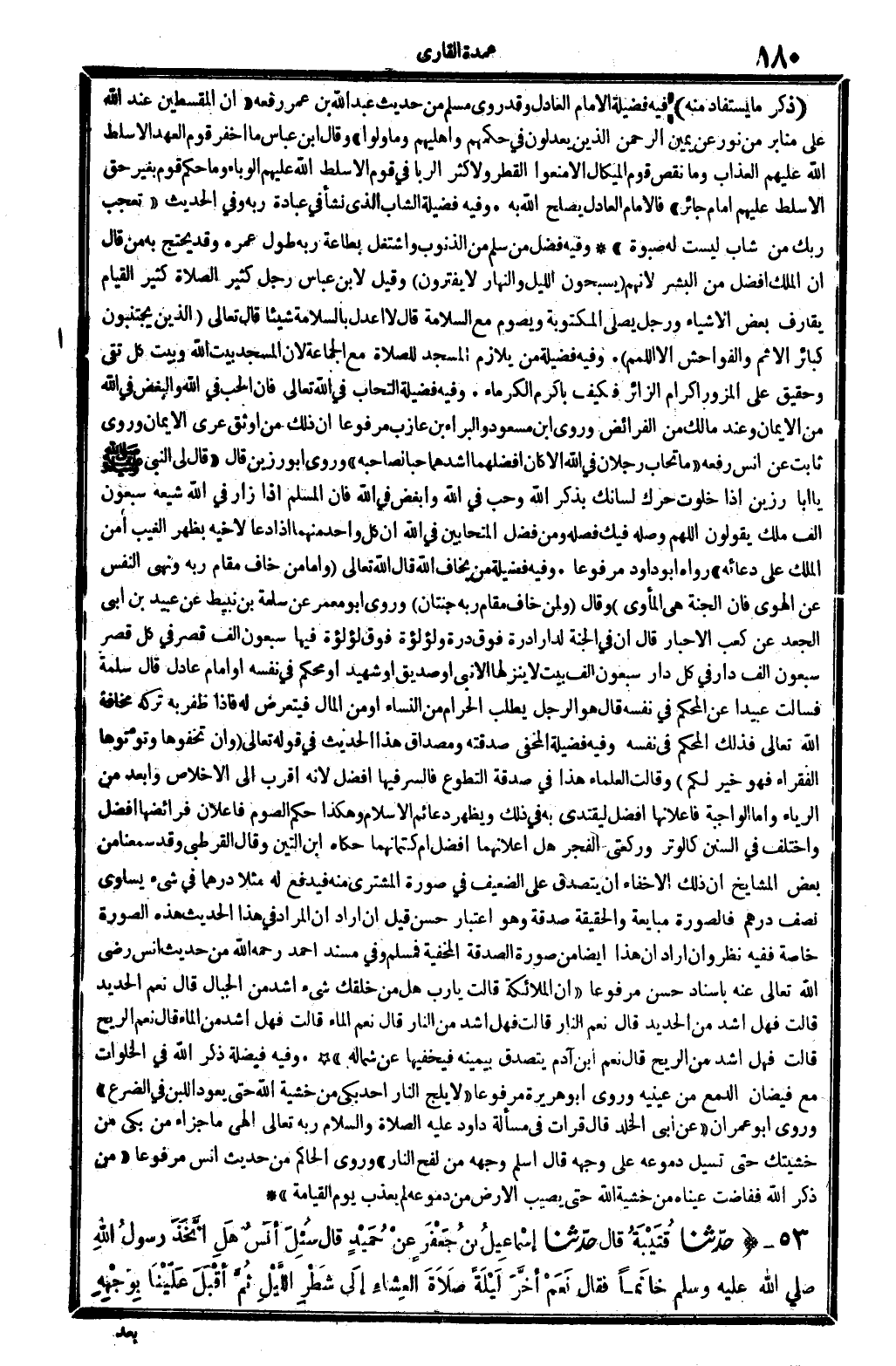 ذكر مَا يُسْتَفَاد مِنْهُ فِيهِ: فَضِيلَة الإِمَام الْعَادِل، وَقد روى مُسلم من حَدِيث عبد الله بن عمر رَفعه: (إِن المقسطين عِنْد الله على مَنَابِر من نور عَن يَمِين الرَّحْمَن الَّذين يعدلُونَ فِي حكمهم وأهليهم وَمَا ولوا) ، وَقَالَ ابْن عَبَّاس: مَا أَخْفَر قوم الْعَهْد إلاَّ سلط الله عَلَيْهِم الْعَذَاب، وَمَا نقص قوم الميكال إلاَّ منعُوا الْقطر، وَلَا كثر الرب فِي قوم إلاَّ سلط الله عَلَيْهِم الوباء، وَمَا حكم قوم بِغَيْر حق إلاَّ سلط عَلَيْهِم إِمَام جَائِر) . فالإمام الْعَادِل يصلح الله بِهِ. وَفِيه: فَضِيلَة الشَّاب الَّذِي نَشأ فِي عبَادَة ربه، وَفِي الحَدِيث: (تعجب رَبك من شَاب لَيست لَهُ ضبوة) . وَفِيه: فضل من سلم من الذُّنُوب واشتغل بِطَاعَة ربه طول عمره، وَقد يحْتَج بِهِ من قَالَ: إِن الْملك أفضل من الْبشر لأَنهم: {يسبحون اللَّيْل وَالنَّهَار لَا يفترون} (الْأَنْبِيَاء: 20) . وَقيل لِابْنِ عَبَّاس: رجل كثير الصَّلَاة كثير الْقيام يقارف بعض الْأَشْيَاء، وَرجل يُصَلِّي الْمَكْتُوبَة ويصوم مَعَ السَّلامَة. قَالَ: لَا أعدل بالسلامة شَيْئا، قَالَ تَعَالَى: {وَالَّذين يجتنبون كَبَائِر الْإِثْم وَالْفَوَاحِش إلاَّ اللمم} (النَّجْم: 32) . وَفِيه: فَضِيلَة من يلازم الْمَسْجِد للصَّلَاة مَعَ الْجَمَاعَة، لِأَن الْمَسْجِد بَيت الله وَبَيت كل تَقِيّ، وحقيق على المزور إكرام الزائر، فَكيف بأكرام الكرماء؟ وَفِيه: فَضِيلَة التحاب فِي الله تَعَالَى، فَإِن الْحبّ فِي الله والبغض فِي الله من الْإِيمَان، وَعند مَالك من الْفَرَائِض، وروى ابْن مَسْعُود والبراء بن عَازِب مَرْفُوعا: إِن ذَلِك من أوثق عرى الْإِيمَان، وروى ثَابت عَن أنس رَفعه: (مَا تحاب رجلَانِ فِي الله إلاَّ كَانَ أفضلهما أشدهما حبا لصَاحبه) ، وروى أَبُو رزين، قَالَ: (قَالَ لي النَّبِي صلى الله عَلَيْهِ وَسلم: يَا أَبَا رزين إِذا خلوت حرك لسَانك بِذكر الله، وَحب فِي الله وَأبْغض فِي الله، فَإِن الْمُسلم إِذا زار فِي الله شيعه سَبْعُونَ ألف ملك يَقُولُونَ: أللهم وَصله فِيك فَصله وَمن فضل المتحابين فِي الله أَن كل وَاحِد مِنْهُمَا إِذا دَعَا لِأَخِيهِ بِظهْر الْغَيْب أَمن الْملك على دُعَائِهِ) . رَوَاهُ أَبُو دَاوُد مَرْفُوعا. وَفِيه: فَضِيلَة من يخَاف الله قَالَ الله تَعَالَى: {وَأما من خَافَ مقَام ربه وَنهى النَّفس عَن الْهوى فَإِن الْجنَّة هِيَ المأوى} (النازعات: 40، 41) . وَقَالَ: {وَلمن خَافَ مقَام ربه جنتان} (الرَّحْمَن: 46) . وروى أَبُو معمر عَن سَلمَة بن نبيط عَن عبيد بن أبي الْجَعْد عَن كَعْب الْأَحْبَار، قَالَ: إِن فِي الْجنَّة، لدارا، درة فَوق درة، ولؤلؤة فَوق لؤلؤة، فِيهَا سَبْعُونَ ألف قصر، فِي كل قصر سَبْعُونَ ألف دَار، فِي كل دَار سَبْعُونَ ألف بَيت، لَا ينزلها إلاَّ نَبِي أَو صديق أَو شَهِيد أَو مُحكم فِي نَفسه أَو إِمَام عَادل. قَالَ سَلمَة: فَسَأَلت عبيدا عَن: الْمُحكم فِي نَفسه: قَالَ: هُوَ الرجل يطْلب الْحَرَام من النِّسَاء أَو من المَال فيتعرض لَهُ، فَإِذا ظفر بِهِ تَركه مَخَافَة الله تَعَالَى، فَذَلِك الْمُحكم فِي نَفسه. وَفِيه: فَضِيلَة المخفي صدقته ومصداق هَذَا الحَدِيث فِي قَوْله تَعَالَى: {وَإِن تخفوها وتؤتوها الْفُقَرَاء فَهُوَ خير لكم} (الْبَقَرَة: 271) . وَقَالَت الْعلمَاء: هَذَا فِي صَدَقَة التَّطَوُّع، فالسر فِيهَا أفضل لِأَنَّهُ أقرب إِلَى الْإِخْلَاص، وَأبْعد من الرِّيَاء. وَأما الوجبة فإعلانها أفضل ليقتدي بِهِ فِي ذَلِك. وَيظْهر دعائم الْإِسْلَام، وَهَكَذَا حكم الصَّوْم فإعلان فرائضها أفضل. وَاخْتلف فِي السّنَن: كالوتر وركعتي الْفجْر، هَل إعلانهما أفضل أم كتمانهما؟ حَكَاهُ ابْن التِّين، وَقَالَ الْقُرْطُبِيّ: وَقد سمعنَا من بعض الْمَشَايِخ: إِن ذَلِك الْإخْفَاء أَن يتَصَدَّق على الضَّعِيف فِي صُورَة الْمُشْتَرى مِنْهُ، فيدفه لَهُ مثلا درهما فِي شَيْء يُسَاوِي