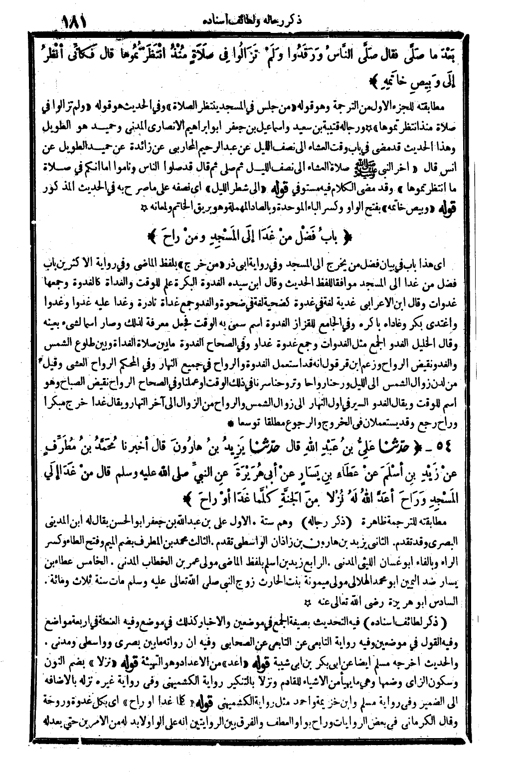 ذكر لطائف إِسْنَاده فِيهِ: التحديث بِصِيغَة الْجمع فِي موضِعين، والإخبار كَذَلِك فِي مَوضِع. وَفِيه: العنعنة فِي أَرْبَعَة مَوَاضِع. وَفِيه: القَوْل فِي موضِعين. وَفِيه: رِوَايَة التَّابِعِيّ عَن التَّابِعِيّ عَن الصَّحَابِيّ. وَفِيه: أَن رُوَاته مَا بَين بَصرِي وواسطي ومدني.