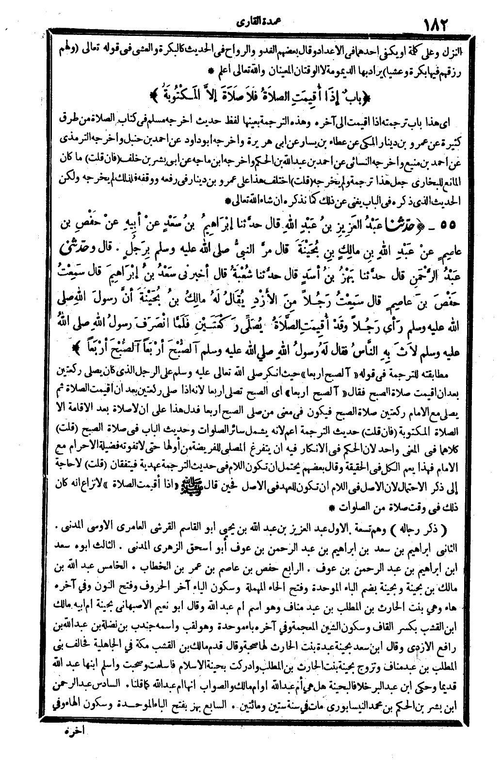 55 - (حَدثنَا عبد الْعَزِيز بن عبد الله قَالَ حَدثنَا إِبْرَاهِيم بن سعد عَن أَبِيه عَن حَفْص بن عَاصِم عَن عبد الله بن مَالك بن بُحَيْنَة قَالَ مر النَّبِي - صَلَّى اللَّهُ عَلَيْهِ وَسَلَّم َ - بِرَجُل. قَالَ وحَدثني عبد الرَّحْمَن قَالَ حَدثنَا بهز بن أَسد قَالَ حَدثنَا شُعْبَة قَالَ أَخْبرنِي سعد بن إِبْرَاهِيم قَالَ سَمِعت حَفْص بن عَاصِم قَالَ سَمِعت رجلا من الأزد يُقَال لَهُ مَالك بن بُحَيْنَة أَن رَسُول الله - صَلَّى اللَّهُ عَلَيْهِ وَسَلَّم َ - رأى رجلا وَقد أُقِيمَت الصَّلَاة يُصَلِّي رَكْعَتَيْنِ فَلَمَّا انْصَرف رَسُول الله - صَلَّى اللَّهُ عَلَيْهِ وَسَلَّم َ - لاث بِهِ النَّاس فَقَالَ لَهُ رَسُول الله - صَلَّى اللَّهُ عَلَيْهِ وَسَلَّم َ - آلصبح أَرْبعا آلصبح أَرْبعا) مطابقته للتَّرْجَمَة فِي قَوْله " آلصبح أَرْبعا " حَيْثُ أنكر - صَلَّى اللَّهُ عَلَيْهِ وَسَلَّم َ - على الرجل الَّذِي كَانَ يُصَلِّي رَكْعَتَيْنِ بعد أَن أُقِيمَت صَلَاة الصُّبْح فَقَالَ " آلصبح أَرْبعا " أَي الصُّبْح تصلى أَرْبعا لِأَنَّهُ إِذا صلى رَكْعَتَيْنِ بعد أَن أُقِيمَت الصَّلَاة ثمَّ يُصَلِّي مَعَ الإِمَام رَكْعَتَيْنِ صَلَاة الصُّبْح فَيكون فِي معنى من صلى الصُّبْح أَرْبعا فَدلَّ هَذَا على أَن لَا صَلَاة بعد الْإِقَامَة إِلَّا الصَّلَاة الْمَكْتُوبَة (فَإِن قلت) حَدِيث التَّرْجَمَة أَعم لِأَنَّهُ يَشْمَل سَائِر الصَّلَوَات وَحَدِيث الْبَاب فِي صَلَاة الصُّبْح (قلت) كِلَاهُمَا فِي الْمَعْنى وَاحِد لِأَن الحكم فِي الْإِنْكَار فِيهِ أَن يتفرغ الْمُصَلِّي للفريضة من أَولهَا حَتَّى لَا تفوته فَضِيلَة الْإِحْرَام مَعَ الإِمَام فَهَذَا يعم الْكل فِي الْحَقِيقَة وَقَالَ بَعضهم يحْتَمل أَن تكون اللَّام فِي حَدِيث التَّرْجَمَة عهدية فيتفقان (قلت) لَا حَاجَة إِلَى ذكر الِاحْتِمَال لِأَن الأَصْل فِي اللَّام أَن تكون للْعهد فِي الأَصْل فحين قَالَ - صَلَّى اللَّهُ عَلَيْهِ وَسَلَّم َ - " إِذا أُقِيمَت الصَّلَاة " لَا نزاع أَنه كَانَ ذَلِك فِي وَقت صَلَاة من الصَّلَوَات (ذكر رِجَاله) وهم تِسْعَة. الأول عبد الْعَزِيز بن عبد الله بن يحيى أَبُو الْقَاسِم الْقرشِي العامري الأوسي الْمدنِي. الثَّانِي إِبْرَاهِيم بن سعد بن إِبْرَاهِيم بن عبد الرَّحْمَن بن عَوْف أَبُو اسحق الزُّهْرِيّ الْمدنِي. الثَّالِث أَبوهُ سعد بن إِبْرَاهِيم بن عبد الرَّحْمَن بن عَوْف. الرَّابِع حَفْص بن عَاصِم بن عمر بن الْخطاب. الْخَامِس عبد الله بن مَالك بن بُحَيْنَة وبحينة بِضَم الْبَاء الْمُوَحدَة وَفتح الْحَاء الْمُهْملَة وَسُكُون الْيَاء آخر الْحُرُوف وَفتح النُّون وَفِي آخِره هَاء وَهِي بنت الْحَارِث بن عبد الْمطلب بن عبد منَاف وَهُوَ اسْم أم عبد الله وَقَالَ أَبُو نعيم الْأَصْفَهَانِي بُحَيْنَة أم أَبِيه مَالك ابْن القشب بِكَسْر الْقَاف وَسُكُون الشين الْمُعْجَمَة وَفِي آخِره بَاء مُوَحدَة وَهُوَ لقب واسْمه جُنْدُب بن نَضْلَة بن عبد الله بن رَافع الْأَزْدِيّ وَقَالَ ابْن سعد بُحَيْنَة عَبدة بنت الْحَارِث لَهَا صُحْبَة وَقَالَ قدم مَالك بن القشب مَكَّة فِي الْجَاهِلِيَّة فحالف بني الْمطلب بن عبد منَاف وَتزَوج بُحَيْنَة بنت الْحَارِث بن الْمطلب وَأدْركت بُحَيْنَة الْإِسْلَام فَأسْلمت وصحبت وَأسلم ابْنهَا عبد الله قَدِيما وَحكى ابْن عبد الْبر خلافًا لبحينة هَل هِيَ أم عبد الله أَو أم مَالك وَالصَّوَاب أَنَّهَا أم عبد الله كَمَا قُلْنَا. السَّادِس عبد الرَّحْمَن بن بشر بن الحكم بن مُحَمَّد النَّيْسَابُورِي مَاتَ فِي سنة سِتِّينَ وَمِائَتَيْنِ. السَّابِع بهز بِفَتْح الْبَاء الْمُوَحدَة وَسُكُون الْهَاء وَفِي
