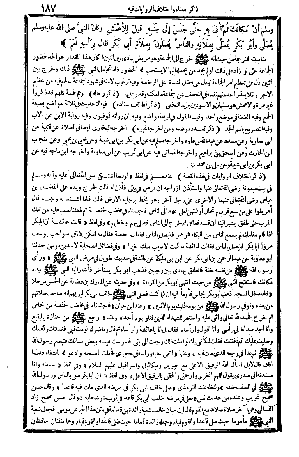 ذكر اخْتِلَاف الرِّوَايَات فِي هَذِه الْقِصَّة: عِنْد مُسلم فِي لفظ: (أول مَا اشْتَكَى، صلى الله عَلَيْهِ وَسلم، فِي بَيت مَيْمُونَة، رَضِي الله تَعَالَى عَنْهَا، وَاسْتَأْذَنَ أَزوَاجه أَن يمرض فِي بَيْتِي فأذنَّ لَهُ. قَالَت: فَخرج وَيَده على الْفضل بن عَبَّاس، رَضِي الله تَعَالَى عَنْهُمَا، وَالْأُخْرَى على رجل آخر، وَهُوَ يخط برجليه فِي الأَرْض. قَالَت: فَلَمَّا اشْتَدَّ بِهِ وَجَعه قَالَ: أهريقوا عَليّ من سبع قرب لم تحلل أوكيتهن لعَلي أَعهد إِلَى النَّاس، فأجلسناه فِي مخضب لحفصة، ثمَّ طفقنا نصب عَلَيْهِ من تِلْكَ الْقرب حَتَّى طفق يُشِير إِلَيْنَا أَن قد فعلتن. ثمَّ خرج إِلَى النَّاس فصلى بهم وخطبهم) (قَالَت عَائِشَة: إِن أَبَا بكر إِذا قَامَ مقامك لم يُسمع النَّاس من الْبكاء، فَمر عمر فليصلِّ بِالنَّاسِ. فَفعلت حَفْصَة، فَقَالَ: مَه، إنكن لأنتن صَوَاحِب يُوسُف، مروا أَبَا بكر فليصلِّ بِالنَّاسِ. فَقَالَت لعَائِشَة: مَا كنت لأصيب مِنْك خيرا) وَفِي (فَضَائِل الصَّحَابَة) لأسد بن مُوسَى: حَدثنَا أَبُو مُعَاوِيَة عَن عبد الرَّحْمَن بن أبي بكر عَن ابْن أبي مليكَة عَن عَائِشَة فِي حَدِيث طَوِيل فِي مرض النَّبِي صلى الله عَلَيْهِ وَسلم: (وَرَأى رَسُول الله صلى الله عَلَيْهِ وَسلم من نَفسه خفَّة، فَانْطَلق يهادي بَين رجلَيْنِ، فَذهب أَبُو بكر يسْتَأْخر فَأَشَارَ إِلَيْهِ النَّبِي صلى الله عَلَيْهِ وَسلم بِيَدِهِ: مَكَانك، فَاسْتَفْتَحَ النَّبِي صلى الله عَلَيْهِ وَسلم من حَيْثُ انْتهى أَبُو بكر من الْقِرَاءَة) ، وَفِي حَدِيثه عَن الْمُبَارك بن فضَالة عَن الْحسن مُرْسلا: (فَلَمَّا دخل الْمَسْجِد ذهب أَبُو بكر يجلس، فَأَوْمأ إِلَيْهِ، أَن: كَمَا كنت، فصلى النَّبِي صلى الله عَلَيْهِ وَسلم خلف أبي بكر لِيُرِيَهُمْ أَنه صَاحب صلَاتهم من بعده، وَتُوفِّي رَسُول الله صلى الله عَلَيْهِ وَسلم من يَوْمه ذَلِك يَوْم الِاثْنَيْنِ) . وَعند ابْن حبَان: (فأجلسناه فِي مخضب لحفصة من نُحَاس، ثمَّ خرج فَحَمدَ الله تَعَالَى وَأثْنى عَلَيْهِ واستغفر للشهداء الَّذين قتلوا يَوْم أحد) ، وعنها: (رَجَعَ صلى الله عَلَيْهِ وَسلم من جَنَازَة بِالبَقِيعِ وَأَنا أجد صداعا فِي رَأْسِي، وَأَنا أَقُول: وَا رأساه، فَقَالَ: بل أَنا يَا عَائِشَة وارأساه. ثمَّ قَالَ: وَمَا ضرك لَو مت قبلي فغسلتك وكفنتك وَصليت عَلَيْك ثمَّ دفنتك؟ فَقلت: لكَأَنِّي بك لَو فعلت ذَلِك رجعت إِلَى بَيْتِي فأعرست فِيهِ بِبَعْض نِسَائِك، فَتَبَسَّمَ رَسُول الله صلى الله عَلَيْهِ وَسلم، ثمَّ بدا فِي وَجَعه الَّذِي مَاتَ فِيهِ) . وعنها: (أُغمي عَلَيْهِ وَرَأسه فِي حجري، فَجعلت أمسحه وأدعو لَهُ بالشفاء، فَلَمَّا أَفَاق قَالَ: لَا، بل اسْأَل الله الرفيق الْأَعْلَى مَعَ جِبْرِيل وَمِيكَائِيل وإسرافيل عَلَيْهِم السَّلَام) . وَفِي لفظ: (سمعته، وَأَنا مسندته إِلَى صَدْرِي يَقُول: اللَّهُمَّ اغْفِر لي وارحمني وألحقني بالرفيق الْأَعْلَى) . وَفِي لفظ: (إِن أَبَا بكر صلى بِالنَّاسِ وَرَسُول الله صلى الله عَلَيْهِ وَسلم فِي الصَّفّ خَلفه) . وَلَفظه: عِنْد التِّرْمِذِيّ: (صلى خلف أبي بكر فِي مَرضه الَّذِي مَاتَ فِيهِ قَاعِدا) . وَقَالَ: حسن صَحِيح غَرِيب، وَعِنْده من حَدِيث أنس: (صلى فِي مَرضه خلف أبي بكر قَاعِدا فِي ثوب متوشحا بِهِ) . وَقَالَ: حسن صَحِيح. زَاد النَّسَائِيّ: وَهِي آخر صَلَاة صلاهَا مَعَ الْقَوْم. قَالَ ابْن حبَان: خَالف شُعْبَة زَائِدَة بن قدامَة فِي متن هَذَا الْخَبَر عَن مُوسَى، فَجعل شُعْبَة النَّبِي صلى الله عَلَيْهِ وَسلم مَأْمُوما حَيْثُ صلى قَاعِدا، وَالْقَوْم قيام، وَجعله زَائِدَة إِمَامًا حَيْثُ صلى قَاعِدا وَالْقَوْم قيام، وهما متقنان حَافِظَانِ