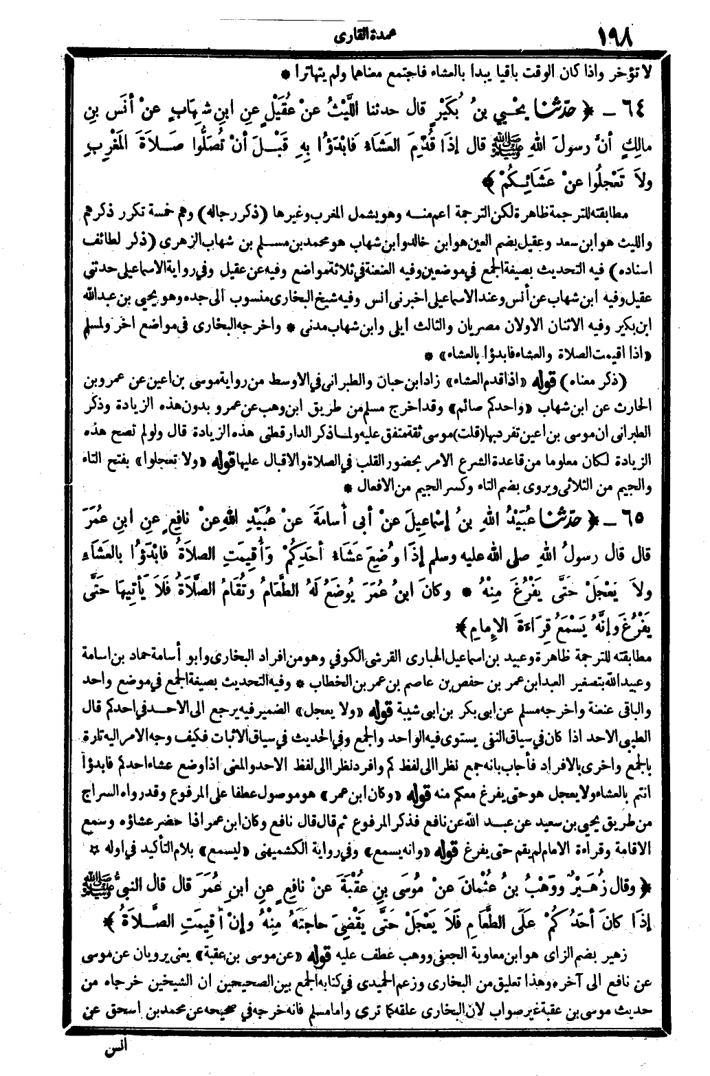 673 - حدَّثنا عُبَيْدُ الله بنُ إسْمَاعِيلَ عَنْ أبِي أُسَامَةَ عنْ عُبَيْدِ الله عنْ نافِعٍ عنِ ابنِ عُمَرَ قَالَ قَالَ رسولْ الله صلى الله عَلَيْهِ وَسلم إذَا وُضِعَ عَشَاءُ أحَدِكُمْ وأُقِيمَتِ الصَّلاةُ فابْدَؤا بالعَشَاءِ ولاَ يَعْجَلْ حَتَّى يَفْرَغَ مِنْهُ. وكانَ ابنُ عُمَرَ يُوضَعُ لَهُ الطَّعَامُ وتُقَامُ الصَّلاَةُ فَلاَ يَأتِيهَا حَتَّى يَفْرَغَ وإنَّهُ يَسْمَعُ قِرَاءَةَ الإمَام.
