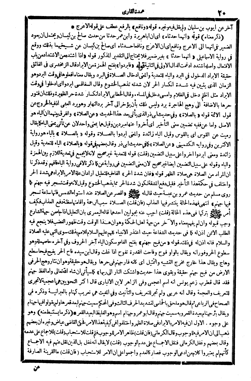 آخر عَن أَيُّوب بن سُلَيْمَان وَلم يقل فِيهِ وَغَيره قَوْله " وَنَافِع " بِالرَّفْع عطف على قَوْله الْأَعْرَج (ذكر مَعْنَاهُ) قَوْله " أَنَّهُمَا حَدَّثَاهُ " أَي أَن أَبَا هُرَيْرَة وَابْن عمر حَدثا من حدث صَالح بن كيسَان وَيحْتَمل أَن يعود الضَّمِير فِي أَنَّهُمَا إِلَى الْأَعْرَج وَنَافِع أَي أَن الْأَعْرَج ونافعا حَدَّثَاهُ أَي صَالح بن كيسَان عَن شيخيهما بذلك وَوَقع فِي رِوَايَة الْإِسْمَاعِيلِيّ " أَنَّهُمَا حَدثا " بِغَيْر ضمير فَلَا يحْتَاج إِلَى التَّقْدِير الْمَذْكُور قَوْله " إِذا اشْتَدَّ " من الاشتداد من بَاب الافتعال وَأَصله اشتدد أدغمت الدَّال الأولى فِي الثَّانِيَة قَوْله " فأبردوا " بِفَتْح الْهمزَة من الْإِبْرَاد قَالَ الزَّمَخْشَرِيّ فِي الْفَائِق حَقِيقَة الْإِبْرَاد الدُّخُول فِي الْبرد وَالْبَاء للتعدية وَالْمعْنَى إِدْخَال الصَّلَاة فِي الْبرد وَيُقَال مَعْنَاهُ افعلوها فِي وَقت الْبرد وَهُوَ الزَّمَان الَّذِي يتَبَيَّن فِيهِ شدَّة انكسار الْحر لِأَن شدته تذْهب الْخُشُوع وَقَالَ السفاقسي أبردوا أَي ادخُلُوا فِي وَقت الْإِبْرَاد مثل أظلم دخل فِي الظلام وَأمسى دخل فِي الْمسَاء. وَقَالَ الْخطابِيّ الْإِبْرَاد انكسار شدَّة حر الظهيرة وَذَلِكَ أَن فتور حرهَا بِالْإِضَافَة إِلَى وهج الهاجرة برد وَلَيْسَ ذَلِك بِأَن يُؤَخر إِلَى آخر برد النَّهَار وَهُوَ برد العشى إِذْ فِيهِ الْخُرُوج عَن قَول الْأَئِمَّة قَوْله " بِالصَّلَاةِ " وَفِي حَدِيث أبي ذَر الَّذِي يَأْتِي بعد هَذَا الحَدِيث " عَن الصَّلَاة " وَالْفرق بَينهمَا أَن الْبَاء هُوَ الأَصْل وَأما عَن فَفِيهِ تضمين معنى التَّأْخِير أَي أخروا عَنْهَا مبردين وَقيل هما بِمَعْنى وَاحِد لِأَن عَن تَأتي بِمَعْنى الْبَاء كَمَا يُقَال رميت عَن الْقوس أَي بِالْقَوْسِ وَقيل الْبَاء زَائِدَة وَالْمعْنَى أبردوا بِالصَّلَاةِ وَقَوله " بِالصَّلَاةِ " بِالْبَاء هُوَ رِوَايَة الْأَكْثَرين وَفِي رِوَايَة الْكشميهني " عَن الصَّلَاة " كَمَا فِي حَدِيث أبي ذَر وَقَالَ بَعضهم فِي قَوْله " بِالصَّلَاةِ " الْبَاء للتعدية وَقيل زَائِدَة وَمعنى أبردوا أخروا على سَبِيل التَّضْمِين (قلت) قَوْله للتعدية غير صَحِيح لِأَنَّهُ لَا يجمع فِي تَعديَة اللَّازِم بَين الْهمزَة وَالْبَاء وَقَوله على سَبِيل التَّضْمِين أَيْضا غير صَحِيح لِأَن معنى التَّضْمِين فِي رِوَايَة عَن كَمَا ذكرنَا لَا فِي رِوَايَة الْبَاء فَافْهَم وَقد ذكرنَا أَن المُرَاد من الصَّلَاة هِيَ صَلَاة الظّهْر قَوْله " فَإِن شدَّة الْحر " الْفَاء فِيهِ للتَّعْلِيل أَرَادَ أَن عِلّة الْأَمر بالإبراد هِيَ شدَّة الْحر وَاخْتلف فِي حِكْمَة هَذَا التَّأْخِير فَقيل دفع الْمَشَقَّة لكَون شدَّة الْحر مِمَّا يذهب الْخُشُوع وَقيل لِأَنَّهُ وَقت تسجر فِيهِ جَهَنَّم كَمَا روى مُسلم من حَدِيث عَمْرو بن عبسة حَيْثُ قَالَ لَهُ - صَلَّى اللَّهُ عَلَيْهِ وَسَلَّم َ - " اقصر عَن الصَّلَاة عِنْد اسْتِوَاء الشَّمْس فَإِنَّهَا سَاعَة تسجر فِيهَا جَهَنَّم " انْتهى فَهَذِهِ الْحَالة ينتشر فِيهَا الْعَذَاب (فَإِن قلت) الصَّلَاة سَبَب الرَّحْمَة وإقامتها مَظَنَّة دفع الْعَذَاب فَكيف أَمر - صَلَّى اللَّهُ عَلَيْهِ وَسَلَّم َ - بِتَرْكِهَا فِي هَذِه الْحَالة (قلت) أُجِيب عَنهُ بجوابين أَحدهمَا قَالَه الْيَعْمرِي بِأَن التَّعْلِيل إِذا جَاءَ من جِهَة الشَّارِع وَجب قبُوله وَإِن لم يفهم مَعْنَاهُ وَالْآخر من جِهَة أهل الْحِكْمَة وَهُوَ أَن هَذَا الْوَقْت وَقت ظُهُور الْغَضَب فَلَا ينجع فِيهِ الطّلب إِلَّا مِمَّن أذن لَهُ كَمَا فِي حَدِيث الشَّفَاعَة حَيْثُ اعتذر الْأَنْبِيَاء كلهم عَلَيْهِم السَّلَام للأمم بذلك سوى النَّبِي - صَلَّى اللَّهُ عَلَيْهِ وَسَلَّم َ - فَإِنَّهُ أذن لَهُ فِي ذَلِك. قَوْله " من فيح جَهَنَّم " بِفَتْح الْفَاء وَ