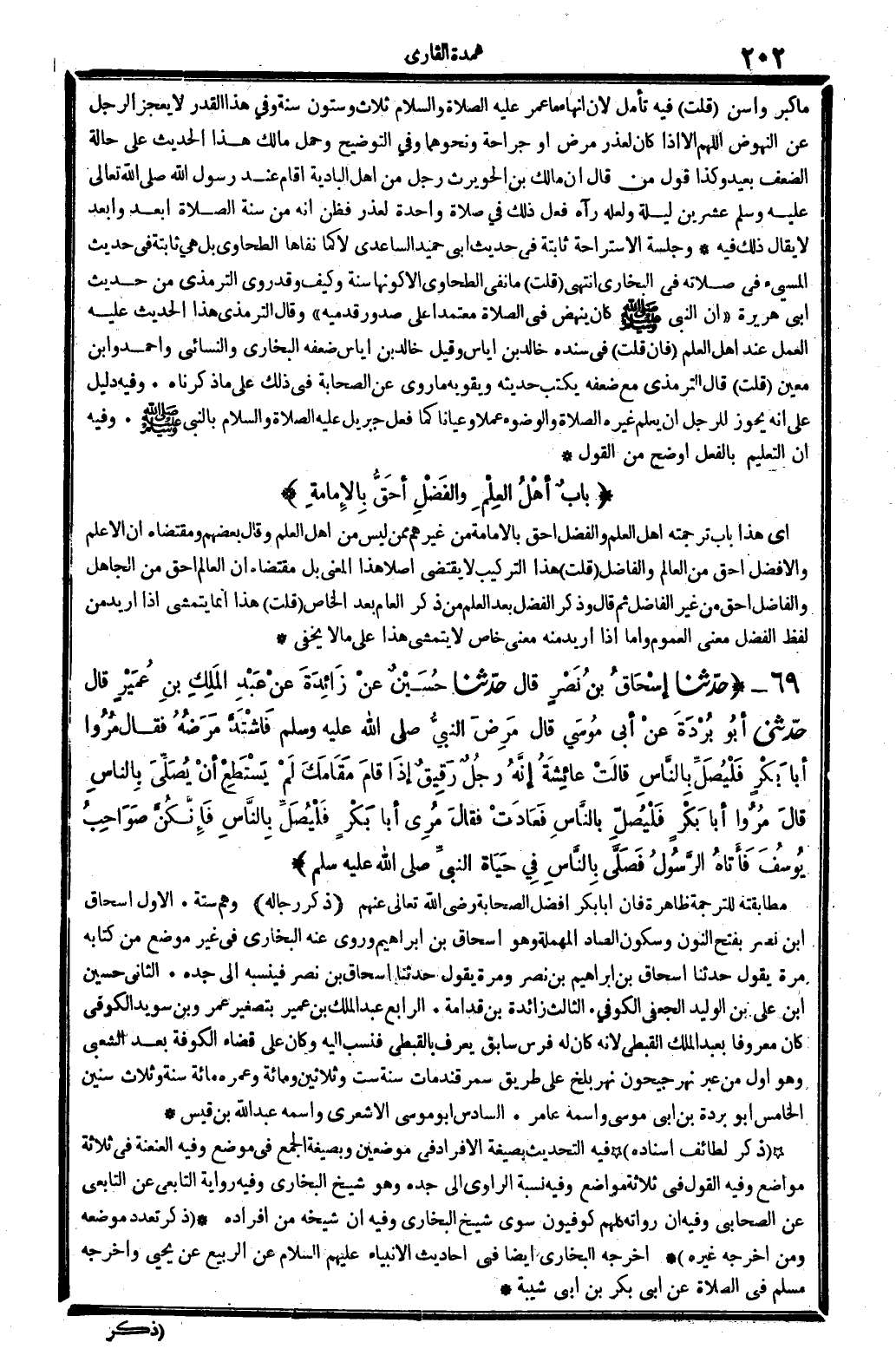 ذكر رِجَاله: وهم سِتَّة: الأول: إِسْحَاق ابْن نصر، بِفَتْح النُّون وَسُكُون الصَّاد الْمُهْملَة: وَهُوَ إِسْحَاق بن إِبْرَاهِيم، وروى عَنهُ البُخَارِيّ فِي غير مَوضِع من كِتَابه، مرّة يَقُول: حَدثنَا إِسْحَاق بن إِبْرَاهِيم بن نصر، وَمرَّة يَقُول: حَدثنَا إِسْحَاق بن نصر، فينسبه إِلَى جده. الثَّانِي: حُسَيْن ابْن عَليّ بن الْوَلِيد الْجعْفِيّ الكُوفي. الثَّالِث: زَائِدَة بن قدامَة. الرَّابِع: عبد الْملك بن عُمَيْر بتصغير عمر وبن سُوَيْد الْكُوفِي كَانَ مَعْرُوفا: بِعَبْد الْملك القبطي، لِأَنَّهُ كَانَ لَهُ فرس سَابق يعرف بالقبطي، فنسب إِلَيْهِ. وَكَانَ على قَضَاء الْكُوفَة بعد الشّعبِيّ وَهُوَ أول من عبر نهر جيحون نهر بَلخ من طَرِيق سَمَرْقَنْد، مَاتَ سنة سِتّ وَثَلَاثِينَ وَمِائَة وعمره مائَة سنة وَثَلَاث سِنِين. الْخَامِس: أَبُو بردة بن أبي مُوسَى واسْمه: عَامر. السَّادِس: أَبُو مُوسَى الْأَشْعَرِيّ، واسْمه: عبد الله بن قيس.