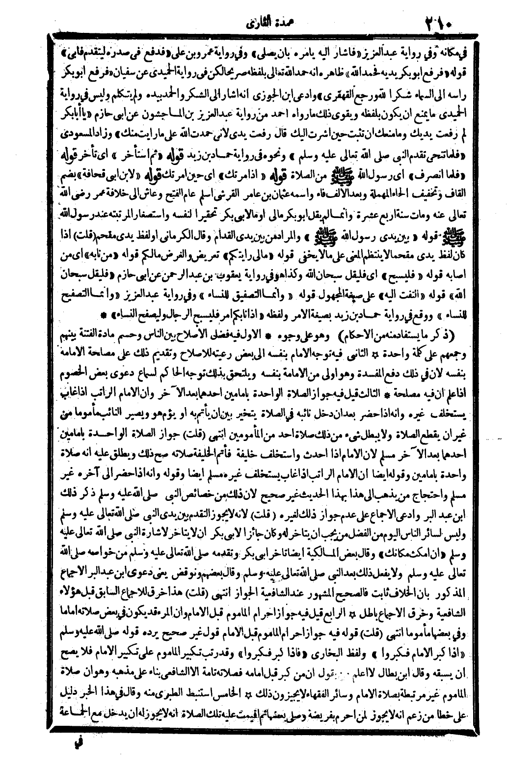 فِي مَكَانَهُ. وَفِي رِوَايَة عبد الْعَزِيز: (فَأَشَارَ إِلَيْهِ يَأْمُرهُ بِأَن يُصَلِّي) ، وَفِي رِوَايَة عَمْرو بن عَليّ: (فَدفع فِي صَدره لِيَتَقَدَّم فَأبى) . قَوْله: (فَرفع أَبُو بكر يَدَيْهِ فَحَمدَ الله) ظَاهره أَنه حمد الله تَعَالَى بِلَفْظِهِ صَرِيحًا، لَكِن فِي رِوَايَة الْحميدِي عَن سُفْيَان: (فَرفع أَبُو بكر رَأسه إِلَى السَّمَاء شكرا لله وَرجع الْقَهْقَرِي) ، وَادّعى ابْن الْجَوْزِيّ أَنه أَشَارَ إِلَى الشُّكْر وَالْحَمْد بِيَدِهِ وَلم يتَكَلَّم، وَلَيْسَ فِي رِوَايَة الْحميدِي مَا يمْنَع أَن يكون بِلَفْظِهِ، وَيُقَوِّي ذَلِك مَا رَوَاهُ أَحْمد من رِوَايَة عبد الْعَزِيز بن الْمَاجشون عَن أبي حَازِم: (يَا أَبَا بكر لم رفعت يَديك؟ وَمَا مَنعك أَن تثبت حِين أَشرت إِلَيْك؟ قَالَ: رفعت يَدي لِأَنِّي حمدت الله على مَا رَأَيْت مِنْك) . وَزَاد المَسْعُودِيّ: (فَلَمَّا تنحى تقدم النَّبِي، صلى الله عَلَيْهِ وَسلم) وَنَحْوه فِي رِوَايَة حَمَّاد بن زيد. قَوْله: (ثمَّ اسْتَأْخَرَ) أَي: تَأَخّر. قَوْله: (فَلَمَّا انْصَرف) أَي: رَسُول الله صلى الله عَلَيْهِ وَسلم من الصَّلَاة، قَوْله: (إِذْ أَمرتك) أَي: حِين أَمرتك. قَوْله: (لِابْنِ أبي قُحَافَة) بِضَم الْقَاف وَتَخْفِيف الْحَاء الْمُهْملَة وَبعد الْألف فَاء: واسْمه عُثْمَان بن عَامر الْقرشِي، أسلم عَام الْفَتْح، وعاش إِلَى خلَافَة عمر، رَضِي الله تَعَالَى عَنهُ، وَمَات سنة أَربع عشرَة، وَإِنَّمَا لم يقل أَبُو بكر: مَا لي، أَو: مَا لأبي بكر، تحقيرا لنَفسِهِ واستصغارا لمرتبته عِنْد رَسُول الله صلى الله عَلَيْهِ وَسلم. قَوْله: (بَين يَدي رَسُول الله صلى الله عَلَيْهِ وَسلم) وَالْمرَاد من بَين يَدي: القدام. وَقَالَ الْكرْمَانِي: أَو لفظ يَدي مقحم؟ قلت: إِذا كَانَ لفظ: يَدي مقحما لَا يَنْتَظِم الْمَعْنى على مَا لَا يخفى. قَوْله: (مَا لي رأيتكم) تَعْرِيض، وَالْغَرَض: مَا لكم. قَوْله: (من نابه) أَي: من أَصَابَهُ. قَوْله: (فليسبح) ، أَي: فَلْيقل: سُبْحَانَ الله، وَكَذَا هُوَ فِي رِوَايَة يَعْقُوب بن عبد الرَّحْمَن عَن أبي حَازِم، (فَلْيقل: سُبْحَانَ الله) . قَوْله: (الْتفت إِلَيْهِ) على صِيغَة الْمَجْهُول، قَوْله: (وَإِنَّمَا التصفيق للنِّسَاء) ، وَفِي رِوَايَة عبد الْعَزِيز: (وَإِنَّمَا التصفيح للنِّسَاء) . وَوَقع فِي رِوَايَة حَمَّاد بن زيد بِصِيغَة الْأَمر، وَلَفظه: (إِذا نابكم أَمر فليسبح الرِّجَال وليصفح النِّسَاء) .