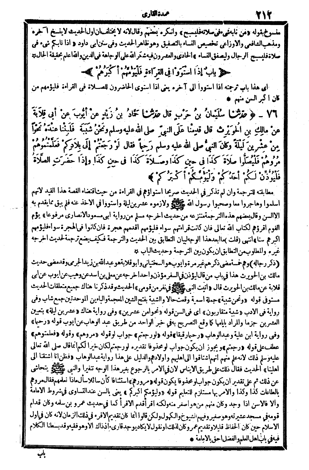 قَوْله: (وَنحن شببة) ، جملَة إسمية وَقعت حَالا، و: الشببة، بِفَتْح الشين الْمُعْجَمَة والباءين الموحدتين: جمع شَاب وَفِي رِوَايَة فِي الْأَدَب: (شببة متقاربون) ، أَي: فِي السن. قَوْله: (نَحوا من عشْرين) ، وَفِي رِوَايَة هُنَاكَ: (عشْرين لَيْلَة) ، بِتَعْيِين الْعشْرين جزما، وَالْمرَاد بأيامها، كَمَا وَقع التَّصْرِيح بِهِ فِي خبر الْوَاحِد من طَرِيق عبد الْوَهَّاب: عَن أَيُّوب. قَوْله: (رحِيما) ، وَفِي رِوَايَة ابْن علية وَعبد الْوَهَّاب: (رحِيما رَقِيقا) . قَوْله: (لَو رجعتم) ، جَوَاب: لَو. قَوْله: (مُرُوهُمْ) ، وَقَوله: (فعلمتوهم) ، عطف على قَوْله: (رجعتم) ، وَيجوز أَن يكون جَوَاب: لَو، محذوفا تَقْدِيره: لَو رجعتم لَكَانَ خيرا لكا إِن 4 اقال، صلى الله عَلَيْهِ وَسلم، ذَلِك لِأَنَّهُ على مِنْهُم أَنهم اشتأقوا إِلَى أَهْليهمْ وأؤلادهم، وَالدَّلِيل على هَذَا رِوَايَة عبد الْوَهَّاب: (فَظن أَنا اشتقنا إِلَى أَهْلينَا) الحَدِيث. فَقَالَ ذَلِك على طَرِيق الإيناس، لِأَن فِي الْأَمر بِالرُّجُوعِ بِغَيْر هَذَا الْوَجْه تنفيرا، وَالنَّبِيّ صلى الله عَلَيْهِ وَسلم يتحاشى عَن ذَلِك، ثمَّ على تَقْدِير أَن يكون جَوَاب: لَو، محذوفا يكون قَوْله: (مُرُوهُمْ) استئنافا، كَأَن سَائِلًا سَأَلَ: مَاذَا نعلمهُمْ؟ فَقَالَ: مُرُوهُمْ بالطاعات كَذَا وَكَذَا، وَالْأَمر بهَا مُسْتَلْزم للتعليم. قَوْله: (وليؤمكم أكبركم) ، يَعْنِي: بِالسِّنِّ عِنْد التَّسَاوِي فِي شُرُوط الْإِمَامَة، وإلاّ فالأسن إِذا وجد وَكَانَ مِنْهُم من هُوَ أَصْغَر مِنْهُ وَلكنه أَقرَأ قدم الأقرأ، كَمَا فِي حَدِيث عَمْرو بن سَلمَة، وَكَانَ قد أم قومه فِي مَسْجِد عشيرته وَهُوَ صَغِير وَفِيهِمْ الشُّيُوخ والكهول، وَلَكِن قَالُوا: إِنَّمَا كَانَ تَقْدِيم الأقرأ فِي ذَلِك الزَّمَان لِأَن كَانَ فِي أول الْإِسْلَام حِين كَانَ الْحفاظ قَلِيلا، وَتَقْدِيم عَمْرو كَانَ لذَلِك، أَو نقُول: لَا يكَاد يُوجد قارىء، إِذْ ذَاك إلاّ وَهُوَ فَقِيه، وَقد بسطنا الْكَلَام فِيهِ فِي: بَاب أهل الْعلم وَالْفضل أَحَق بِالْإِمَامَةِ.