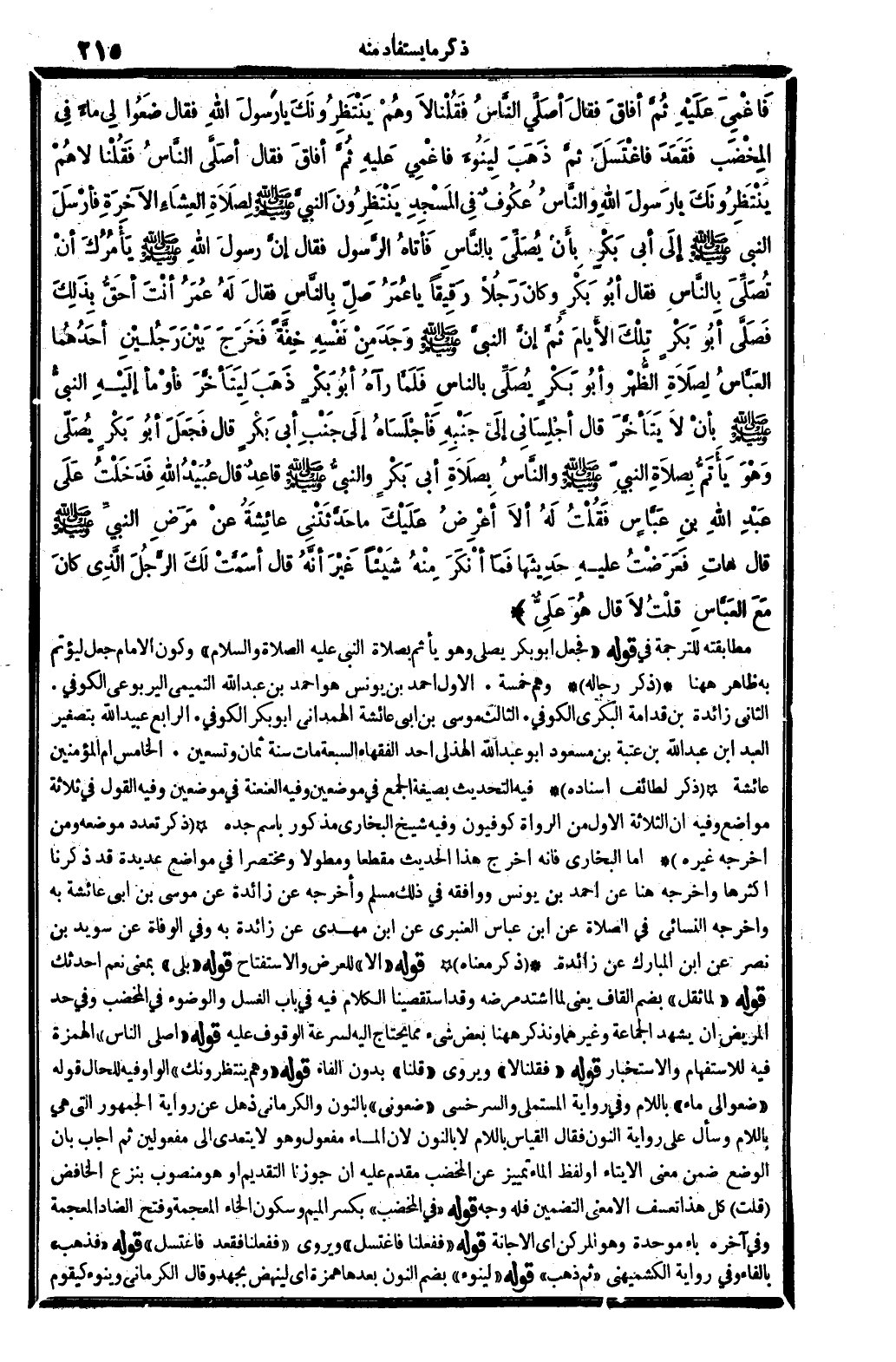 فَأُغْمِيَ عَلَيْهِ ثمَّ أَفَاق فَقَالَ أصلى النَّاس فَقُلْنَا لَا وهم ينتظرونك يَا رَسُول الله فَقَالَ ضَعُوا لي مَاء فِي المخضب فَقعدَ فاغتسل ثمَّ ذهب لينوء فَأُغْمِيَ عَلَيْهِ ثمَّ أَفَاق فَقَالَ أصلى النَّاس فَقُلْنَا لَا هم ينتظرونك يَا رَسُول الله وَالنَّاس عكوف فِي الْمَسْجِد ينتظرون النَّبِي - صَلَّى اللَّهُ عَلَيْهِ وَسَلَّم َ - لصَلَاة الْعشَاء الْآخِرَة فَأرْسل النَّبِي - صَلَّى اللَّهُ عَلَيْهِ وَسَلَّم َ - إِلَى أبي بكر بِأَن يُصَلِّي بِالنَّاسِ فَأَتَاهُ الرَّسُول فَقَالَ إِن رَسُول الله - صَلَّى اللَّهُ عَلَيْهِ وَسَلَّم َ - يَأْمُرك أَن تصلي بِالنَّاسِ فَقَالَ أَبُو بكر وَكَانَ رجلا رَقِيقا يَا عمر صل بِالنَّاسِ فَقَالَ لَهُ عمر أَنْت أَحَق بذلك فصلى أَبُو بكر تِلْكَ الْأَيَّام ثمَّ إِن النَّبِي - صَلَّى اللَّهُ عَلَيْهِ وَسَلَّم َ - وجد من نَفسه خفَّة فَخرج بَين رجلَيْنِ أَحدهمَا الْعَبَّاس لصَلَاة الظّهْر وَأَبُو بكر يُصَلِّي بِالنَّاسِ فَلَمَّا رَآهُ أَبُو بكر ذهب ليتأخر فَأَوْمأ إِلَيْهِ النَّبِي - صَلَّى اللَّهُ عَلَيْهِ وَسَلَّم َ - بِأَن لَا يتَأَخَّر قَالَ أجلساني إِلَى جنبه فأجلساه إِلَى جنب أبي بكر قَالَ فَجعل أَبُو بكر يُصَلِّي وَهُوَ يأتم بِصَلَاة النَّبِي - صَلَّى اللَّهُ عَلَيْهِ وَسَلَّم َ - وَالنَّاس بِصَلَاة أبي بكر وَالنَّبِيّ - صَلَّى اللَّهُ عَلَيْهِ وَسَلَّم َ - قَاعد قَالَ عبيد الله فَدخلت على عبد الله بن عَبَّاس فَقلت لَهُ أَلا أعرض عَلَيْك مَا حَدَّثتنِي عَائِشَة عَن مرض النَّبِي - صَلَّى اللَّهُ عَلَيْهِ وَسَلَّم َ - قَالَ هَات فعرضت عَلَيْهِ حَدِيثهَا فَمَا أنكر مِنْهُ شَيْئا غير أَنه قَالَ أسمعت لَك الرجل الَّذِي كَانَ مَعَ الْعَبَّاس قلت لَا قَالَ هُوَ عَليّ) مطابقته للتَّرْجَمَة فِي قَوْله " فَجعل أَبُو بكر يُصَلِّي وَهُوَ يأتم بِصَلَاة النَّبِي - صَلَّى اللَّهُ عَلَيْهِ وَسَلَّم َ - " وَكَون الإِمَام جعل ليؤتم بِهِ ظَاهر هَهُنَا. (ذكر رِجَاله) وهم خَمْسَة. الأول أَحْمد بن يُونُس هُوَ أَحْمد بن عبد الله التَّمِيمِي الْيَرْبُوعي الْكُوفِي. الثَّانِي زَائِدَة بن قدامَة الْبكْرِيّ الْكُوفِي. الثَّالِث مُوسَى بن أبي عَائِشَة الْهَمدَانِي أَبُو بكر الْكُوفِي. الرَّابِع عبيد الله بتصغير العَبْد ابْن عبد الله بن عتبَة بن مَسْعُود أَبُو عبد الله الْهُذلِيّ أحد الْفُقَهَاء السَّبْعَة مَاتَ سنة ثَمَان وَتِسْعين. الْخَامِس أم الْمُؤمنِينَ عَائِشَة. (ذكر لطائف إِسْنَاده) فِيهِ التحديث بِصِيغَة الْجمع فِي موضِعين وَفِيه العنعنة فِي موضِعين وَفِيه القَوْل فِي ثَلَاثَة مَوَاضِع وَفِيه أَن الثَّلَاثَة الأول من الروَاة كوفيون وَفِيه شيخ البُخَارِيّ مَذْكُور باسم جده. (ذكر تعدد مَوْضِعه وَمن أخرجه غَيره) أما البُخَارِيّ فَإِنَّهُ أخرجه هَذَا الحَدِيث مقطعا وَمُطَولًا ومختصرا فِي مَوَاضِع عديدة قد ذكرنَا أَكْثَرهَا وَأخرجه هُنَا عَن أَحْمد بن يُونُس وَوَافَقَهُ فِي ذَلِك مُسلم وَأخرجه عَن زَائِدَة عَن مُوسَى بن أبي عَائِشَة بِهِ وَأخرجه النَّسَائِيّ فِي الصَّلَاة عَن ابْن عَبَّاس الْعَنْبَري عَن ابْن مهْدي عَن زَائِدَة بِهِ وَفِي الْوَفَاة عَن سُوَيْد بن نصر عَن ابْن الْمُبَارك عَن زَائِدَة (ذكر مَعْنَاهُ) قَوْله " أَلا " للعرض والاستفتاح قَوْله " بلَى " بِمَعْنى نعم أحَدثك قَوْله " لما ثقل " بِضَم الْقَاف يَعْنِي لما اشْتَدَّ مَرضه وَقد استقصينا الْكَلَام فِيهِ فِي بَاب الْغسْل وَالْوُضُوء فِي المخضب وَفِي حد الْمَرِيض أَن يشْهد الْجَمَاعَة وَغَيرهمَا وَنَذْكُر هَهُنَا بعض شَيْء مِمَّا يحْتَاج إِلَيْهِ لسرعة الْوُقُوف عَلَيْهِ قَوْله " أصلى النَّاس " الْهمزَة فِيهِ للاستفهام والاستخبار قَوْله " فَقُلْنَا لَا " ويروى " قُلْنَا " بِدُونِ الْفَاء قَوْله " وهم ينتظرونك " الْوَاو فِيهِ للْحَال قَ