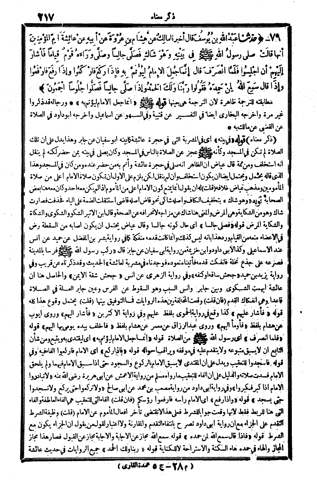 ذكر مَعْنَاهُ: قَوْله: (فِي بَيته) أَي: فِي الْمشْربَة الَّتِي فِي حجرَة عَائِشَة، كَمَا بَينه أَبُو سُفْيَان عَن جَابر، وَهَذَا يدل على أَن تِلْكَ الصَّلَاة لم تكن فِي الْمَسْجِد، وَكَأَنَّهُ صلى الله عَلَيْهِ وَسلم عجز عَن الصَّلَاة بِالنَّاسِ فِي الْمَسْجِد، وَكَانَ يُصَلِّي فِي بَيته بِمن حضر، لكنه لم ينْقل أَنه اسْتخْلف، وَمن ثمَّة قَالَ عِيَاض: إِنَّه الظَّاهِر أَنه صلى فِي حجرَة عَائِشَة وَأتم بِهِ من حضر عِنْده، وَمن كَانَ فِي الْمَسْجِد. وَهَذَا الَّذِي قَالَه يحْتَمل، وَيحْتَمل أَيْضا أَن يكون اسْتخْلف، وَإِن لم ينْقل. لَكِن يلْزم على الأول أَن تكون صَلَاة الإِمَام أَعلَى من صَلَاة الْمَأْمُومين، وَمذهب عِيَاض خِلَافه. قلت: لَهُ أَن يَقُول: إِنَّمَا يمْنَع كَون الإِمَام أَعلَى من الْمَأْمُوم، إِذا لم يكن مَعَه أحد، وَكَانَ مَعَه هُنَا بعض الصَّحَابَة. قَوْله: (وَهُوَ شَاك) ، بتَخْفِيف الْكَاف وَأَصله: شاكي. نَحْو: قاضٍ، وَأَصله قَاضِي، استثقلت الضمة على الْيَاء فحذفت فَصَارَت: شَاك، وَهُوَ: من الشكاية وَهِي: الْمَرَض، وَالْمعْنَى هُنَا: شَاك عَن مزاجه لانحرافه عَن الصِّحَّة. وَقَالَ ابْن الْأَثِير: الشكو والشكوى والشكاة والشكاية: الْمَرَض. قَوْله: (فصلى جَالِسا) أَي: حَال كَونه جَالِسا. وَقَالَ عِيَاض: يحْتَمل أَن يكون أَصَابَهُ من السقطة رض فِي الْأَعْضَاء مَنعه من الْقيام، ورد هَذَا بِأَنَّهُ لَيْسَ كَذَلِك، وَإِنَّمَا كَانَت قدمه منفكة، كَمَا فِي رِوَايَة بشر بن الْمفضل: عَن حميد عَن أنس عِنْد الْإِسْمَاعِيلِيّ، وَكَذَا لأبي دَاوُد وَابْن خُزَيْمَة من رِوَايَة أبي سُفْيَان عَن جَابر قَالَ: (ركب رَسُول لله صلى الله عَلَيْهِ وَسلم فرسا بِالْمَدِينَةِ فصرعه على جذع نَخْلَة فانفكت قدمه، فأتيناه نعوده فوجدناه فِي مشربَة لعَائِشَة. .) الحَدِيث، وَقد ذَكرْنَاهُ عَن قريب. وَفِي رِوَايَة يزِيد بن حميد: (جحش سَاقه أَو كتفه) ، وَفِي رِوَايَة الزُّهْرِيّ عَن أنس: (جحش شقَّه الْأَيْمن) ، وَالْحَاصِل هُنَا أَن عَائِشَة أبهمت الشكوى، وَبَين جَابر وَأنس السَّبَب وَهُوَ: السُّقُوط عَن الْفرس، وَعين جَابر الْعلَّة فِي الصَّلَاة قَاعِدا وَهِي انفكاك الْقدَم فَإِن قلت: وَقعت الْمُخَالفَة بَين هَذِه الرِّوَايَات فَمَا التَّوْفِيق بَينهَا؟ قلت: يحْتَمل وُقُوع هَذَا كُله قَوْله: (فَأَشَارَ عَلَيْهِم) ، كَذَا وَقع فِي رِوَايَة الْحَمَوِيّ بِلَفْظ: عَلَيْهِم، وَفِي رِوَايَة الْأَكْثَرين: (فَأَشَارَ إِلَيْهِم) ، وروى أَيُّوب عَن هِشَام بِلَفْظ: (فَأَوْمأ إِلَيْهِم) ، وروى عبد الرَّزَّاق عَن معمر عَن هِشَام بِلَفْظ: (فأخلف بِيَدِهِ يومي بهَا إِلَيْهِم) . قَوْله: (فَلَمَّا انْصَرف) ، أَي: رَسُول الله صلى الله عَلَيْهِ وَسلم من الصَّلَاة. قَوْله: (إِنَّمَا جعل الإِمَام ليؤتم بِهِ) أَي: ليقتدى بِهِ وَيتبع، وَمن شَأْن التَّابِع أَن لَا يسْبق متبوعه وَلَا يتَقَدَّم عَلَيْهِ فِي موقفه ويراقب أَحْوَاله. قَوْله: (فَإِذا ركع) أَي: الإِمَام (فاركعوا) ، الْفَاء فِيهِ وَفِي قَوْله: (فاسجدوا) ، للتعقيب، وَيدل على أَن الْمُقْتَدِي لَا يسْبق الإِمَام بِالرُّكُوعِ وَالسُّجُود حَتَّى إِذا سبق الإِمَام فيهمَا وَلم يلْحق الإِمَام فَسدتْ صلَاته، وَالدَّلِيل على أَن الْفَاء للتعقيب مَا رَوَاهُ مُسلم من رِوَايَة الْأَعْمَش عَن أبي هُرَيْرَة، رَضِي الله تَعَالَى عَنهُ: (لَا تبَادرُوا الإِمَام إِذا كبر فكبروا) ، وَفِي رِوَايَة أبي دَاوُد، من رِوَايَة مُصعب بن مُحَمَّد عَن أبي صَالح: (لَا تركعوا حَتَّى يرْكَع وَلَا تسجدوا حَتَّى يسْجد) . قَوْله: (وَإِذا رفع) أَي: الإِمَام راسه (فارفعوا) رؤسكم. فَإِن قلت: الْفَاء الَّتِي للتعقيب هِيَ الْفَاء العاطفة، وَالْفَاء الَّتِي هُنَا للربط فَقَط لِأَنَّهَا وَقعت جَوَابا للشّرط، فعلى هَذَا لَا تَقْتَضِي تَأَخّر أَفعَال الْمَأْمُو