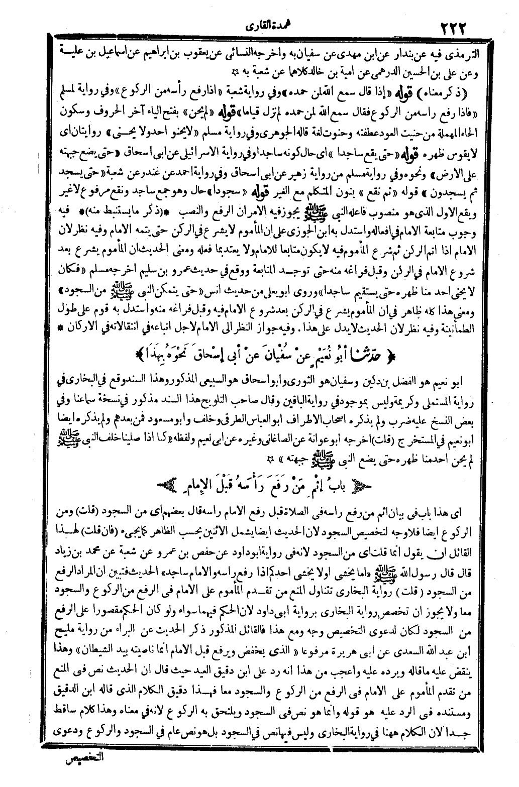 أَبُو نعيم هُوَ الْفضل بن دُكَيْن، وسُفْيَان هُوَ الثَّوْريّ وَأَبُو إِسْحَاق هُوَ السبيعِي الْمَذْكُور، وَهَذَا السَّنَد وَقع فِي البُخَارِيّ فِي رِوَايَة الْمُسْتَمْلِي وكريمة، وَلَيْسَ بموجود فِي رِوَايَة البَاقِينَ. وَقَالَ صَاحب (التَّلْوِيح) : هَذَا السَّنَد مَذْكُور فِي نُسْخَة سَمَاعنَا، وَفِي بعض النّسخ عَلَيْهِ ضرب، وَلم يذكرهُ أَصْحَاب الْأَطْرَاف: أَبُو الْعَبَّاس الطرقي وَخلف وَأَبُو مَسْعُود فَمن بعدهمْ، وَلم يذكرهُ أَيْضا أَبُو نعيم فِي (الْمُسْتَخْرج) قلت: أخرجه أَبُو عوَانَة عَن الصَّاغَانِي وَغَيره عَن أبي نعيم، وَلَفظه: (كُنَّا إِذا صلينَا خلف النَّبِي صلى الله عَلَيْهِ وَسلم لم يحن أحد منا ظَهره حَتَّى يضع النَّبِي صلى الله عَلَيْهِ وَسلم جَبهته) .
