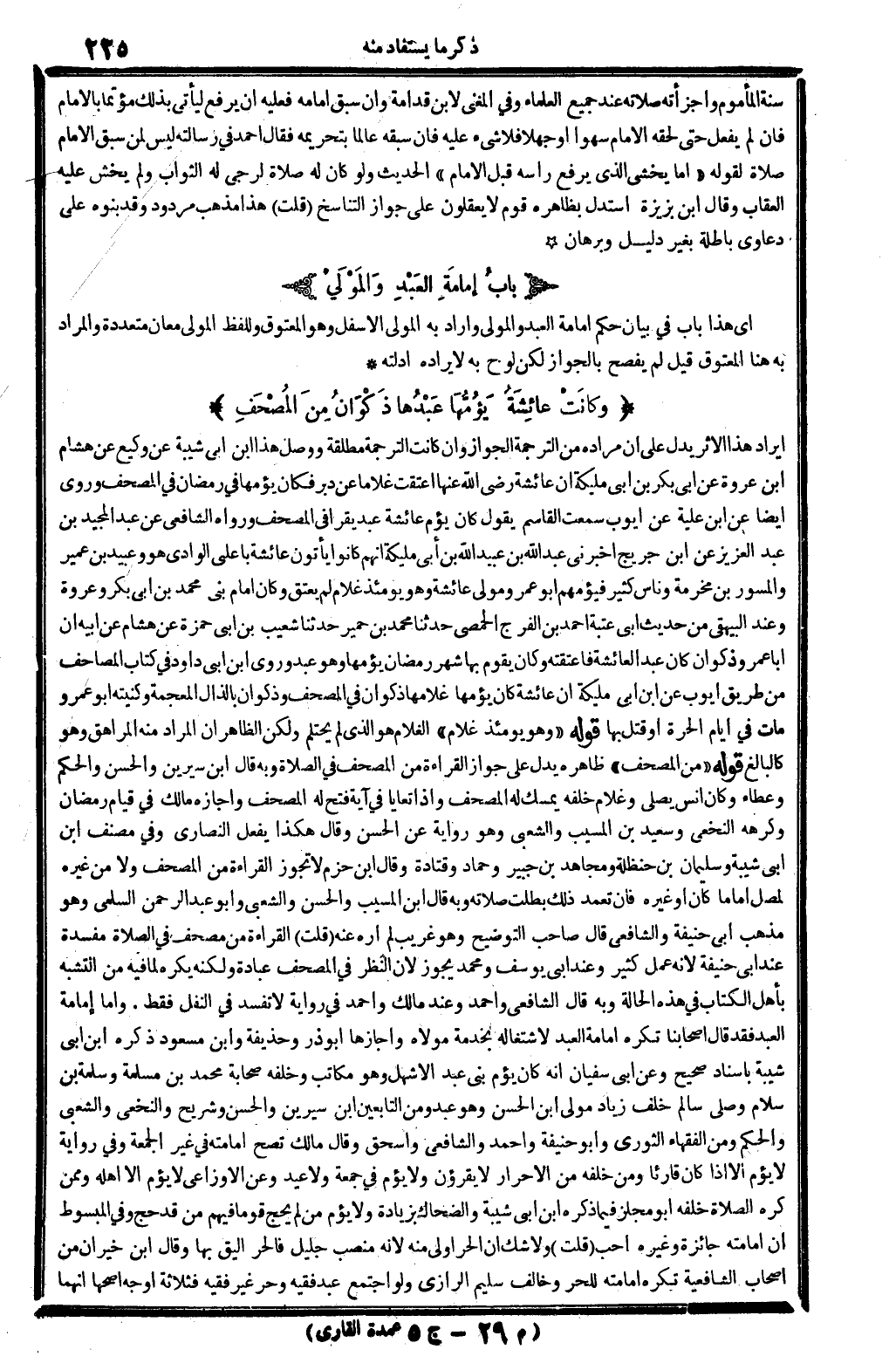 وكانَتْ عَائِشَةُ يِؤُمُّهِا عَبْدُهَا ذَكْوَانُ مِنَ المُصْحَفِ