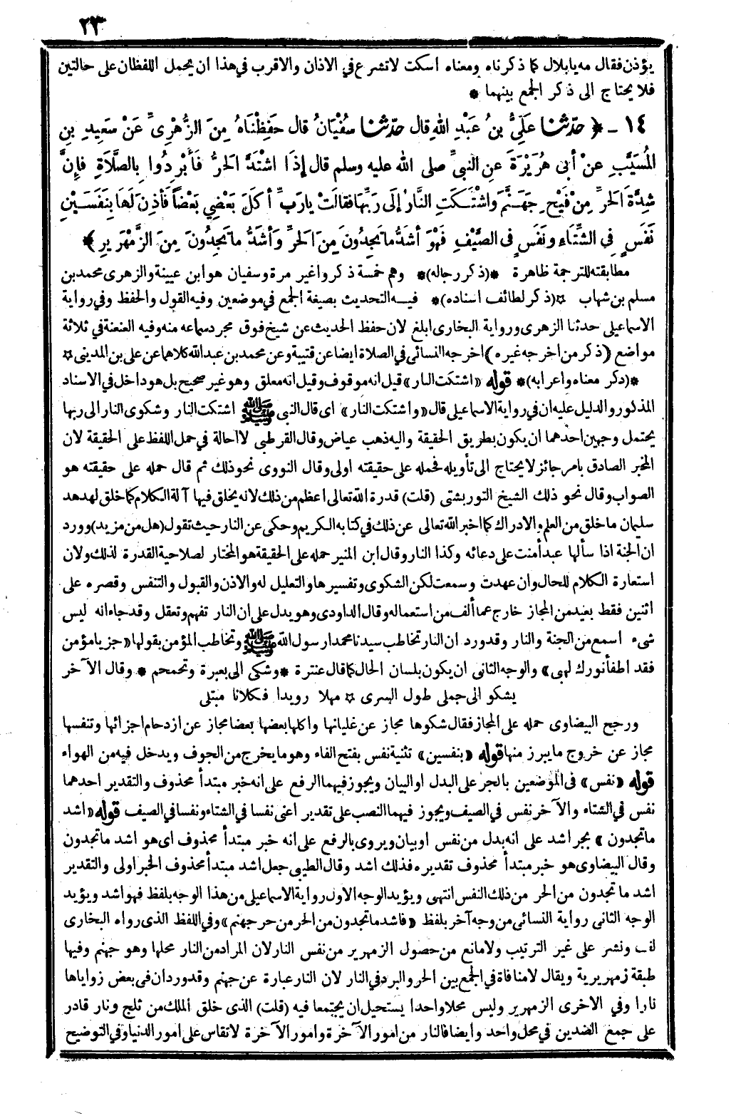 536 - حدَّثنا عَلِيُّ بنُ عَبْدِ الله قَالَ حدَّثنا سُفْيَانُ قَالَ حَفِظْنَاهُ مِنَ الزُّهْرِيِّ عَنْ سَعِيدِ بنِ المُسَيَّبِ عنْ أبي هُرَيْرَةَ عَن النبيِّ صلى الله عَلَيْهِ وَسلم قَالَ إذَا اشْتَدَّ الحَرُّ فَأَبْرِدُوا بِالصَّلاَةِ فَإِنَّ شِدَّةَ الحَرِّ مِنْ فَيْحِ جَهَنَّمَ (انْظُر الحَدِيث 533) . واشتكت النَّار إِلَى رَبهَا فَقَالَت يَا رب أكل بَعْضِي بَعْضًا فَأذن لَهَا بنفسين نفس فِي الشتَاء وَنَفس فِي الصَّيف فَهُوَ أَشد مَا تَجِدُونَ من الْحر وَأَشد مَا تَجِدُونَ من الزَّمْهَرِير) مطابقته للتَّرْجَمَة ظَاهِرَة. (ذكر رِجَاله) وهم خَمْسَة ذكرُوا غير مرّة وسُفْيَان هُوَ ابْن عُيَيْنَة وَالزهْرِيّ مُحَمَّد بن مُسلم بن شهَاب. (ذكر لطائف إِسْنَاده) فِيهِ التحديث بِصِيغَة الْجمع فِي موضِعين وَفِيه القَوْل وَالْحِفْظ وَفِي رِوَايَة الْإِسْمَاعِيلِيّ حَدثنَا الزُّهْرِيّ وَرِوَايَة البُخَارِيّ أبلغ لِأَن حفظ الحَدِيث عَن شيخ فَوق مُجَرّد سَمَاعه مِنْهُ وَفِيه العنعنة فِي ثَلَاثَة مَوَاضِع. (ذكر من أخرجه غَيره) أخرجه النَّسَائِيّ فِي الصَّلَاة أَيْضا عَن قُتَيْبَة وَعَن مُحَمَّد بن عبد الله كِلَاهُمَا عَن عَليّ بن الْمَدِينِيّ (ذكر مَعْنَاهُ وَإِعْرَابه) قَوْله " اشتكت النَّار " قيل أَنه مَوْقُوف وَقيل أَنه مُعَلّق وَهُوَ غير صَحِيح بل هُوَ دَاخل فِي الْإِسْنَاد الْمَذْكُور وَالدَّلِيل عَلَيْهِ أَن فِي رِوَايَة الْإِسْمَاعِيلِيّ قَالَ " واشتكت النَّار " أَي قَالَ النَّبِي - صَلَّى اللَّهُ عَلَيْهِ وَسَلَّم َ - اشتكت النَّار وشكوى النَّار إِلَى رَبهَا يحْتَمل وَجْهَيْن أَحدهمَا أَن يكون بطرِيق الْحَقِيقَة وَإِلَيْهِ ذهب عِيَاض وَقَالَ الْقُرْطُبِيّ لَا إِحَالَة فِي حمل اللَّفْظ على الْحَقِيقَة لِأَن الْمخبر الصَّادِق بِأَمْر جَائِز لَا يحْتَاج إِلَى تَأْوِيله فَحَمله على حَقِيقَته أولى وَقَالَ النَّوَوِيّ نَحْو ذَلِك ثمَّ قَالَ حمله على حَقِيقَته هُوَ الصَّوَاب وَقَالَ نَحْو ذَلِك الشَّيْخ التوربشتي (قلت) قدرَة الله تَعَالَى أعظم من ذَلِك لِأَنَّهُ يخلق فِيهَا آلَة الْكَلَام كَمَا خلق لهدهد سُلَيْمَان مَا خلق من الْعلم والإدراك كَمَا أخبر الله تَعَالَى عَن ذَلِك فِي كِتَابه الْكَرِيم وَحكى عَن النَّار حَيْثُ تَقول {هَل من مزِيد} وَورد أَن الْجنَّة إِذا سَأَلَهَا عبد أمنت على دُعَائِهِ وَكَذَا النَّار وَقَالَ ابْن الْمُنِير حمله على الْحَقِيقَة هُوَ الْمُخْتَار لصلاحية الْقُدْرَة لذَلِك وَلِأَن اسْتِعَارَة الْكَلَام للْحَال وَإِن عهِدت وَسمعت لَكِن الشكوى وتفسيرها وَالتَّعْلِيل لَهُ وَالْإِذْن وَالْقَبُول والتنفس وقصره على اثْنَيْنِ فَقَط بعيد من الْمجَاز خَارج عَمَّا ألف من اسْتِعْمَاله وَقَالَ الدَّاودِيّ وَهُوَ يدل على أَن النَّار تفهم وتعقل وَقد جَاءَ أَنه لَيْسَ شَيْء أسمع من الْجنَّة وَالنَّار وَقد ورد أَن النَّار تخاطب سيدنَا مُحَمَّدًا رَسُول الله - صَلَّى اللَّهُ عَلَيْهِ وَسَلَّم َ - وتخاطب الْمُؤمن بقولِهَا " جز يَا مُؤمن فقد أطفأ نورك لهبي " وَالْوَجْه الثَّانِي أَن يكون بِلِسَان الْحَال كَمَا قَالَ عنترة
