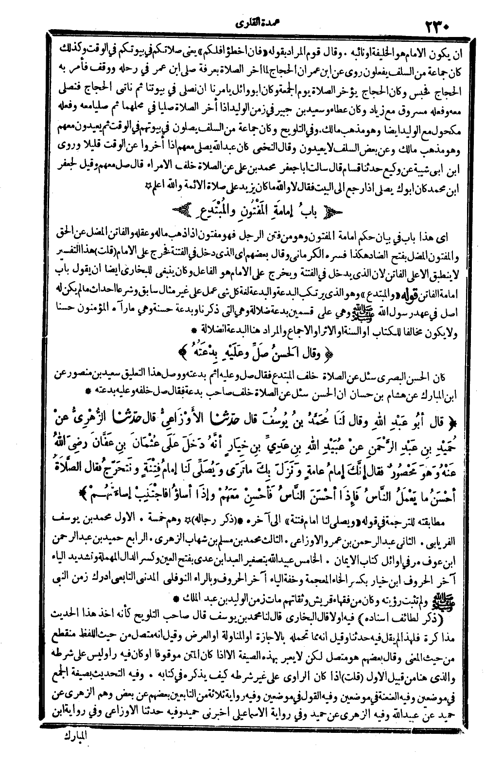 كَانَ الْحسن الْبَصْرِيّ سُئِلَ عَن الصَّلَاة خلف المبتدع، فَقَالَ: صل وَعَلِيهِ إِثْم بدعته، وَوصل هَذَا التَّعْلِيق سعيد بن مَنْصُور عَن ابْن الْمُبَارك عَن هِشَام بن حسان: أَن الْحسن سُئِلَ عَن الصَّلَاة خلف صَاحب بِدعَة فَقَالَ: صل خَلفه وَعَلِيهِ بدعته.