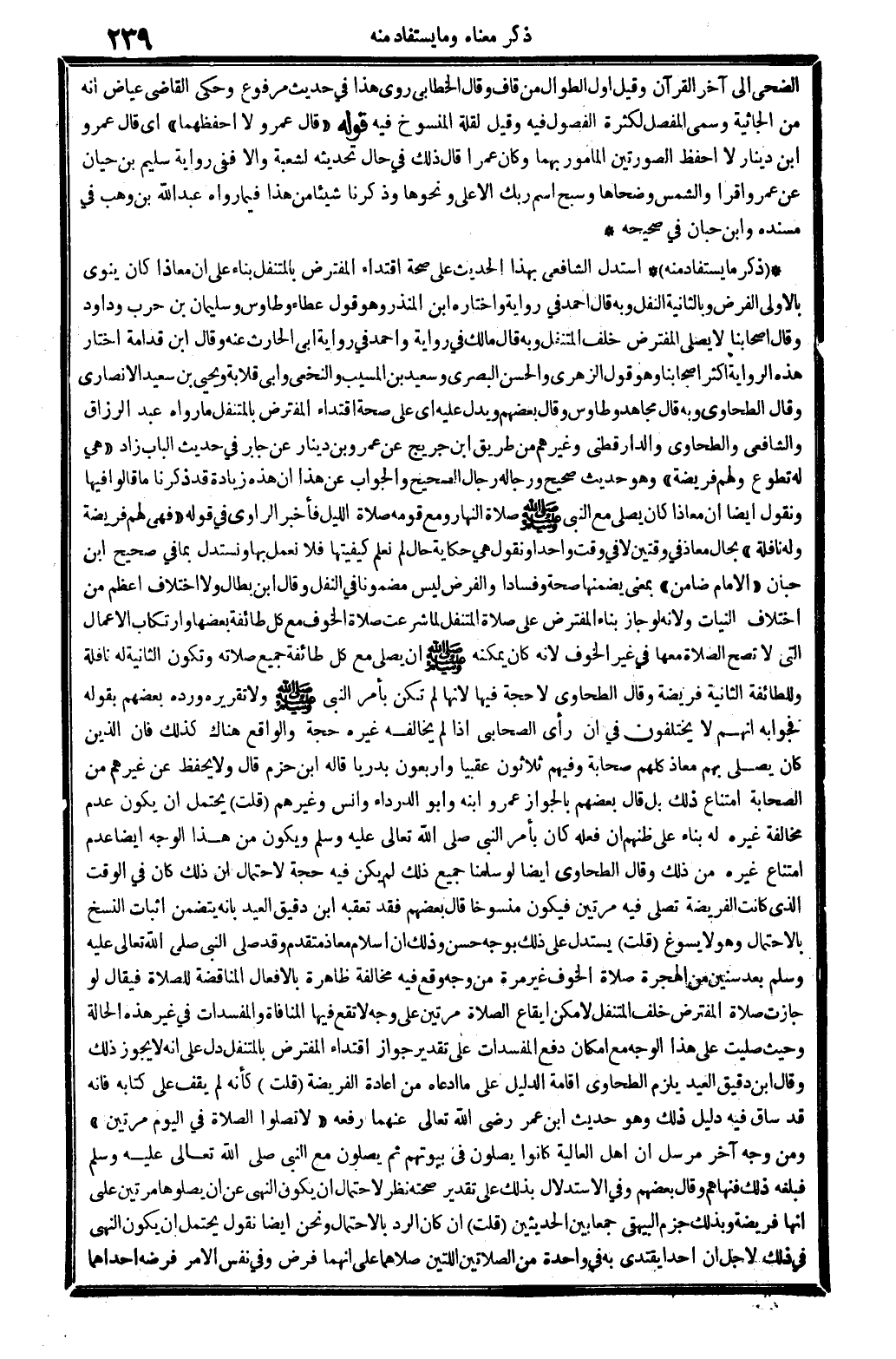 ذكر مَا يُسْتَفَاد مِنْهُ: اسْتدلَّ الشَّافِعِي بِهَذَا الحَدِيث على صِحَة اقْتِدَاء المفترض بالمتنفل على أَن معَاذًا كَانَ يَنْوِي بِالْأولَى الْفَرْض، وبالثانية النَّفْل. وَبِه قَالَ أَحْمد فِي رِوَايَة، وَاخْتَارَهُ ابْن الْمُنْذر، وَهُوَ قَول عَطاء وَطَاوُس وَسليمَان بن حَرْب وَدَاوُد، وَقَالَ أَصْحَابنَا: لَا يُصَلِّي المفترض خلف المتنفل، وَبِه قَالَ مَالك فِي رِوَايَة، وَأحمد فِي رِوَايَة أبي الْحَارِث عَنهُ، وَقَالَ ابْن قدامَة: اخْتَار هَذِه الرِّوَايَة أَكثر أَصْحَابنَا، وَهُوَ قَول الزُّهْرِيّ وَالْحسن الْبَصْرِيّ وَسَعِيد بن الْمسيب وَالنَّخَعِيّ وَأبي قلَابَة وَيحيى بن سعيد الْأنْصَارِيّ وَقَالَ الطَّحَاوِيّ: وَبِه قَالَ مُجَاهِد وطاووس، وَقَالَ بَعضهم: وَيدل عَلَيْهِ أَي: على صِحَة اقْتِدَاء المفترض بالمتنفل، مَا رَوَاهُ عبد الرَّزَّاق وَالشَّافِعِيّ والطَّحَاوِي وَالدَّارَقُطْنِيّ وَغَيرهم من طَرِيق ابْن جريج: عَن عَمْرو بن دِينَار عَن جَابر فِي حَدِيث الْبَاب زَاد: (هِيَ لَهُ تطوع وَلَهُم فَرِيضَة) ، وَهُوَ حَدِيث صَحِيح، وَرِجَاله رجال الصَّحِيح، وَالْجَوَاب عَن هَذَا: أَن هَذِه زِيَادَة قد ذكرنَا مَا قَالُوا فِيهَا، ونقول أَيْضا: إِن معَاذًا كَانَ يُصَلِّي مَعَ النَّبِي صلى الله عَلَيْهِ وَسلم صَلَاة النَّهَار وَمَعَ قومه صَلَاة اللَّيْل، فَأخْبر الرَّاوِي فِي قَوْله: (فَهِيَ لَهُم فَرِيضَة وَله نَافِلَة) بِحَال معَاذ فِي وَقْتَيْنِ لَا فِي وَقت وَاحِد، أَو نقُول: هِيَ حِكَايَة حَال لم نعلم كيفيتها فَلَا نعمل بهَا، ونستدل بِمَا فِي (صَحِيح ابْن حبَان) : (الإِمَام ضَامِن) ، بِمَعْنى: يضمنهَا صِحَة وَفَسَادًا، وَالْفَرْض لَيْسَ مَضْمُونا فِي النَّفْل. وَقَالَ ابْن بطال: وَلَا اخْتِلَاف أعظم من اخْتِلَاف النيات، وَلِأَنَّهُ لَو جَازَ بِنَاء المفترض على صَلَاة المتنفل لما شرعت صَلَاة الْخَوْف مَعَ كل طَائِفَة، بَعْضهَا، وارتكاب الْأَعْمَال الَّتِي لَا تصح الصَّلَاة مَعهَا فِي غير الْخَوْف، لِأَنَّهُ كَانَ يُمكنهُ صلى الله عَلَيْهِ وَسلم أَن يُصَلِّي مَعَ كل طَائِفَة جَمِيع صلَاته وَتَكون الثَّانِيَة لَهُ نَافِلَة وللطائفة الثَّانِيَة فَرِيضَة. وَقَالَ الطَّحَاوِيّ: لَا حجَّة فِيهَا لِأَنَّهَا لم تكن بِأَمْر النَّبِي صلى الله عَلَيْهِ وَسلم وَلَا تَقْرِيره، ورده بَعضهم بقوله: فَجَوَابه أَنهم لَا يَخْتَلِفُونَ فِي أَن رَأْي الصَّحَابِيّ إِذا لم يُخَالِفهُ غَيره حجَّة، وَالْوَاقِع هُنَاكَ كَذَلِك، فَإِن الَّذين كَانَ يُصَلِّي بهم معَاذ كلهم صحابة، وَفِيهِمْ ثَلَاثُونَ عقبيا، وَأَرْبَعُونَ بَدْرِيًّا، قَالَه ابْن حزم. قَالَ: وَلَا يحفظ عَن غَيرهم من الصَّحَابَة امْتنَاع ذَلِك، بل قَالَ بَعضهم بِالْجَوَازِ عمر وَابْنه وَأَبُو الدَّرْدَاء وَأنس وَغَيرهم. قلت: يحْتَمل أَن يكون عدم مُخَالفَة غَيره لَهُ بِنَاء على ظنهم أَن فعله كَانَ بِأَمْر النَّبِي، صلى الله عَلَيْهِ وَسلم، وَيكون من هَذَا الْوَجْه أَيْضا عدم امْتنَاع غَيره من ذَلِك. وَقَالَ الطَّحَاوِيّ أَيْضا: لَو سلمنَا جَمِيع ذَلِك لم يكن فِيهِ حجَّة لاحْتِمَال أَن ذَلِك كَانَ فِي الْوَقْت الَّذِي كَانَت الْفَرِيضَة تصلى فِيهِ مرَّتَيْنِ، فَيكون مَنْسُوخا. قَالَ بَعضهم: فقد تعقبه ابْن دَقِيق الْعِيد بِأَنَّهُ يتَضَمَّن إِثْبَات النّسخ بِالِاحْتِمَالِ، وَهُوَ لَا يسوغ قلت: يسْتَدلّ على ذَلِك بِوَجْه حسن، وَذَلِكَ إِن إِسْلَام معَاذ مُتَقَدم، وَقد صلى النَّبِي، صلى الله عَلَيْهِ وَسلم، بعد سِنِين من الْهِجْرَة صَلَاة الْخَوْف غير مرّة من وَجه وَقع فِيهِ مُخَالفَة ظَاهِرَة بالأفعال المناقضة للصَّلَاة، فَيُقَال: لَو جَازَت صَلَاة المفترض خلف المتنفل لأمكن إِيقَاع الصَّلَاة مرَّتَيْنِ على وَجه لاتقع فِيهَا الْمُنَافَاة، والمفسدات ف