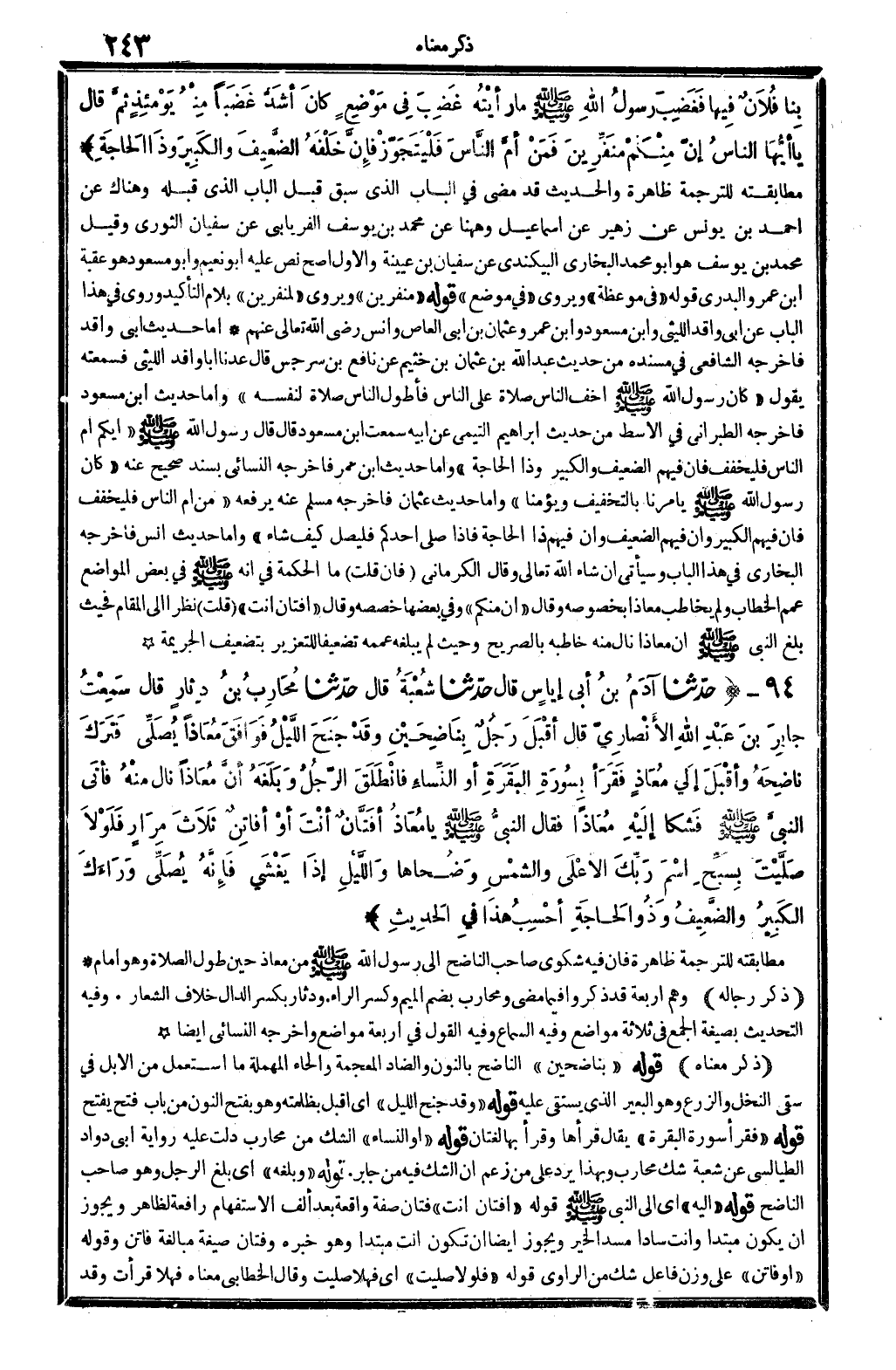بِنَا فُلانٌ فِيهَا فَغَضِبَ رسولُ الله صلى الله عَلَيْهِ وَسلم مَا رأيْتُهُ غَضِبَ فِي مَوْضِعٍ كانَ أشَدَّ غَضَبا مِنْهُ يَوْمَئِذٍ ثمَّ قالَ يَا أيّهَا الناسُ إنَّ مِنْكُمْ منَفِّرِينَ فَمَنْ أمَّ النَّاسَ فَلْيَتَجَوَّزْ فَإنَّ خَلْفَهُ الضَعِيفَ والكَبِيرَ وذَا الحَاجَةِ.