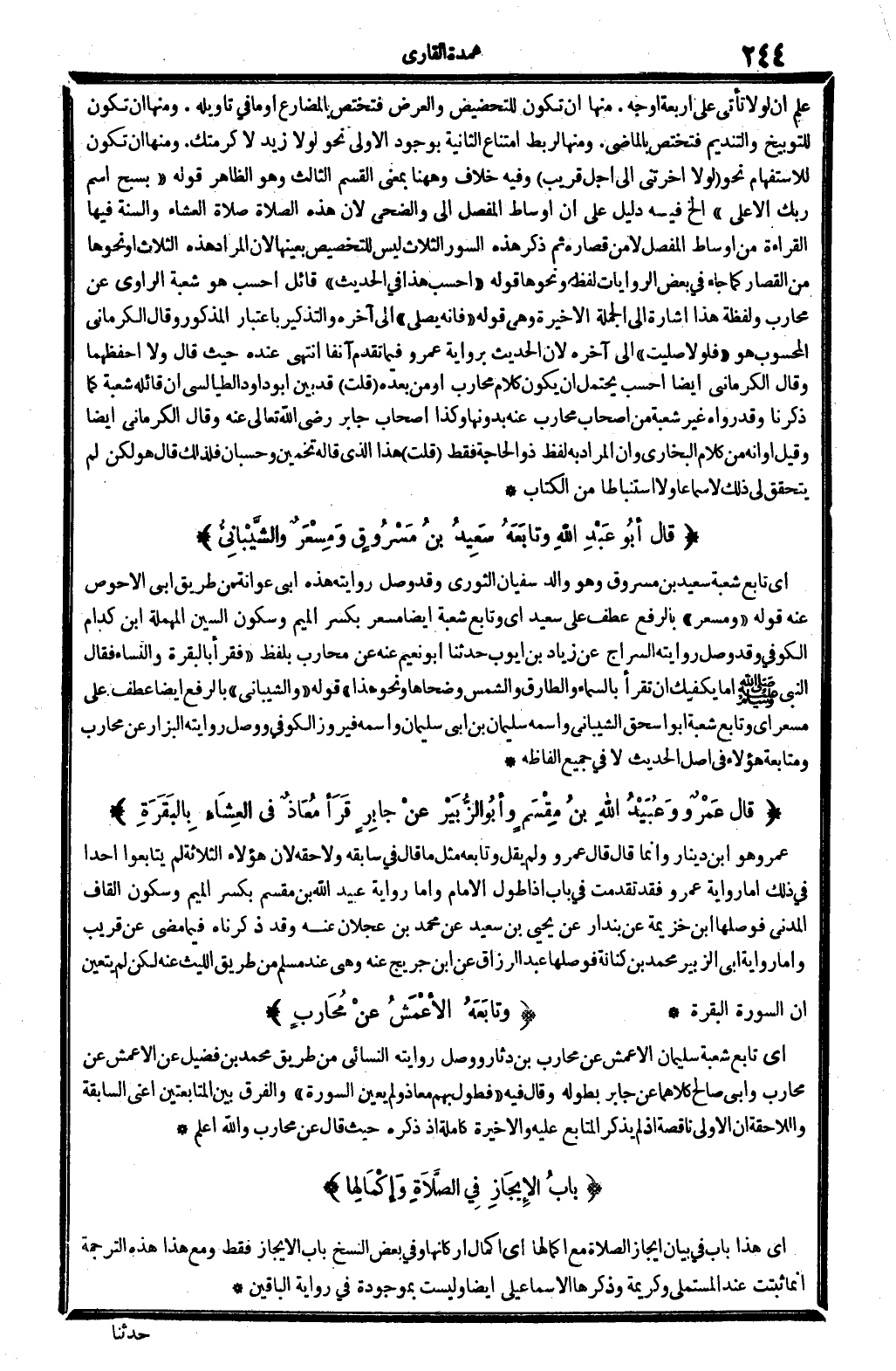 أَي: تَابع شُعْبَة سعيد بن مَسْرُوق وَهُوَ وَالِد سُفْيَان الثَّوْريّ، وَقد وصل رِوَايَته هَذِه أَبُو عوَانَة من طَرِيق أبي الْأَحْوَص عَنهُ. قَوْله: (ومسعر) ، بِالرَّفْع عطف على: سعيد، أَي: وتابع شُعْبَة أَيْضا مسعر، بِكَسْر الْمِيم وَسُكُون السِّين الْمُهْملَة: ابْن كدام الْكُوفِي، وَقد وصل رِوَايَته السراج: عَن زِيَاد بن أَيُّوب حَدثنَا أَبُو نعيم عَنهُ عَن محَارب بِلَفْظ: (فَقَرَأَ بالبقرة وَالنِّسَاء، فَقَالَ النَّبِي صلى الله عَلَيْهِ وَسلم: أما يَكْفِيك أَن تقْرَأ بالسماء والطارق، وَالشَّمْس وَضُحَاهَا، وَنَحْو هَذَا؟) قَوْله: (والشيباني) ، بِالرَّفْع أَيْضا عطف على: مسعر، أَي: وتابع شُعْبَة أَبُو إِسْحَاق الشَّيْبَانِيّ، واسْمه: سُلَيْمَان بن أبي سُلَيْمَان، واسْمه: فَيْرُوز الْكُوفِي، وَوصل رِوَايَته الْبَزَّار عَن محَارب ومتابعة هَؤُلَاءِ فِي أصل الحَدِيث لَا فِي جَمِيع أَلْفَاظه.
