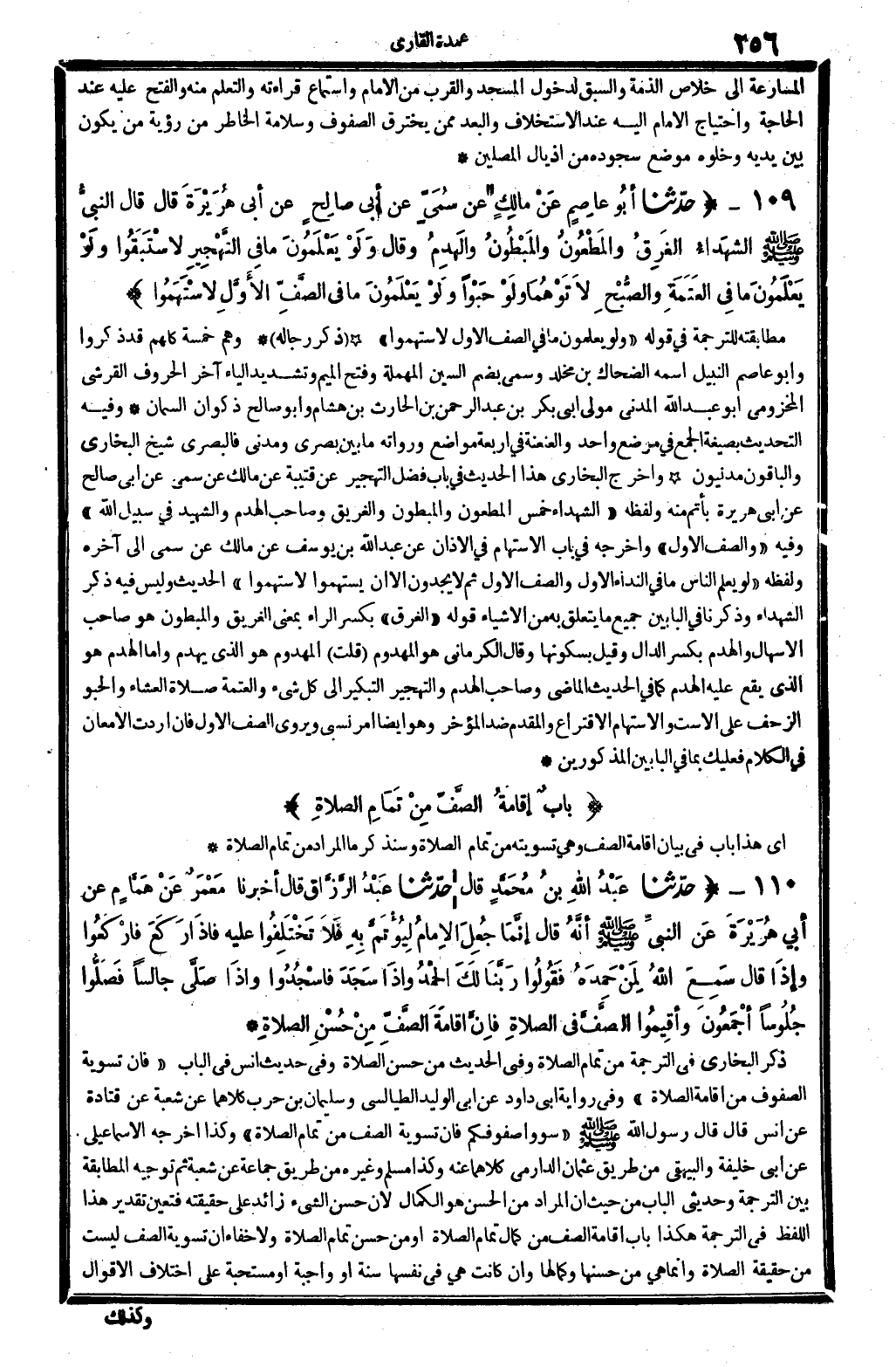 ذكر البُخَارِيّ فِي التَّرْجَمَة: من تَمام الصَّلَاة، وَفِي الحَدِيث: (من حسن الصَّلَاة) وَفِي حَدِيث أنس فِي الْبَاب: (فَإِن تَسْوِيَة الصُّفُوف من إِقَامَة الصَّلَاة) . وَفِي رِوَايَة أبي دَاوُد عَن أبي الْوَلِيد الطَّيَالِسِيّ وَسليمَان بن حَرْب، كِلَاهُمَا عَن شُعْبَة عَن قَتَادَة عَن أنس، قَالَ: قَالَ رَسُول الله صلى الله عَلَيْهِ وَسلم: (سووا صفوفكم فَإِن تَسْوِيَة الصَّفّ من تَمام الصَّلَاة) . وَكَذَا أخرجه الْإِسْمَاعِيلِيّ عَن أبي خَليفَة وَالْبَيْهَقِيّ من طَرِيق عُثْمَان الدَّارمِيّ، كِلَاهُمَا عَنهُ، وَكَذَا مُسلم وَغَيره من طَرِيق جمَاعَة عَن شُعْبَة، ثمَّ تَوْجِيه الْمُطَابقَة بَين التَّرْجَمَة وحديثي الْبَاب من حَيْثُ إِن المُرَاد من الْحسن هُوَ الْكَمَال، لِأَن حسن الشَّيْء زَائِد على حَقِيقَته، فَتعين تَقْدِير هَذَا اللَّفْظ فِي التَّرْجَمَة هَكَذَا بَاب: إِقَامَة الصَّفّ من كَمَال تَمام الصَّلَاة أَو من حسن تَمام الصَّلَاة، وَلَا خَفَاء أَن تَسْوِيَة الصَّفّ لَيست من حَقِيقَة الصَّلَاة، وَإِنَّمَا هِيَ من حسنها وكمالها، وَإِن كَانَت هِيَ فِي نَفسهَا سنة أَو وَاجِبَة أَو مُسْتَحبَّة على اخْتِلَاف الْأَقْوَال.