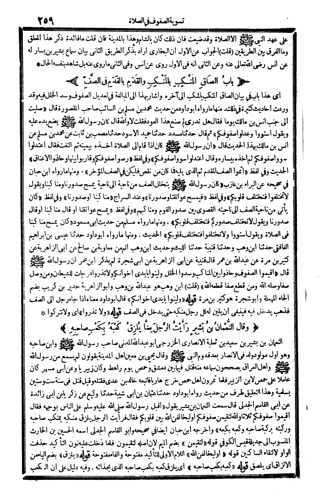 وَقَالَ النُّعْمَانُ بنُ بَشِيرٍ رَأَيْتُ الرَّجُلَ يُلْزِقُ كَعْبَهُ بِكَعْبِ صَاحِبِهِ
