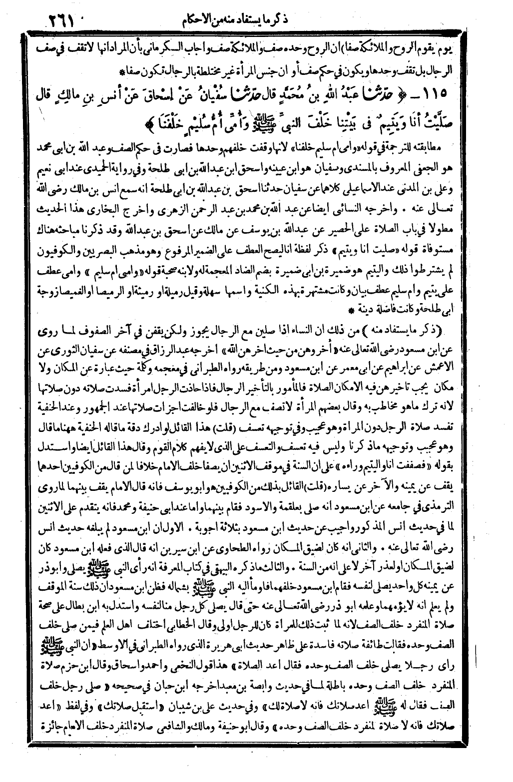 ذكر مَا يُسْتَفَاد مِنْهُ: من ذَلِك: أَن النِّسَاء إِذا صلين مَعَ الرِّجَال يجوز، وَلَكِن يَقِفن فِي آخر الصُّفُوف، لما رُوِيَ عَن ابْن مَسْعُود، رَضِي الله تَعَالَى عَنهُ: (أخروهن من حَيْثُ أخرهن الله) . أخرجه عبد الرَّزَّاق فِي (مُصَنفه) عَن سُفْيَان الثَّوْريّ عَن الْأَعْمَش عَن إِبْرَاهِيم عَن أبي معمر عَن ابْن مَسْعُود، وَمن طَرِيقه رَوَاهُ الطَّبَرَانِيّ فِي (مُعْجَمه) . وَكلمَة: حَيْثُ، عبارَة عَن الْمَكَان، وَلَا مَكَان يجب تأخيرهن فِيهِ إلاّ مَكَان الصَّلَاة، فالمأمور بِالتَّأْخِيرِ الرِّجَال، فَإِذا حاذت الرجل امْرَأَة فَسدتْ صلَاته دون صلَاتهَا، لِأَنَّهُ ترك مَا هُوَ مُخَاطب بِهِ. وَقَالَ بَعضهم: الْمَرْأَة لَا تصف مَعَ الرِّجَال، فَلَو خَالَفت أَجْزَأت صلَاتهَا عِنْد الْجُمْهُور، وَعند الْحَنَفِيَّة تفْسد صَلَاة الرجل دون الْمَرْأَة، وَهُوَ عَجِيب، وَفِي تَوْجِيهه تعسف. قلت: هَذَا الْقَائِل لَو أدْرك دقة مَا قَالَه الْحَنَفِيَّة هَهُنَا مَا قَالَ: وَهُوَ عَجِيب، وتوجيهه مَا ذكرنَا، وَلَيْسَ فِيهِ تعسف، والتعسف على الَّذِي لَا يفهم كَلَام القَوْل. وَقَالَ هَذَا الْقَائِل أَيْضا: وَاسْتدلَّ بقوله: (فصففت أَنا واليتيم وَرَاءه) ، على أَن السّنة فِي موقف الْإِثْنَيْنِ أَن يصفا خلف الإِمَام، لمن قَالَ من الْكُوفِيّين: أَحدهمَا يقف عَن يَمِينه وَالْآخر عَن يسَاره. قلت: الْقَائِل بذلك من الْكُوفِيّين هُوَ أَبُو يُوسُف، فَإِنَّهُ قَالَ: الإِمَام يقف بَينهمَا، لما روى التِّرْمِذِيّ فِي (جَامعه) : عَن ابْن مَسْعُود أَنه صلى بعلقمة وَالْأسود فَقَامَ بَينهمَا. وَأما عِنْد أبي حنيفَة فَإِنَّهُ يتَقَدَّم على الْإِثْنَيْنِ لما فِي حَدِيث أنس الْمَذْكُور، وَأجِيب عَن حَدِيث ابْن مَسْعُود بِثَلَاثَة أجوبة: الأول: