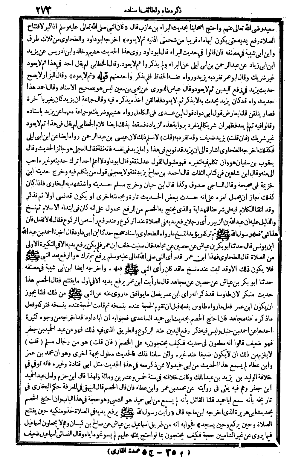 وَأخرجه أَيْضا ابْن أبي شيبَة فِي (مُصَنفه) : حَدثنَا أَبُو بكر بن عِيَاض عَن حُصَيْن عَن مُجَاهِد، قَالَ: مَا رَأَيْت ابْن عمر يرفع يَدَيْهِ إلاّ فِي أول مَا يفْتَتح، فَقَالَ الْخصم: هَذَا حَدِيث مُنكر، لِأَن طاووسا قد ذكر إِنَّه رأى ابْن عمر يفعل مَا يُوَافق مَا روى عَنهُ عَن النَّبِي صلى الله عَلَيْهِ وَسلم من ذَلِك، قُلْنَا: يجوز أَن يكون ابْن عمر فعل مَا رَوَاهُ طَاوُوس يَفْعَله قبل أَن تقوم الْحجَّة عِنْده بنسخة، ثمَّ قَامَت الْحجَّة عِنْده بنسخة فَتَركه، وَفعل مَا ذكره عَنهُ مُجَاهِد، فَإِن احْتج الْخصم بِحَدِيث أبي حميد السَّاعِدِيّ، فَجَوَابه أَن أَبَا دَاوُد قد أخرجه من وُجُوه كَثِيرَة: أَحدهَا عَن أَحْمد بن حَنْبَل وَلَيْسَ فِيهِ ذكر رفع الْيَدَيْنِ عِنْد الرُّكُوع، وَالطَّرِيق الَّذِي فِيهِ ذَلِك فَهُوَ عَن عبد الحميد بن جَعْفَر، فَهُوَ ضَعِيف. قَالُوا: إِنَّه مطعون فِي حَدِيثه فَكيف يحتجون بِهِ على الْخصم؟ فَإِن قلت: هُوَ من رجال مُسلم قلت: لَا يلْزم من ذَلِك أَن لَا يكون ضَعِيفا عِنْد غَيره، وَلَئِن سلمنَا ذَلِك فَالْحَدِيث مَعْلُول بِجِهَة أُخْرَى، وَهُوَ أَن مُحَمَّد بن عمر وَابْن عَطاء لم يسمع هَذَا الحَدِيث من أبي حميد وَلَا مِمَّن ذكر مَعَه فِي هَذَا الحَدِيث مثل أبي قَتَادَة وَغَيره فَإِنَّهُ توفّي فِي خلَافَة الْوَلِيد بن يزِيد بن عبد الْملك، وَكَانَت خِلَافَته فِي سنة خمس وَعشْرين وَمِائَة، وَلِهَذَا قَالَ ابْن حزم: وَلَعَلَّ عبد الحميد ابْن جَعْفَر وهم فِيهِ، يَعْنِي فِي رِوَايَته عَن مُحَمَّد بن عمر وَابْن عَطاء. فَإِن قَالَ الْخصم: قَالَ الْبَيْهَقِيّ فِي (الْمعرفَة) : حكم البُخَارِيّ فِي (تَارِيخه) : بِأَنَّهُ سمع أَبَا حميد، قُلْنَا: الْقَائِل بِأَنَّهُ لم يسمع من أبي حميد هُوَ الشّعبِيّ، وَهُوَ حجَّة فِي هَذَا الْبَاب، وَإِن احْتج الْخصم بِحَدِيث أبي هُرَيْرَة الَّذِي أخرجه ابْن مَاجَه، قَالَ: (رَأَيْت رَسُول الله صلى الله عَلَيْهِ وَسلم يرفع يَدَيْهِ فِي الصَّلَاة حَذْو مَنْكِبَيْه حِين يفْتَتح الصَّلَاة وَحين يرْكَع وَحين يسْجد) ، فَجَوَابه أَنه من طَرِيق إِسْمَاعِيل بن عَيَّاش عَن صَالح بن كيسَان، وهم لَا يجْعَلُونَ إِسْمَاعِيل فِيمَا يرْوى عَن غير الشاميين حجَّة، فَكيف يحتجون بِمَا لَو احْتج بِمثلِهِ عَلَيْهِم لم يسوغوه إِيَّاه؟ وَقَالَ النَّسَائِيّ: إِسْمَاعِيل ضَعِيف.