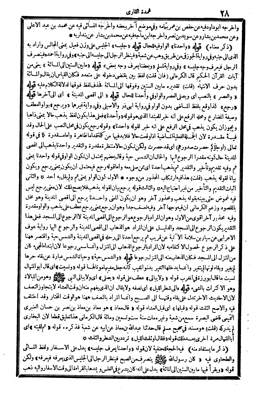 ذكر مَعْنَاهُ: قَوْله: (واحدنا) الْوَاو فِيهِ للْحَال. قَوْله: (جليسه) ، الجليس على وزن: فعيل، بِمَعْنى: الْمجَالِس، وَأَرَادَ بِهِ الَّذِي إِلَى جنبه، وَفِي رِوَايَة الجوزقي من طَرِيق وهب عَن شُعْبَة: (فَينْظر الرجل إِلَى جليسه إِلَى جنبه) . وَفِي رِوَايَة أَحْمد: (فَيَنْصَرِف الرجل فَيعرف وَجه جليسه) . وَفِي رِوَايَة لمُسلم: (وبعضنا يعرف وَجه بعض) . قَوْله: (مَا بَين السِّتين إِلَى الْمِائَة) يَعْنِي: من) آيَات الْقُرْآن الْحَكِيم. قَالَ الْكرْمَانِي: فَإِن قلت لفظ: بَين، يَقْتَضِي دُخُوله على مُتَعَدد، فَكَانَ الْقيَاس أَن يُقَال: وَالْمِائَة، بِدُونِ حرف الِانْتِهَاء؟ قلت: تَقْدِيره مَا بَين السِّتين وفوقها إِلَى الْمِائَة، فَحذف لفظ: فَوْقهَا، لدلَالَة الْكَلَام عَلَيْهِ. قَوْله: (وَالْعصر) بِالنّصب أَي، وَيُصلي الْعَصْر، و: الْوَاو، فِي: وأحدنا، للْحَال. قَوْله: (إِلَى أقْصَى الْمَدِينَة) أَي: إِلَى آخرهَا. قَوْله: (رَجَعَ) ، كَذَا وَقع بِلَفْظ الْمَاضِي بِدُونِ: الْوَاو، وَفِي رِوَايَة أبي ذَر والأصيلي، وَفِي رِوَايَة غَيرهمَا: (وَيرجع) ، بواو الْعَطف وَصِيغَة الْمُضَارع، وَمحله الرّفْع على أَنه خبر للمبتدأ الَّذِي هُوَ قَوْله: (وأحدنا) ، فعلى هَذَا يكون لفظ: يذهب، حَالا بِمَعْنى: ذَاهِبًا، وَيجوز أَن يكون: يذهب، فِي مَحل الرّفْع على أَنه خبر لقَوْله: (أَحَدنَا) ، وَقَوله: رَجَعَ، يكون فِي مَحل النصب على الْحَال و: قد، فِيهِ مقدرَة لِأَن الْجُمْلَة الفعلية الْمَاضِيَة، إِذا وَقعت حَالا فَلَا بُد مِنْهَا من كلمة: قد إِمَّا ظَاهِرَة وَإِمَّا مقدرَة، كَمَا فِي قَوْله تَعَالَى: {أوجاؤكم حصرت صُدُورهمْ} (النِّسَاء: 90) . أَي: قد حصرت، وَلَكِن تكون حَالا منتظرة مقدرَة، وَالتَّقْدِير: وأحدنا يذهب إِلَى أقْصَى الْمَدِينَة حَال كَونه مُقَدرا الرُّجُوع إِلَيْهَا وَالْحَال أَن الشَّمْس حَيَّة. وَقَالَ بَعضهم: يحْتَمل أَن تكون: الْوَاو، فِي قَوْله: وأحدنا، بِمَعْنى ثمَّ. وَفِيه تَقْدِيم وَتَأْخِير، وَالتَّقْدِير: ثمَّ يذهب أَحَدنَا، أَي مِمَّن صلى مَعَه، وَأما قَوْله: رَاجع، فَيحْتَمل أَن يكون بِمَعْنى: يرجع، وَيكون بَيَانا لقَوْله: يذهب. قلت: هَذَا فِيهِ ارْتِكَاب الْمَحْذُور من وُجُوه. الأول: كَون: الْوَاو، بِمَعْنى: ثمَّ، وَلم يقل بِهِ أحد. وَالثَّانِي: إِثْبَات التَّقْدِيم وَالتَّأْخِير من غير احْتِيَاج إِلَيْهِ. وَالثَّالِث: قَوْله: يرجع، بَيَان لقَوْله: يذهب، فَلَا يَصح ذَلِك لِأَن معنى: يرجع، لَيْسَ فِيهِ غموض حَتَّى يُبينهُ بقوله: يذهب، ومحذور آخر وَهُوَ أَن يكون الْمَعْنى: واحدنا يرجع إِلَى أقْصَى الْمَدِينَة، وَهُوَ مخل بِالْمَقْصُودِ. وَزعم الْكرْمَانِي أَن فِيهِ وَجها آخر، وَفِيه تعسف جدا، وَهُوَ أَن: رَجَعَ، بِمَعْنى: يرجع، عطف على: يذهب، و: الْوَاو، مقدرَة وَفِيه مَحْذُور آخر أقوى من الأول، وَهُوَ أَن المُرَاد بِالرُّجُوعِ هُوَ: الرُّجُوع إِلَى أقْصَى الْمَدِينَة لَا الرُّجُوع إِلَى الْمَسْجِد، فعلى هَذَا التَّقْدِير يكون الرُّجُوع إِلَى الْمَسْجِد، وَالدَّلِيل على أَن المُرَاد هُوَ الذّهاب إِلَى أقْصَى الْمَدِينَة وَالرُّجُوع إِلَيْهَا رِوَايَة عَوْف الْأَعرَابِي عَن سيار بن سَلامَة الْآتِيَة عَن قريب، ثمَّ يرجع أَحَدنَا إِلَى رحْلَة فِي أقْصَى الْمَدِينَة وَالشَّمْس حَيَّة. وَاقْتصر هَهُنَا على ذكر الرُّجُوع لحُصُول الِاكْتِفَاء بِهِ لِأَن المُرَاد بِالرُّجُوعِ الذّهاب إِلَى الْمنزل، وَإِنَّمَا سمي رُجُوعا لِأَن ابْتِدَاء الْمَجِيء كَانَ من الْمنزل إِلَى الْمَسْجِد، فَكَانَ الذّهاب مِنْهُ إِلَى الْمنزل رُجُوعا. قَوْله: (وَالشَّمْس حَيَّة) وحياة الشَّمْس عبارَة عَن بَقَاء حرهَا لم يُغير، وَبَقَاء لَوْنهَا لم يتَغَيَّر، وَإِنَّمَا يدخلهَا التَّغَيُّر بدنو المغيب، كَأَنَّهُ جعل مغيبها موتا لَهَا. قَوْله: (ونسيت) أَي: ق