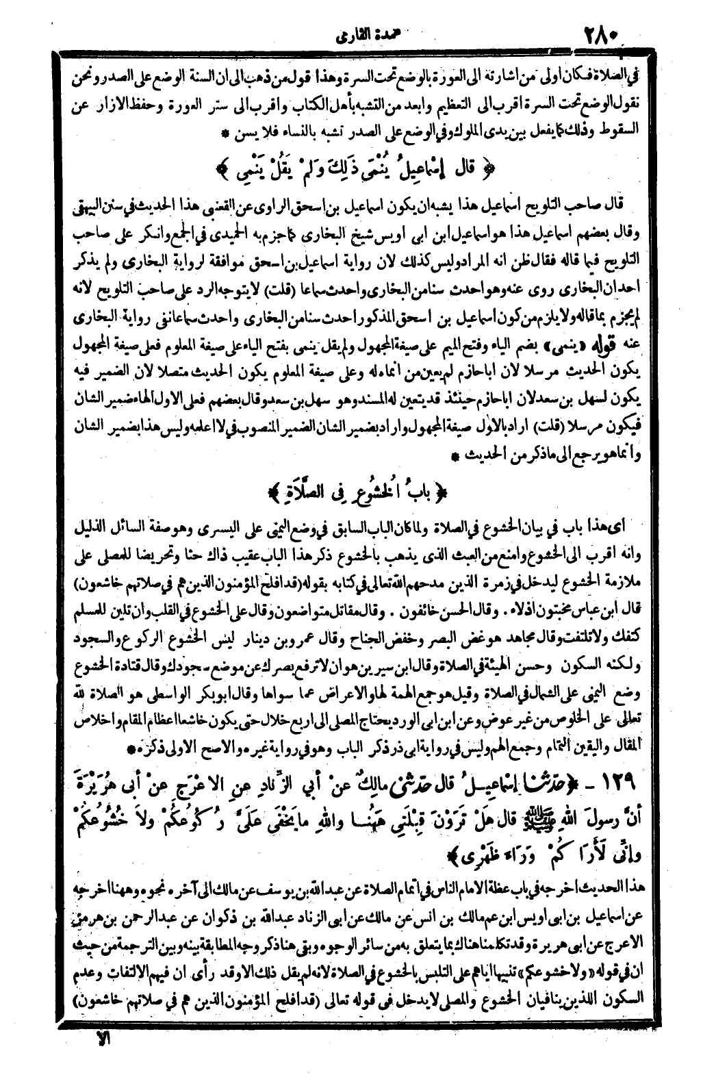 هَذَا الحَدِيث أخرجه فِي: بَاب عظة الإِمَام النَّاس فِي إتْمَام الصَّلَاة، عَن عبد الله بن يُوسُف عَن مَالك إِلَى آخِره نَحوه، وَهَهُنَا أخرجه عَن إِسْمَاعِيل بن أبي أويس، ابْن عَم مَالك بن أنس عَن مَالك عَن أبي الزِّنَاد عبد الله بن ذكْوَان عَن عبد الرَّحْمَن بن هُرْمُز الْأَعْرَج عَن أبي هُرَيْرَة، وَقد تكلمنا هُنَاكَ بِمَا يتَعَلَّق بِهِ من سَائِر الْوُجُوه، وَبَقِي هُنَا ذكر وَجه الْمُطَابقَة بَينه وَبَين التَّرْجَمَة من حَيْثُ إِن فِي قَوْله: (وَلَا خُشُوعكُمْ) تَنْبِيها إيَّاهُم على التَّلَبُّس بالخشوع فِي الصَّلَاة، لِأَنَّهُ لم يقل ذَلِك، إلاّ وَقد رأى أَن فيهم الِالْتِفَات وَعدم السّكُون اللَّذين ينافيان الْخُشُوع، وَالْمُصَلي لَا يدْخل فِي قَوْله تَعَالَى {قد أَفْلح الْمُؤْمِنُونَ الَّذين هم فِي صلَاتهم خاشعون} (الْمُؤْمِنُونَ: 1 و 2) .