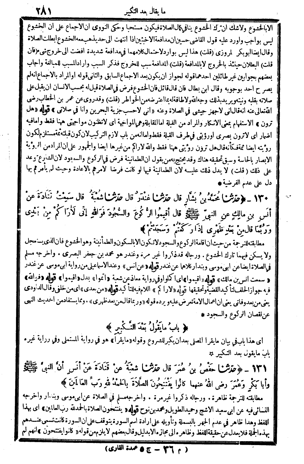 131 - (حَدثنَا حَفْص بن عمر قَالَ حَدثنَا شُعْبَة عَن قَتَادَة عَن أنس أَن النَّبِي - صَلَّى اللَّهُ عَلَيْهِ وَسَلَّم َ - وَأَبا بكر وَعمر رَضِي الله عَنْهُمَا كَانُوا يفتتحون الصَّلَاة بِالْحَمْد لله رب الْعَالمين) مطابقته للتَّرْجَمَة ظَاهِرَة. وَرِجَاله ذكرُوا غير مرّة. وَأخرجه مُسلم فِي الصَّلَاة عَن أبي مُوسَى وَبُنْدَار وَأخرجه النَّسَائِيّ فِيهِ عَن أبي سعيد الْأَشَج وَحميد الطَّوِيل وَمُحَمّد بن نوح قَوْله " يفتتحون الصَّلَاة بِالْحَمْد لله رب الْعَالمين " أَي بِهَذَا اللَّفْظ وَهَذَا ظَاهر فِي عدم الْجَهْر بالبسملة وتأويله على إِرَادَة اسْم السُّورَة يتَوَقَّف على أَن السُّورَة كَانَت تسمى عِنْدهم بِهَذِهِ الْجُمْلَة فَلَا يعدل عَن حَقِيقَة اللَّفْظ وَظَاهره إِلَى مجازه إِلَّا بِدَلِيل وَقَالَ بَعضهم لَا يلْزم من قَوْله " كَانُوا يفتتحون " أَنهم لم