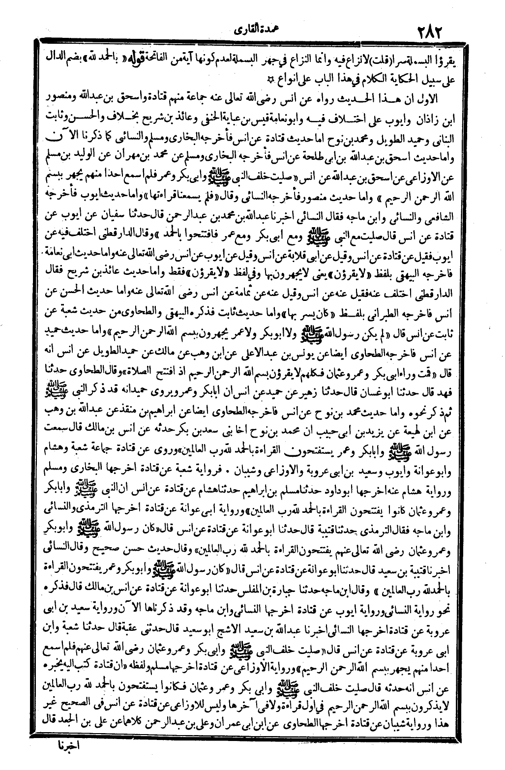 يقرؤا الْبَسْمَلَة سرا (قلت) لَا نزاع فِيهِ وَإِنَّمَا النزاع فِي جهر الْبَسْمَلَة لعدم كَونهَا آيَة من الْفَاتِحَة قَوْله " بِالْحَمْد لله " بِضَم الدَّال على سَبِيل الْحِكَايَة الْكَلَام فِي هَذَا الْبَاب على أنوع الأول أَنَّهَا هَذَا الحَدِيث رَوَاهُ عَن أنس رَضِي الله تَعَالَى عَنهُ جمَاعَة مِنْهُم قَتَادَة وَإِسْحَق بن عبد الله وَمَنْصُور بن زَاذَان وَأَيوب على اخْتِلَاف فِيهِ وَأَبُو نعَامَة قيس بن عَبَايَة الْحَنَفِيّ وعائذ بن شُرَيْح بِخِلَاف وَالْحسن وثابت الْبنانِيّ وَحميد الطَّوِيل وَمُحَمّد بن نوح أما حَدِيث قَتَادَة عَن أنس فَأخْرجهُ البُخَارِيّ وَمُسلم وَالنَّسَائِيّ كَمَا ذكرنَا الْآن وَأما حَدِيث إِسْحَق بن عبد الله بن أبي طَلْحَة عَن أنس فَأخْرجهُ البُخَارِيّ وَمُسلم عَن مُحَمَّد بن مهْرَان عَن الْوَلِيد بن مُسلم عَن الْأَوْزَاعِيّ عَن إِسْحَق بن عبد الله عَن أنس " صليت خلف النَّبِي - صَلَّى اللَّهُ عَلَيْهِ وَسَلَّم َ - وَأبي بكر وَعمر فَلم أسمع أحدا مِنْهُم يجْهر بِبسْم الله الرَّحْمَن الرَّحِيم " وَأما حَدِيث مَنْصُور فَأخْرجهُ النَّسَائِيّ وَقَالَ " فَلم يسمعنا قرَاءَتهَا " وَأما حَدِيث أَيُّوب فَأخْرجهُ الشَّافِعِي وَالنَّسَائِيّ وَابْن مَاجَه فَقَالَ النَّسَائِيّ أخبرنَا عبد الله بن مُحَمَّد بن عبد الرَّحْمَن قَالَ حَدثنَا سُفْيَان عَن أَيُّوب عَن قَتَادَة عَن أنس قَالَ " صليت مَعَ النَّبِي - صَلَّى اللَّهُ عَلَيْهِ وَسَلَّم َ - وَمَعَ أبي بكر وَمَعَ عمر فافتتحوا بِالْحَمْد " وَقَالَ الدَّارَقُطْنِيّ اخْتلف فِيهِ عَن أَيُّوب فَقيل عَن قَتَادَة عَن أنس وَقيل عَن أبي قلَابَة عَن أنس وَقيل عَن أَيُّوب عَن أنس رَضِي الله تَعَالَى عَنهُ وَأما حَدِيث أبي نعَامَة فَأخْرجهُ الْبَيْهَقِيّ بِلَفْظ " لَا يقرؤن " يَعْنِي لَا يجهرون بهَا وَفِي لفظ " لَا يقرؤن " فَقَط وَأما حَدِيث عَائِذ بن شرح فَقَالَ الدَّارَقُطْنِيّ اخْتلف عَنهُ فَقيل عَنهُ عَن أنس وَقيل عَنهُ عَن ثُمَامَة عَن أنس رَضِي الله تَعَالَى عَنهُ وَأما حَدِيث الْحسن عَن أنس فَأخْرجهُ الطَّبَرَانِيّ بِلَفْظ " كَانَ يسر بهَا " وَأما حَدِيث ثَابت فَذكره الْبَيْهَقِيّ والطَّحَاوِي من حَدِيث شُعْبَة عَن ثَابت عَن أنس قَالَ " لم يكن رَسُول الله - صَلَّى اللَّهُ عَلَيْهِ وَسَلَّم َ - وَلَا أَبُو بكر وَلَا عمر يجهرون بِبسْم الله الرَّحْمَن الرَّحِيم " وَأما حَدِيث حميد عَن أنس فَأخْرجهُ الطَّحَاوِيّ أَيْضا عَن يُونُس بن عبد الْأَعْلَى عَن ابْن وهب عَن مَالك عَن حميد الطَّوِيل عَن أنس أَنه قَالَ " قُمْت وَرَاء أبي بكر وَعمر وَعُثْمَان فكلهم لَا يقرؤن بِسم الله الرَّحْمَن الرَّحِيم إِذْ افْتتح الصَّلَاة " وَقَالَ الطَّحَاوِيّ حَدثنَا فَهد قَالَ حَدثنَا أَبُو غَسَّان قَالَ حَدثنَا زُهَيْر عَن حميد عَن أنس أَن أَبَا بكر وَعمر ويروى حميد أَنه قد ذكر النَّبِي - صَلَّى اللَّهُ عَلَيْهِ وَسَلَّم َ - ثمَّ ذكر نَحوه وَأما حَدِيث مُحَمَّد بن نوح عَن أنس فَأخْرجهُ الطَّحَاوِيّ أَيْضا عَن إِبْرَاهِيم بن منقذ عَن عبد الله بن وهب عَن أبي لَهِيعَة عَن يزِيد بن أبي حبيب أَن مُحَمَّد بن نوح أَخا بني سعد بن بكر حَدثهُ عَن أنس بن مَالك قَالَ سَمِعت رَسُول الله - صَلَّى اللَّهُ عَلَيْهِ وَسَلَّم َ - وَأَبا بكر وَعمر يستفتحون الْقِرَاءَة بِالْحَمْد لله رب الْعَالمين " وروى عَن قَتَادَة جمَاعَة شُعْبَة وَهِشَام وَأَبُو عوَانَة وَأَيوب وَسَعِيد بن أبي عرُوبَة وَالْأَوْزَاعِيّ وشيبان. فرواية شُعْبَة عَن قَتَادَة أخرجهَا البُخَارِيّ وَمُسلم وَرِوَايَة هِشَام عَنهُ أخرجهَا أَبُو دَاوُد حَدثنَا مُسلم بن إِبْرَاهِيم حَدثنَا هِشَام عَن قَتَادَة عَن أنس أَن النَّبِي - صَلَّى اللَّهُ عَلَيْهِ وَسَلَّم َ - وَأَبا بكر وَعمر وَعُثْمَان كَانُوا يفتتحون الْقِرَاءَة بِالْحَمْد لله رب الْعَا