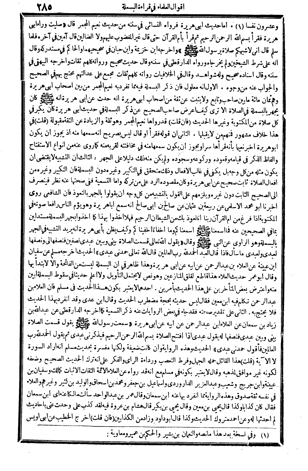 وَعِشْرُونَ نفسا. أما حَدِيث أبي هُرَيْرَة فَرَوَاهُ النَّسَائِيّ فِي سنَنه من حَدِيث نعيم المجمر قَالَ " صليت وَرَاء أبي هُرَيْرَة فَقَرَأَ بِسم الله الرَّحْمَن الرَّحِيم ثمَّ قَرَأَ بِأم الْقُرْآن حَتَّى قَالَ غير المغضوب عَلَيْهِم وَلَا الضَّالّين قَالَ آمين فِي آخِره فَلَمَّا سلم قَالَ إِنِّي لأشبهكم صَلَاة برَسُول الله - صَلَّى اللَّهُ عَلَيْهِ وَسَلَّم َ - " وَأخرجه ابْن خُزَيْمَة وَابْن حبَان فِي صَحِيحَيْهِمَا وَالْحَاكِم فِي مُسْتَدْركه وَقَالَ أَنه على شَرط الشَّيْخَيْنِ وَلم يخرجَاهُ وَرَوَاهُ الدَّارَقُطْنِيّ فِي سنَنه وَقَالَ حَدِيث صَحِيح وَرُوَاته كلهم ثِقَات وأخره الْبَيْهَقِيّ فِي سنَنه وَقَالَ إِسْنَاده صَحِيح وَله شَوَاهِد وَقَالَ فِي الخلافيات رُوَاته كلهم ثِقَات مجمع على عدالتهم مُحْتَج بهم فِي الصَّحِيح وَالْجَوَاب عَنهُ من وُجُوه. الأول أَنهم مَعْلُول فَإِن ذكر الْبَسْمَلَة فِيهِ مِمَّا تفرد بِهِ نعيم المجمر من بَين أَصْحَاب أبي هُرَيْرَة وهم ثَمَان مائَة مَا بَين صَاحب وتابع وَلَا يثبت عَن ثِقَة من أَصْحَاب أبي هُرَيْرَة أَنه حدث عَن أبي هُرَيْرَة أَنه - صَلَّى اللَّهُ عَلَيْهِ وَسَلَّم َ - كَانَ يجْهر بالبسملة فِي الصَّلَاة أَلا ترى كَيفَ أعرض صَاحب الصَّحِيح عَن ذكر الْبَسْمَلَة فِي حَدِيث أبي هُرَيْرَة كَانَ يكبر فِي كل صَلَاة من الْمَكْتُوبَة وَغَيرهَا الحَدِيث (فَإِن قلت) قد رَوَاهَا نعيم المجمر وَهُوَ ثِقَة وَالزِّيَادَة عَن الثِّقَة مَقْبُولَة (قلت) فِي هَذَا خلاف مَشْهُور فَمنهمْ من لَا يقبلهَا. الثَّانِي أَن قَوْله فَقَرَأَ أَو قَالَ لَيْسَ بِصَرِيح أَنه سَمعهَا مِنْهُ إِذْ يجوز أَن يكون أَبُو هُرَيْرَة أخبر نعيما بِأَنَّهُ قَرَأَهَا سرا وَيجوز أَن يكون سَمعهَا مِنْهُ فِي مخافتته لقُرْبه مِنْهُ كَمَا روى عَنهُ من أَنْوَاع الاستفتاح وألفاظ الذّكر فِي قِيَامه وقعوده وركوعه وَسُجُوده وَلم يكن مِنْهُ ذَلِك دَلِيلا على الْجَهْر. الثَّالِث أَن التَّشْبِيه لَا يَقْتَضِي أَن يكون مثله من كل وَجه بل يَكْفِي فِي غَالب الْأَفْعَال وَذَلِكَ مُتَحَقق فِي التَّكْبِير وَغَيره دون الْبَسْمَلَة فَإِن التَّكْبِير وَغَيره من أَفعَال الصَّلَاة ثَابت صَحِيح عَن أبي هُرَيْرَة وَكَانَ مَقْصُوده الرَّد على من تَركه وَأما التَّسْمِيَة فَفِي صِحَّتهَا عَنهُ نظر فَيَنْصَرِف إِلَى الصَّحِيح الثَّابِت دون غَيره ويلزمهم على القَوْل بالتشبيه من كل وَجه أَن يَقُولُوا بالجهر بالتعوذ فَإِن الشَّافِعِي روى أخبرنَا أَبُو مُحَمَّد الْأَسْلَمِيّ عَن ربيعَة بن عُثْمَان عَن صَالح بن أبي صَالح أَنه سمع أَبَا هُرَيْرَة وَهُوَ يؤم النَّاس رَافعا صَوته فِي الْمَكْتُوبَة إِذا فرغ من أم الْقُرْآن رَبنَا إِنَّا نَعُوذ بك من الشَّيْطَان الرَّجِيم فَهَلا أخذُوا بِهَذَا كَمَا أخذُوا بجهر الْبَسْمَلَة مستدلين بِمَا فِي الصَّحِيحَيْنِ عَنهُ فَمَا أسمعنا - صَلَّى اللَّهُ عَلَيْهِ وَسَلَّم َ - أسمعناكم وَمَا أخفانا أخفيناكم وَكَيف يظنّ بِأبي هُرَيْرَة أَنه يُرِيد التَّشْبِيه فِي الْجَهْر بالبسملة وَهُوَ الرَّاوِي عَن النَّبِي - صَلَّى اللَّهُ عَلَيْهِ وَسَلَّم َ - وَقَالَ " يَقُول الله تَعَالَى قسمت الصَّلَاة بيني وَبَين عَبدِي نِصْفَيْنِ فنصفها لي وَنِصْفهَا لعبدي ولعبدي مَا سَأَلَ فَإِذا قَالَ العَبْد الْحَمد لله رب الْعَالمين قَالَ الله تَعَالَى حمدني عَبدِي " الحَدِيث أخرجه مُسلم عَن سُفْيَان بن عُيَيْنَة عَن الْعَلَاء بن عبد الرَّحْمَن عَن أَبِيه عَن أبي هُرَيْرَة وَهَذَا ظَاهر فِي أَن الْبَسْمَلَة لَيست من الْفَاتِحَة وَإِلَّا لابتدأ بهَا وَقَالَ أَبُو عمر حَدِيث الْعَلَاء هَذَا قَاطع لقلق المنازعين وَهُوَ نصر لَا يحْتَمل التَّأْوِيل وَلَا أعلم حَدِيثا فِي سُقُوط الْبَسْمَلَة أبين مِنْهُ وَاعْترض بعض الْمُتَ