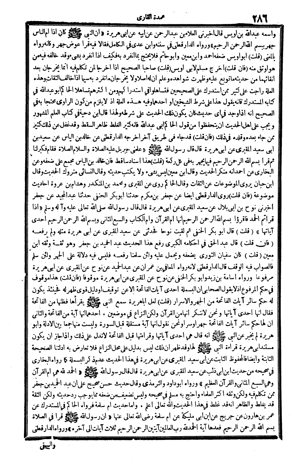 واسْمه عبد الله بن أويس قَالَ أَخْبرنِي الْعَلَاء بن عبد الرَّحْمَن عَن أَبِيه عَن أبي هُرَيْرَة " أَن النَّبِي - صَلَّى اللَّهُ عَلَيْهِ وَسَلَّم َ - كَانَ إِذا أم النَّاس جهر بِبسْم الله الرَّحْمَن الرَّحِيم " وَرَوَاهُ الدَّارَقُطْنِيّ فِي سنَنه وَابْن عدي فِي الْكَامِل فَقَالَا فِيهِ قَرَأَ عوض جهر وَكَأَنَّهُ رَوَاهُ بِالْمَعْنَى (قلت) أَبُو أويس ضعفه أَحْمد وَابْن معِين وَأَبُو حَاتِم فَلَا يحْتَج بِمَا انْفَرد بِهِ فَكيف إِذا انْفَرد بِشَيْء وَقد خَالفه فِيهِ من هُوَ أوثق مِنْهُ (فَإِن قلت) أخرج مُسلم لأبي أويس (قلت) صاحبا الصَّحِيح إِذا أخرجَا لمن تكلم فِيهِ إِنَّمَا يخرجَانِ بعد إنقائهما من حَدِيثه مَا توبع عَلَيْهِ وَظَهَرت شواهده وَعلم أَن لَهُ أصلا وَلَا يخرجَانِ مَا تفرد بِهِ سِيمَا إِذا خَالف الثِّقَات وَهَذِه الْعلَّة راجت على كثير مِمَّن استدرك على الصَّحِيحَيْنِ فتساهلوا فِي استدراكهم وَمن أَكْثَرهم تساهلا الْحَاكِم أَبُو عبد الله فِي كِتَابه الْمُسْتَدْرك فَإِنَّهُ يَقُول هَذَا على شَرط الشَّيْخَيْنِ أَو أَحدهمَا وَفِيه هَذِه الْعلَّة إِذْ لَا يلْزم من كَون الرَّاوِي محتجا بِهِ فِي الصَّحِيح أَنه إِذا وجد فِي أَي حَدِيث كَانَ يكون ذَلِك الحَدِيث على شَرطه وَلِهَذَا قَالَ ابْن دحْيَة فِي كتاب الْعلم الْمَشْهُور وَيجب على أهل الحَدِيث أَن يتحفظوا من قَول الْحَاكِم أبي عبد الله فَإِنَّهُ كثير الْغَلَط ظَاهر السقط وَقد غفل عَن ذَلِك كثير مِمَّن جَاءَ بعده وقلده فِي ذَلِك (فَإِن قلت) قد جَاءَ فِي طَرِيق آخر أخرجه الدَّارَقُطْنِيّ عَن خَالِد بن الياس عَن سعيد بن أبي سعيد المَقْبُري عَن أبي هُرَيْرَة قَالَ قَالَ رَسُول الله - صَلَّى اللَّهُ عَلَيْهِ وَسَلَّم َ - " عَلمنِي جِبْرِيل عَلَيْهِ الصَّلَاة وَالسَّلَام الصَّلَاة فَقَامَ فَكبر لنا ثمَّ قَرَأَ بِسم الله الرَّحْمَن الرَّحِيم فِيمَا يجْهر بِهِ فِي كل رَكْعَة " (قلت) هَذَا إِسْنَاد سَاقِط فَإِن خَالِد بن الياس مجمع على ضعفه وَعَن البُخَارِيّ عَن أَحْمد أَنه مُنكر الحَدِيث وَقَالَ ابْن معِين لَيْسَ بِشَيْء وَلَا يكْتب حَدِيثه وَقَالَ النَّسَائِيّ مَتْرُوك الحَدِيث وَقَالَ ابْن حبَان يروي الموضوعات عَن الثِّقَات وَقَالَ الْحَاكِم روى عَن المَقْبُري وَمُحَمّد بن الْمُنْكَدر وَهِشَام بن عُرْوَة أَحَادِيث مَوْضُوعَة (فَإِن قلت) روى الدَّارَقُطْنِيّ أَيْضا عَن جَعْفَر بن مكرم حَدثنَا أَبُو بكر الْحَنَفِيّ حَدثنَا عبد الْمجِيد عَن جَعْفَر أَخْبرنِي نوح بن أبي بِلَال عَن سعيد المَقْبُري عَن أبي هُرَيْرَة قَالَ قَالَ رَسُول الله - صَلَّى اللَّهُ عَلَيْهِ وَسَلَّم َ - " إِذا قَرَأْتُمْ الْحَمد فاقرؤا بِسم الله الرَّحْمَن الرَّحِيم إِنَّهَا أم الْقُرْآن وَأم الْكتاب والسبع المثاني وبسم الله الرَّحْمَن الرَّحِيم إِحْدَى آياتها " (قلت) قَالَ أَبُو بكر الْحَنَفِيّ ثمَّ لقِيت نوحًا فَحَدثني عَن سعيد المَقْبُري عَن أبي هُرَيْرَة مثله وَلم يرفعهُ (فَإِن قلت) قَالَ عبد الْحق فِي أَحْكَامه الْكُبْرَى رفع هَذَا الحَدِيث عبد الحميد بن جَعْفَر وَهُوَ ثِقَة وَثَّقَهُ ابْن معِين (قلت) كَانَ سُفْيَان الثَّوْريّ يُضعفهُ وَيحمل عَلَيْهِ وَلَئِن سلمنَا رَفعه فَلَيْسَ فِيهِ دلَالَة على الْجَهْر وَلَئِن سلم فَالصَّوَاب فِيهِ الْوَقْف قَالَ الدَّارَقُطْنِيّ لِأَنَّهُ رَوَاهُ الْمعَافي بن عمرَان عَن عبد الحميد عَن نوح عَن المَقْبُري عَن أبي هُرَيْرَة مَرْفُوعا وَرَوَاهُ أُسَامَة بن زيد وَأَبُو بكر الْحَنَفِيّ عَن نوح عَن المَقْبُري عَن أبي هُرَيْرَة مَوْقُوفا (فَإِن قلت) هَذَا مَوْقُوف فِي حكم الْمَرْفُوع إِذْ لَا يَقُول الصَّحَابِيّ أَن الْبَسْمَلَة إِحْدَى آيَات الْفَاتِحَة إِلَّا عَن تَوْقِيف أَو دَلِيل قوي ظهر لَهُ فحين إِذن يكون لَهُ حكم سَائِر آيَات الْفَاتِحَة من ال