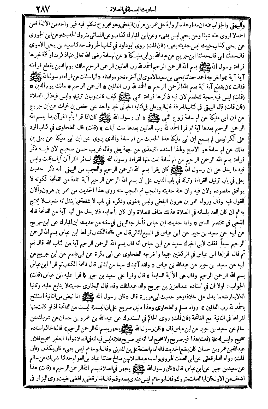 وَالْبَيْهَقِيّ وَالْجَوَاب عَنهُ أَن مدَار هَذِه الرِّوَايَة على عمر بن هَارُون الْبَلْخِي وَهُوَ مَجْرُوح تكلم فِيهِ غير وَاحِد من الْأَئِمَّة فَعَن أَحْمد لَا أروي عَنهُ شَيْئا وَعَن يحيى لَيْسَ بِشَيْء وَعَن ابْن الْمُبَارك كَذَّاب وَعَن النَّسَائِيّ مَتْرُوك الحَدِيث وَعَن ابْن الْجَوْزِيّ عَن يحيى كَذَّاب خَبِيث لَيْسَ حَدِيثه بِشَيْء (فَإِن قلت) روى أَبُو دَاوُد فِي كتاب الْحُرُوف حَدثنَا سعيد بن يحيى الْأمَوِي قَالَ حَدثنَا أبي قَالَ حَدثنَا ابْن جريج عَن عبد الله بن أبي مليكَة " عَن أم سَلمَة رَضِي الله تَعَالَى عَنْهَا ذكرت أَو كلمة غَيرهَا قِرَاءَة رَسُول الله - صَلَّى اللَّهُ عَلَيْهِ وَسَلَّم َ - بِسم الله الرَّحْمَن الرَّحِيم الْحَمد لله رب الْعَالمين الرَّحْمَن الرَّحِيم مَالك يَوْم الدّين يقطع قِرَاءَته آيَة آيَة " وَأخرجه أَحْمد حَدثنَا يحيى بن سعيد الْأمَوِي إِلَى آخِره نَحوه وَلَفظه " أَنَّهَا سُئِلت عَن قِرَاءَة رَسُول الله - صَلَّى اللَّهُ عَلَيْهِ وَسَلَّم َ - فَقَالَت كَانَ يقطع آيَة آيَة بِسم الله الرَّحْمَن الرَّحِيم الْحَمد لله رب الْعَالمين الرَّحْمَن الرَّحِيم مَالك يَوْم الدّين " (قلت) لَيْسَ فِيهِ حجَّة للخصم لِأَن فِيهِ ذكرهَا قِرَاءَة النَّبِي - صَلَّى اللَّهُ عَلَيْهِ وَسَلَّم َ - كَيفَ كَانَت وَبَيَان ترتيله وَلَيْسَ فِيهِ ذكر الصَّلَاة (فَإِن قلت) قَالَ الْبَيْهَقِيّ فِي كتاب الْمعرفَة قَالَ الْبُوَيْطِيّ فِي كِتَابه أَخْبرنِي غير وَاحِد عَن حَفْص بن غياث عَن ابْن جريج عَن ابْن أبي مليكَة عَن أم سَلمَة زوج النَّبِي - صَلَّى اللَّهُ عَلَيْهِ وَسَلَّم َ - " أَن رَسُول الله - صَلَّى اللَّهُ عَلَيْهِ وَسَلَّم َ - كَانَ إِذا قَرَأَ بِأم الْقُرْآن بَدَأَ بِبسْم الله الرَّحْمَن الرَّحِيم يعدها آيَة ثمَّ قَرَأَ الْحَمد لله رب الْعَالمين يعدها سِتّ آيَات " (قلت) قَالَ الطَّحَاوِيّ فِي كتاب الرَّد على الْكَرَابِيسِي لم يسمع ابْن أبي مليكَة هَذَا الحَدِيث من أم سَلمَة وَالَّذِي يروي عَن ابْن أبي مليكَة عَن يعلى بن مَالك عَن أم سَلمَة هُوَ الْأَصَح وَلِهَذَا أسْندهُ التِّرْمِذِيّ من جِهَة يعلى وَقَالَ غَرِيب حسن صَحِيح لِأَن فِيهِ ذكر قِرَاءَة بِسم الله الرَّحْمَن الرَّحِيم من أم سَلمَة نعت مِنْهَا لقِرَاءَة رَسُول الله - صَلَّى اللَّهُ عَلَيْهِ وَسَلَّم َ - لسَائِر الْقُرْآن كَيفَ كَانَت وَلَيْسَ فِيهِ مَا يدل على أَن رَسُول الله - صَلَّى اللَّهُ عَلَيْهِ وَسَلَّم َ - كَانَ يقْرَأ بِسم الله الرَّحْمَن الرَّحِيم وَالْعجب من الْبَيْهَقِيّ أَنه ذكر حَدِيث يعلى فِي بَاب ترتيل الْقِرَاءَة وَتَركه فِي بَاب الدَّلِيل على أَن بِسم الله الرَّحْمَن الرَّحِيم آيَة تَامَّة من الْفَاتِحَة لكَونه لَا يُوَافق مَقْصُوده وَلِأَن فِيهِ بَيَان عِلّة حَدِيثه وَالْعجب ثمَّ الْعجب مِنْهُ رُوِيَ هَذَا من عمر بن هَارُون وألان القَوْل فِيهِ وَقَالَ وَرَوَاهُ عمر بن هَارُون الْبَلْخِي وَلَيْسَ بِالْقَوِيّ وَذكره فِي بَاب لَا شُفْعَة فِيمَا ينْقل أَنه ضَعِيف لَا يحْتَج بِهِ ثمَّ أَن كَانَ الْعد بِلِسَانِهِ فِي الصَّلَاة فَذَلِك منَاف للصَّلَاة وَإِن كَانَ بأصابعه فَلَا يدل على أَنَّهَا آيَة من الْفَاتِحَة قَالَه الذَّهَبِيّ فِي مُخْتَصر السّنَن وَأما حَدِيث ابْن عَبَّاس فَأخْرجهُ الْبَيْهَقِيّ فِي سنَنه من حَدِيث ابْن الْمُبَارك عَن ابْن جريج عَن أَبِيه عَن سعيد بن جُبَير عَن ابْن عَبَّاس فِي السَّبع المثاني قَالَ هِيَ فَاتِحَة الْكتاب قَرَأَهَا ابْن عَبَّاس بِسم الله الرَّحْمَن الرَّحِيم سبعا فَقلت لأبي أخْبرك سعيد عَن ابْن عَبَّاس أَنه قَالَ بِسم الله الرَّحْمَن الرَّحِيم آيَة من كتاب الله قَالَ نعم ثمَّ قَالَ قَرَأَهَا ابْن عَبَّاس فِي الرَّكْعَتَيْنِ جَمِيعًا وَأخرجه الطَّحَاوِيّ عَن أبي بكرَة عَن أبي عَاصِم 