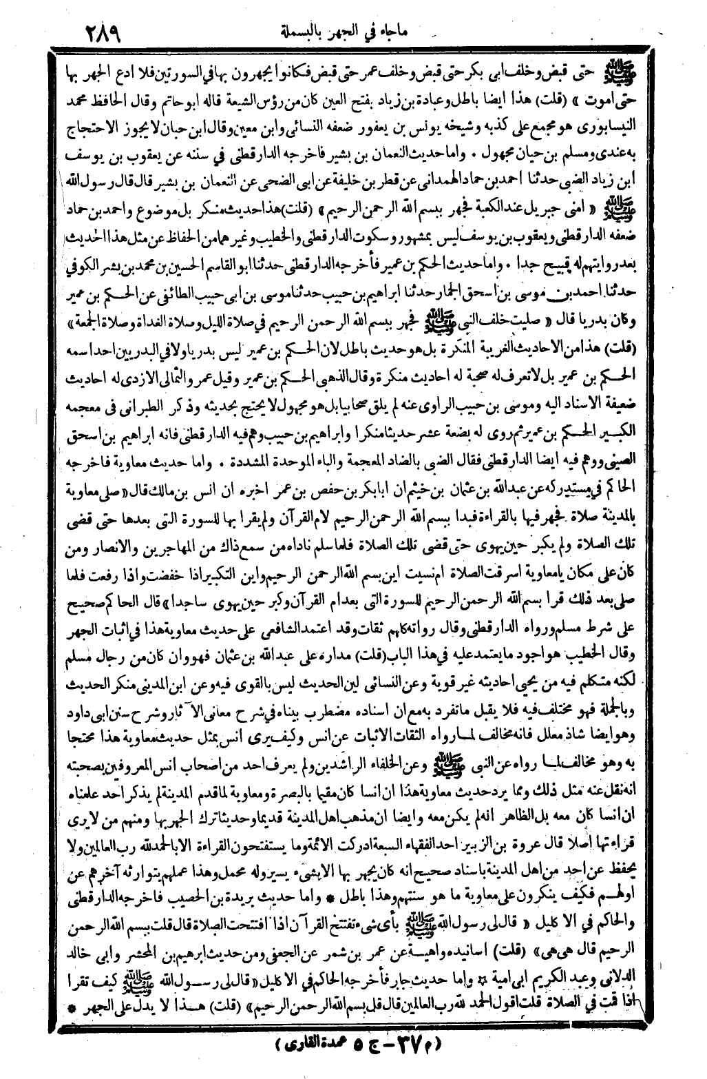 - صَلَّى اللَّهُ عَلَيْهِ وَسَلَّم َ - حَتَّى قبض وَخلف أبي بكر حَتَّى قبض وَخلف عمر حَتَّى قبض فَكَانُوا يجهرون بهَا فِي السورتين فَلَا أدع الْجَهْر بهَا حَتَّى أَمُوت " (قلت) هَذَا أَيْضا بَاطِل وَعبادَة بن زِيَاد بِفَتْح الْعين كَانَ من رُؤْس الشِّيعَة قَالَه أَبُو حَاتِم وَقَالَ الْحَافِظ مُحَمَّد النَّيْسَابُورِي هُوَ مجمع على كذبه وَشَيْخه يُونُس بن يَعْفُور ضعفه النَّسَائِيّ وَابْن معِين وَقَالَ ابْن حبَان لَا يجوز الِاحْتِجَاج بِهِ عِنْدِي وَمُسلم بن حَيَّان مَجْهُول. وَأما حَدِيث النُّعْمَان بن بشير فَأخْرجهُ الدَّارَقُطْنِيّ فِي سنَنه عَن يَعْقُوب بن يُوسُف ابْن زِيَاد الضَّبِّيّ حَدثنَا أَحْمد بن حَمَّاد الْهَمدَانِي عَن قطر بن خَليفَة عَن أبي الضُّحَى عَن النُّعْمَان بن بشير قَالَ قَالَ رَسُول الله - صَلَّى اللَّهُ عَلَيْهِ وَسَلَّم َ - " أمني جِبْرِيل عِنْد الْكَعْبَة فجهر بِبسْم الله الرَّحْمَن الرَّحِيم " (قلت) هَذَا حَدِيث مُنكر بل مَوْضُوع وَأحمد بن حَمَّاد ضعفه الدَّارَقُطْنِيّ وَيَعْقُوب بن يُوسُف لَيْسَ بِمَشْهُور وسكوت الدَّارَقُطْنِيّ والخطيب وَغَيرهمَا من الْحفاظ عَن مثل هَذَا الحَدِيث بعد روايتهم لَهُ قَبِيح جدا. وَأما حَدِيث الحكم بن عُمَيْر فَأخْرجهُ الدَّارَقُطْنِيّ حَدثنَا أَبُو الْقَاسِم الْحُسَيْن بن مُحَمَّد بن بشر الْكُوفِي حَدثنَا أَحْمد بن مُوسَى بن اسحق الْجمار حَدثنَا إِبْرَاهِيم بن حبيب حَدثنَا مُوسَى بن أبي حبيب الطَّائِفِي عَن الحكم بن عُمَيْر وَكَانَ بَدْرِيًّا قَالَ " صليت خلف النَّبِي - صَلَّى اللَّهُ عَلَيْهِ وَسَلَّم َ - فجهر بِبسْم الله الرَّحْمَن الرَّحِيم فِي صَلَاة اللَّيْل وَصَلَاة الْغَدَاة وَصَلَاة الْجُمُعَة " (قلت) هَذَا من الْأَحَادِيث الغريبة الْمُنكرَة بل هُوَ حَدِيث بَاطِل لِأَن الحكم بن عُمَيْر لَيْسَ بَدْرِيًّا وَلَا فِي الْبَدْرِيِّينَ أحد اسْمه الحكم بن عُمَيْر بل لَا تعرف لَهُ صُحْبَة لَهُ أَحَادِيث مُنكرَة وَقَالَ الذَّهَبِيّ الحكم بن عُمَيْر وَقيل عمر والثمالي الْأَزْدِيّ لَهُ أَحَادِيث ضَعِيفَة الْإِسْنَاد إِلَيْهِ ومُوسَى بن حبيب الرَّاوِي عَنهُ لم يلق صحابيا بل هُوَ مَجْهُول لَا يحْتَج بحَديثه وَذكر الطَّبَرَانِيّ فِي مُعْجَمه الْكَبِير الحكم بن عُمَيْر ثمَّ روى لَهُ بضعَة عشر حَدِيثا مُنْكرا وَإِبْرَاهِيم بن حبيب وهم فِيهِ الدَّارَقُطْنِيّ فَإِنَّهُ إِبْرَاهِيم بن اسحق الصيني وَوهم فِيهِ أَيْضا الدَّارَقُطْنِيّ فَقَالَ الضَّبِّيّ بالضاد الْمُعْجَمَة وَالْبَاء الْمُوَحدَة الْمُشَدّدَة. وَأما حَدِيث مُعَاوِيَة فَأخْرجهُ الْحَاكِم فِي مُسْتَدْركه عَن عبد الله بن عُثْمَان بن خَيْثَم أَن أَبَا بكر بن حَفْص بن عمر أخبرهُ أَن أنس بن مَالك قَالَ " صلى مُعَاوِيَة بِالْمَدِينَةِ صَلَاة فجهر فِيهَا بِالْقِرَاءَةِ فَبَدَأَ بِبسْم الله الرَّحْمَن الرَّحِيم لأم الْقُرْآن وَلم يقْرَأ بهَا للسورة الَّتِي بعْدهَا حَتَّى قضى تِلْكَ الصَّلَاة وَلم يكبر حِين يهوي حَتَّى قضى تِلْكَ الصَّلَاة فَلَمَّا سلم ناداه من سمع ذَاك من الْمُهَاجِرين وَالْأَنْصَار وَمن كَانَ على مَكَان يَا مُعَاوِيَة أسرقت الصَّلَاة أم نسيت أَيْن بِسم الله الرَّحْمَن الرَّحِيم وَأَيْنَ التَّكْبِير إِذا خفضت وَإِذا رفعت فَلَمَّا صلى بعد ذَلِك قَرَأَ بِسم الله الرَّحْمَن الرَّحِيم للسورة الَّتِي بعد أم الْقُرْآن وَكبر حِين يهوي سَاجِدا " قَالَ الْحَاكِم صَحِيح على شَرط مُسلم وَرَوَاهُ الدَّارَقُطْنِيّ وَقَالَ رُوَاته كلهم ثِقَات وَقد اعْتمد الشَّافِعِي على حَدِيث مُعَاوِيَة هَذَا فِي إِثْبَات الْجَهْر وَقَالَ الْخَطِيب هُوَ أَجود مَا يعْتَمد عَلَيْهِ فِي هَذَا الْبَاب (قلت) مَدَاره على عبد الله بن عُثْمَان فَهُوَ وَإِن كَانَ من رجال مُسلم لكنه مُتَكَلم فِيهِ من يحيى أَحَادِيثه 