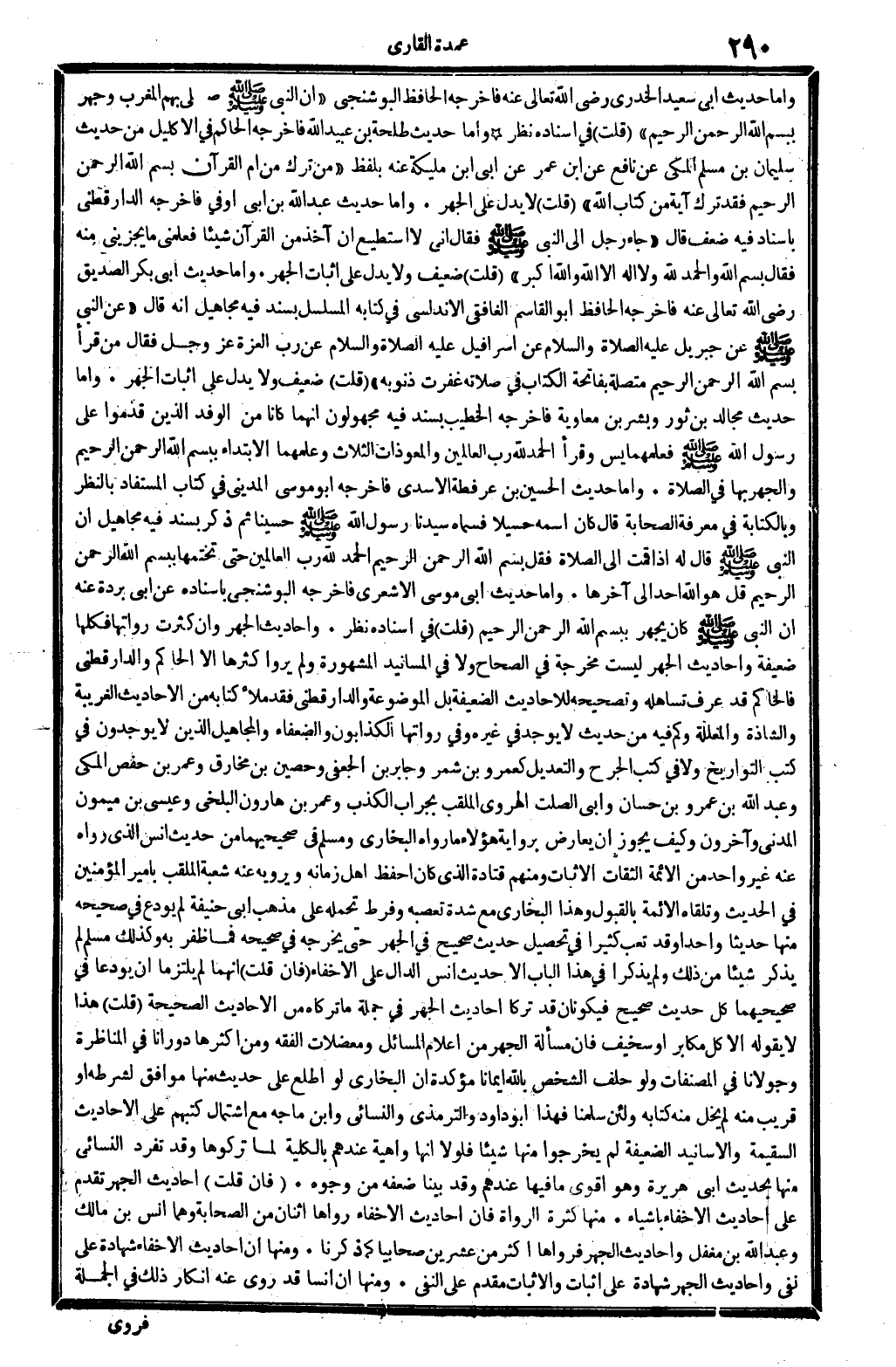 وَأما حَدِيث أبي سعيد الْخُدْرِيّ رَضِي الله تَعَالَى عَنهُ فَأخْرجهُ الْحَافِظ البوشنجي " أَن النَّبِي - صَلَّى اللَّهُ عَلَيْهِ وَسَلَّم َ - صلى بهم الْمغرب وجهر بِبسْم الله الرَّحْمَن الرَّحِيم " (قلت) فِي إِسْنَاده نظر وَأما حَدِيث طَلْحَة بن عبيد الله فَأخْرجهُ الْحَاكِم فِي الإكليل من حَدِيث سُلَيْمَان بن مُسلم الْمَكِّيّ عَن نَافِع عَن ابْن عمر عَن أبي ابْن مليكَة عَنهُ بِلَفْظ " من ترك من أم الْقُرْآن بِسم الله الرَّحْمَن الرَّحِيم فقد ترك آيَة من كتاب الله " (قلت) لَا يدل على الْجَهْر. وَأما حَدِيث عبد الله بن أبي أوفى فَأخْرجهُ الدَّارَقُطْنِيّ بِإِسْنَاد فِيهِ ضعف قَالَ " جَاءَ رجل إِلَى النَّبِي - صَلَّى اللَّهُ عَلَيْهِ وَسَلَّم َ - فَقَالَ إِنِّي لَا أَسْتَطِيع أَن آخذ من الْقُرْآن شَيْئا فعلمني مَا يجزيني مِنْهُ فَقَالَ بِسم الله وَالْحَمْد لله وَلَا إِلَه إِلَّا الله وَالله أكبر " (قلت) ضَعِيف وَلَا يدل على إِثْبَات الْجَهْر. وَأما حَدِيث أبي بكر الصّديق رَضِي الله تَعَالَى عَنهُ فَأخْرجهُ الْحَافِظ أَبُو الْقَاسِم الغافقي الأندلسي فِي كِتَابه المسلسل بِسَنَد فِيهِ مَجَاهِيل أَنه قَالَ " عَن النَّبِي - صَلَّى اللَّهُ عَلَيْهِ وَسَلَّم َ - عَن جِبْرِيل عَلَيْهِ الصَّلَاة وَالسَّلَام عَن إسْرَافيل عَلَيْهِ الصَّلَاة وَالسَّلَام عَن رب الْعِزَّة عز وَجل فَقَالَ من قَرَأَ بِسم الله الرَّحْمَن الرَّحِيم مُتَّصِلَة بِفَاتِحَة الْكتاب فِي صلَاته غفرت ذنُوبه " (قلت) ضَعِيف وَلَا يدل على إِثْبَات الْجَهْر. وَأما حَدِيث مجَالد بن ثَوْر وَبشر بن مُعَاوِيَة فَأخْرجهُ الْخَطِيب بِسَنَد فِيهِ مَجْهُولُونَ أَنَّهُمَا كَانَا من الْوَفْد الَّذين قدمُوا على رَسُول الله - صَلَّى اللَّهُ عَلَيْهِ وَسَلَّم َ - فعلمهما يس وَقَرَأَ الْحَمد لله رب الْعَالمين والمعوذات الثَّلَاث وعلمهما الِابْتِدَاء بِبسْم الله الرَّحْمَن الرَّحِيم والجهر بهَا فِي الصَّلَاة. وَأما حَدِيث الْحُسَيْن بن عرفطة الْأَسدي فَأخْرجهُ أَبُو مُوسَى الْمَدِينِيّ فِي كتاب الْمُسْتَفَاد بِالنّظرِ وبالكتابة فِي معرفَة الصَّحَابَة قَالَ كَانَ اسْمه حسيلا فَسَماهُ سيدنَا رَسُول الله - صَلَّى اللَّهُ عَلَيْهِ وَسَلَّم َ - حُسَيْنًا ثمَّ ذكر بِسَنَد فِيهِ مَجَاهِيل أَن النَّبِي - صَلَّى اللَّهُ عَلَيْهِ وَسَلَّم َ - قَالَ لَهُ إِذا قُمْت إِلَى الصَّلَاة فَقل بِسم الله الرَّحْمَن الرَّحِيم الْحَمد لله رب الْعَالمين حَتَّى تختمها بِبسْم الله الرَّحْمَن الرَّحِيم قل هُوَ الله أحد إِلَى آخرهَا. وَأما حَدِيث أبي مُوسَى الْأَشْعَرِيّ فَأخْرجهُ البوشنجي بِإِسْنَادِهِ عَن أبي بردة عَنهُ أَن النَّبِي - صَلَّى اللَّهُ عَلَيْهِ وَسَلَّم َ - كَانَ يجْهر بِبسْم الله الرَّحْمَن الرَّحِيم (قلت) فِي إِسْنَاده نظر. وَأَحَادِيث الْجَهْر وَإِن كثرت رواتها فَكلهَا ضَعِيفَة وَأَحَادِيث الْجَهْر لَيست مخرجة فِي الصِّحَاح وَلَا فِي المسانيد الْمَشْهُورَة وَلم يرو أَكْثَرهَا إِلَّا الْحَاكِم وَالدَّارَقُطْنِيّ فالحاكم قد عرف تساهله وتصحيحه للأحاديث الضعيفة بل الْمَوْضُوعَة وَالدَّارَقُطْنِيّ فقد مَلأ كِتَابه من الْأَحَادِيث الغريبة والشاذة والمعللة وَكم فِيهِ من حَدِيث لَا يُوجد فِيهِ غَيره وَفِي رواتها الكذابون والضعفاء والمجاهيل الَّذين لَا يوجدون فِي كتب التواريخ وَلَا فِي كتب الْجرْح وَالتَّعْدِيل كعمرو بن شمر وَجَابِر بن الْجعْفِيّ وحصين بن مُخَارق وَعمر بن حَفْص الْمَكِّيّ وَعبد الله بن عَمْرو بن حسان وَأبي الصَّلْت الْهَرَوِيّ الملقب بجراب الْكَذِب وَعمر بن هَارُون الْبَلْخِي وَعِيسَى بن مَيْمُون الْمدنِي وَآخَرُونَ وَكَيف يجوز أَن يُعَارض بِرِوَايَة هَؤُلَاءِ مَا رَوَاهُ البُخَارِيّ وَمُسلم فِي صَحِيحَيْهِمَا من حَدِيث أنس الَّذِي رَوَاهُ عَنهُ غير وَاحِد من ال