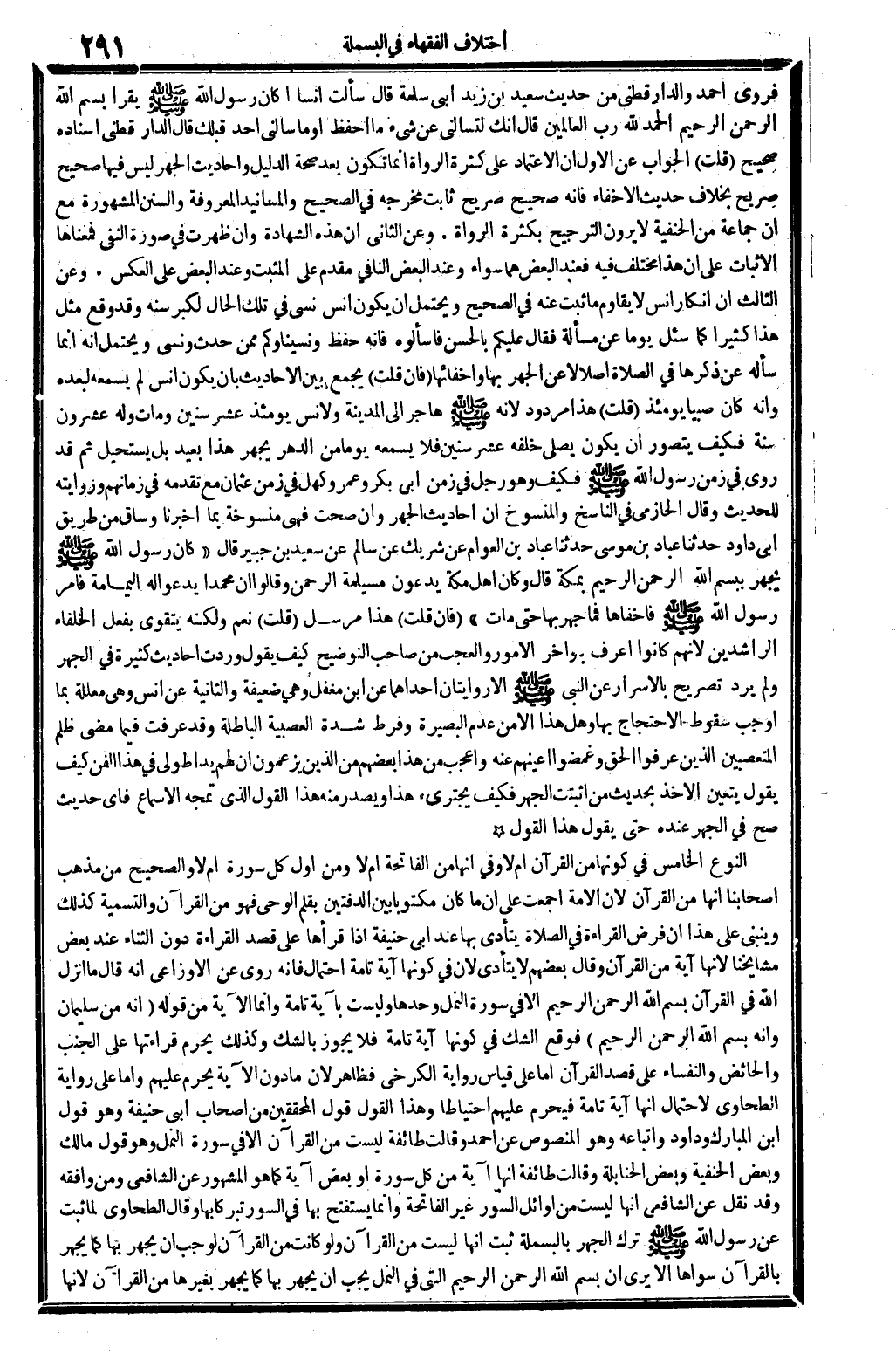 فروى أَحْمد وَالدَّارَقُطْنِيّ من حَدِيث سعيد بن زيد أبي سَلمَة قَالَ سَأَلت أنسا أَكَانَ رَسُول الله - صَلَّى اللَّهُ عَلَيْهِ وَسَلَّم َ - يقْرَأ بِسم الله الرَّحْمَن الرَّحِيم الْحَمد لله رب الْعَالمين قَالَ إِنَّك لتسألني عَن شَيْء مَا أحفظ أَو مَا سَأَلَني أحد قبلك قَالَ الدَّارَقُطْنِيّ إِسْنَاده صَحِيح (قلت) الْجَواب عَن الأول أَن الِاعْتِمَاد على كَثْرَة الروَاة إِنَّمَا تكون بعد صِحَة الدَّلِيل وَأَحَادِيث الْجَهْر لَيْسَ فِيهَا صَحِيح صَرِيح بِخِلَاف حَدِيث الْإخْفَاء فَإِنَّهُ صَحِيح صَرِيح ثَابت مخرجه فِي الصَّحِيح وَالْمَسَانِيد الْمَعْرُوفَة وَالسّنَن الْمَشْهُورَة مَعَ أَن جمَاعَة من الْحَنَفِيَّة لَا يرَوْنَ التَّرْجِيح بِكَثْرَة الروَاة. وَعَن الثَّانِي أَن هَذِه الشَّهَادَة وَإِن ظَهرت فِي صُورَة النَّفْي فَمَعْنَاه الْإِثْبَات على أَن هَذَا مُخْتَلف فِيهِ فَعِنْدَ الْبَعْض هما سَوَاء وَعند الْبَعْض النَّافِي مقدم على الْمُثبت وَعند الْبَعْض على الْعَكْس. وَعَن الثَّالِث أَن إِنْكَار أنس لَا يُقَاوم مَا ثَبت عَنهُ فِي الصَّحِيح وَيحْتَمل أَن يكون أنس نسي فِي تِلْكَ الْحَال لكبر سنه وَقد وَقع مثل هَذَا كثيرا كَمَا سُئِلَ يَوْمًا عَن مَسْأَلَة فَقَالَ عَلَيْكُم بالْحسنِ فَاسْأَلُوهُ فَإِنَّهُ حفظ ونسينا وَكم مِمَّن حدث وَنسي وَيحْتَمل أَنه إِنَّمَا سَأَلَهُ عَن ذكرهَا فِي الصَّلَاة أصلا لَا عَن الْجَهْر بهَا وإخفائها (فَإِن قلت) يجمع بَين الْأَحَادِيث بِأَن يكون أنس لم يسمعهُ لبعده وَأَنه كَانَ صَبيا يَوْمئِذٍ (قلت) هَذَا مَرْدُود لِأَنَّهُ - صَلَّى اللَّهُ عَلَيْهِ وَسَلَّم َ - هَاجر إِلَى الْمَدِينَة ولأنس يَوْمئِذٍ عشر سِنِين وَمَات وَله عشرُون سنة فَكيف يتَصَوَّر أَن يكون صلى خَلفه عشر سِنِين فَلَا يسمعهُ يَوْمًا من الدَّهْر يجْهر هَذَا بعيد بل يَسْتَحِيل ثمَّ قد روى فِي زمن رَسُول الله - صَلَّى اللَّهُ عَلَيْهِ وَسَلَّم َ - فَكيف وَهُوَ رجل فِي زمن أبي بكر وَعمر وكهل فِي زمن عُثْمَان مَعَ تقدمه فِي زمانهم وَرِوَايَته للْحَدِيث وَقَالَ الْحَازِمِي فِي النَّاسِخ والمنسوخ إِن أَحَادِيث الْجَهْر وَإِن صحت فَهِيَ مَنْسُوخَة بِمَا أخبرنَا وسَاق من طَرِيق أبي دَاوُد حَدثنَا عباد بن مُوسَى حَدثنَا عباد بن الْعَوام عَن شريك عَن سَالم عَن سعيد بن جُبَير قَالَ " كَانَ رَسُول الله - صَلَّى اللَّهُ عَلَيْهِ وَسَلَّم َ - يجْهر بِبسْم الله الرَّحْمَن الرَّحِيم بِمَكَّة قَالَ وَكَانَ أهل مَكَّة يدعونَ مُسَيْلمَة الرَّحْمَن وَقَالُوا أَن مُحَمَّدًا يَدْعُو لَهُ الْيَمَامَة فَأمر رَسُول الله - صَلَّى اللَّهُ عَلَيْهِ وَسَلَّم َ - فأخفاها فَمَا جهر بهَا حَتَّى مَاتَ " (فَإِن قلت) هَذَا مُرْسل (قلت) نعم وَلكنه يتقوى بِفعل الْخُلَفَاء الرَّاشِدين لأَنهم كَانُوا أعرف بأواخر الْأُمُور وَالْعجب من صَاحب التَّوْضِيح كَيفَ يَقُول وَردت أَحَادِيث كَثِيرَة فِي الْجَهْر وَلم يرد تَصْرِيح بالإسرار عَن النَّبِي - صَلَّى اللَّهُ عَلَيْهِ وَسَلَّم َ - إِلَّا رِوَايَتَانِ أَحدهمَا عَن ابْن مُغفل وَهِي ضَعِيفَة وَالثَّانيَِة عَن أنس وَهِي معللة بِمَا أوجب سُقُوط الِاحْتِجَاج بهَا وَهل هَذَا إِلَّا من عدم البصيرة وفرط شدَّة العصبية الْبَاطِلَة وَقد عرفت فِيمَا مضى ظلم المتعصبين الَّذين عرفُوا الْحق وغمضوا أَعينهم عَنهُ وأعجب من هَذَا بَعضهم من الَّذين يَزْعمُونَ أَن لَهُم يدا طولى فِي هَذَا الْفَنّ كَيفَ يَقُول يتَعَيَّن الْأَخْذ بِحَدِيث من أَثْبَتَت الْجَهْر فَكيف يجترىء هَذَا ويصدر مِنْهُ هَذَا القَوْل الَّذِي تمجه الأسماع فَأَي حَدِيث صَحَّ فِي الْجَهْر عِنْده حَتَّى يَقُول هَذَا القَوْل النَّوْع الْخَامِس فِي كَونهَا من الْقُرْآن أم لَا وَفِي أَنَّهَا من الْفَاتِحَة أم لَا وَمن أول كل سُورَة أم لَا وَالصَّحِيح