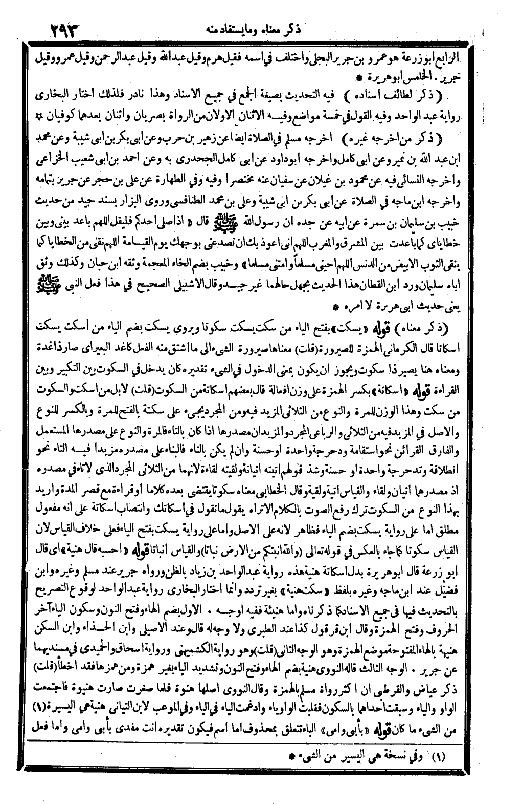ذكر لطائف إِسْنَاده: فِيهِ: التحديث بِصِيغَة الْجمع فِي جَمِيع الْإِسْنَاد، وَهَذَا نَادِر فَلذَلِك اخْتَار البُخَارِيّ رِوَايَة عبد الْوَاحِد. وَفِيه: القَوْل فِي خَمْسَة مَوَاضِع. وَفِيه: الإثنان الْأَوَّلَانِ من الروَاة بصريان، وَاثْنَانِ بعدهمَا كوفيان.