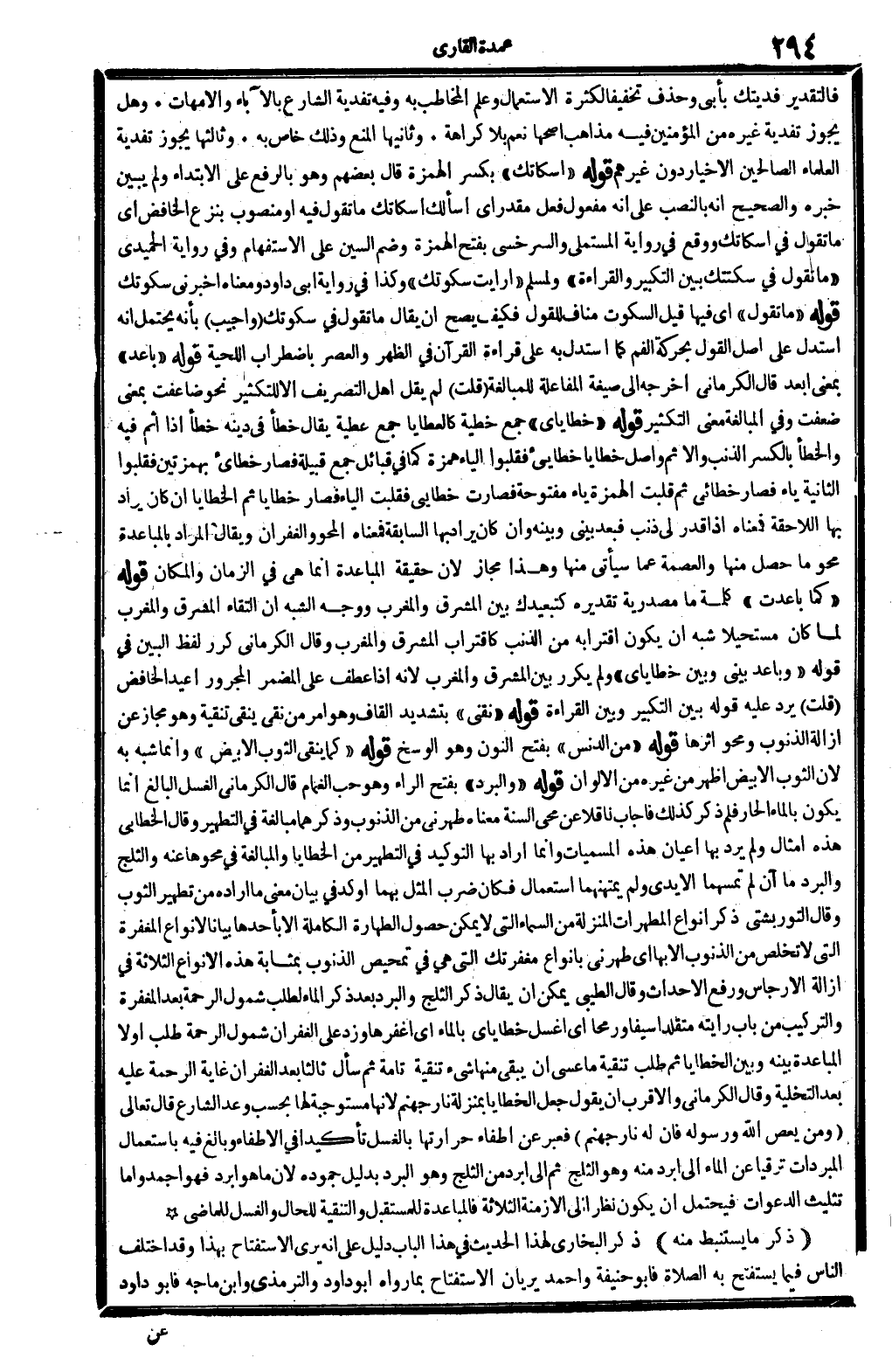 فالتقدير: فديتك بِأبي، وَحذف تَخْفِيفًا لِكَثْرَة الِاسْتِعْمَال، وَعلم الْمُخَاطب بِهِ، وَفِيه تفدية الشَّارِع بِالْآبَاءِ والأمهات. وَهل يجوز تفدية غَيره من الْمُؤمنِينَ؟ فِيهِ مَذَاهِب أَصَحهَا: نعم بِلَا كَرَاهَة. وَثَانِيها: الْمَنْع، وَذَلِكَ خَاص بِهِ. وَثَالِثهَا: يجوز تفدية الْعلمَاء الصَّالِحين الأخيار دون غَيرهم. قَوْله: (إسكاتك) بِكَسْر الْهمزَة، قَالَ بَعضهم: وَهُوَ بِالرَّفْع على الِابْتِدَاء وَلم يبين خَبره، وَالصَّحِيح أَنه بِالنّصب على أَنه مفعول: فعل، مُقَدّر أَي: أَسأَلك إسكاتك مَا تَقول فِيهِ؟ ذكر تعدد مَوْضِعه وَمن أخرجه غَيره: أَو مَنْصُوب بِنَزْع الْخَافِض، أَي: مَا تَقول فِي إسكاتك؟ وَوَقع فِي رِوَايَة الْمُسْتَمْلِي والسرخسي بِفَتْح الْهمزَة وَضم السِّين على الِاسْتِفْهَام، وَفِي رِوَايَة الْحميدِي: (مَا تَقول فِي سكتتك بَين التَّكْبِير وَالْقِرَاءَة؟) وَلمُسلم: (أَرَأَيْت سكوتك؟) وَكَذَا فِي رِوَايَة أبي دَاوُد، وَمَعْنَاهُ: أَخْبرنِي سكوتك. قَوْله: (مَا تَقول؟) أَي: فِيهَا. قيل: السُّكُوت منَاف، لِلْقَوْلِ، فَكيف يَصح أَن يُقَال مَا تَقول فِي سكوتك؟ وَأجِيب: بِأَنَّهُ يحْتَمل أَنه اسْتدلَّ على أصل القَوْل بحركة الْفَم، كَمَا اسْتدلَّ بِهِ على قِرَاءَة الْقُرْآن فِي الظّهْر وَالْعصر باضطراب اللِّحْيَة. قَوْله: (باعد) بِمَعْنى: أبعد، قَالَ الْكرْمَانِي: أخرجه إِلَى صِيغَة المفاعلة للْمُبَالَغَة. قلت: لم يقل أهل التصريف إلاّ للتكثير، نَحْو: ضاعفت، بِمَعْنى ضعفت. . وَفِي الْمُبَالغَة معنى التكثير. قَوْله: (خطاياي) ، جمع خطية كالعطايا جمع عَطِيَّة، يُقَال: خطأ فِي دينه خطأ إِذا أَثم فِيهِ، وَالْخَطَأ بِالْكَسْرِ الذَّنب وَالْإِثْم، وأصل خَطَايَا خطايىء، فقلبوا الْيَاء همزَة كَمَا فِي قبائل جمع قَبيلَة، فَصَارَ خطأيء بهمزتين، فقلبوا الثَّانِيَة يَاء فَصَارَ: خطائي، ثمَّ قلبت الْهمزَة يَاء مَفْتُوحَة فَصَارَت: خطايي، فقلبت الْيَاء فَصَارَ: خَطَايَا: إِن كَانَ يُرَاد بهَا اللاحقة فَمَعْنَاه إِذا قدر لي ذَنْب فباعد بيني وَبَينه، وَإِن كَانَ يُرَاد بهَا السَّابِقَة فَمَعْنَاه المحو والغفران، وَيُقَال: المُرَاد بالمباعدة محو مَا حصل مِنْهَا والعصمة عَمَّا سَيَأْتِي مِنْهَا، وَهَذَا مجَاز، لِأَن حَقِيقَة المباعدة إِنَّمَا هِيَ فِي الزَّمَان وَالْمَكَان. قَوْله: (كَمَا باعدت) كلمة: مَا، مَصْدَرِيَّة تَقْدِيره: كتبعيدك بَين الْمشرق وَالْمغْرب، وَوجه الشّبَه أَن التقاء الْمشرق وَالْمغْرب لما كَانَ مستحيلاً شبه أَن يكون اقترابه من الذَّنب كاقتراب الْمشرق وَالْمغْرب. وَقَالَ الْكرْمَانِي: كرر لفظ: الْبَين، فِي قَوْله: (وباعد بيني وَبَين خطاياي) ، وَلم يُكَرر: بَين الْمشرق وَالْمغْرب، لِأَنَّهُ إِذا عطف على الْمُضمر الْمَجْرُور أُعِيد الْخَافِض. قلت: يرد عَلَيْهِ قَوْله: بَين التَّكْبِير وَبَين الْقِرَاءَة. قَوْله: (نقني) بتَشْديد الْقَاف وَهُوَ أَمر من: نقى ينقي تنقية، وَهُوَ مجَاز عَن إِزَالَة الذُّنُوب ومحو أَثَرهَا. قَوْله: (من الدنس) بِفَتْح النُّون وَهُوَ: الْوَسخ. قَوْله: (كَمَا ينقى الثَّوْب الْأَبْيَض) ، وَإِنَّمَا شبه بِهِ لِأَن الثَّوْب الْأَبْيَض أظهر من غَيره من الألوان. قَوْله: (وَالْبرد) بِفَتْح الرَّاء، وَهُوَ حب الْغَمَام. قَالَ الْكرْمَانِي: الْغسْل الْبَالِغ إِنَّمَا يكون بِالْمَاءِ الْحَار، فَلم ذكر كَذَلِك؟ فَأجَاب نَاقِلا عَن مُحي السّنة: مَعْنَاهُ طهرني من الذُّنُوب، وذكرهما مُبَالغَة فِي التَّطْهِير، وَقَالَ الْخطابِيّ: هَذِه أَمْثَال، وَلم يرد بهَا أَعْيَان هَذِه المسميات، وَإِنَّمَا أَرَادَ بهَا التوكيد فِي التَّطْهِير من الْخَطَايَا وَالْمُبَالغَة فِي محوها عَنهُ، والثلج وَالْبرد مَا أَن لم تمسهما الْأَيْدِي وَلم يمتهنهما اسْتِعْمَال، فَكَانَ ضرب الْمثل بهما أوكد فِي بَيَ