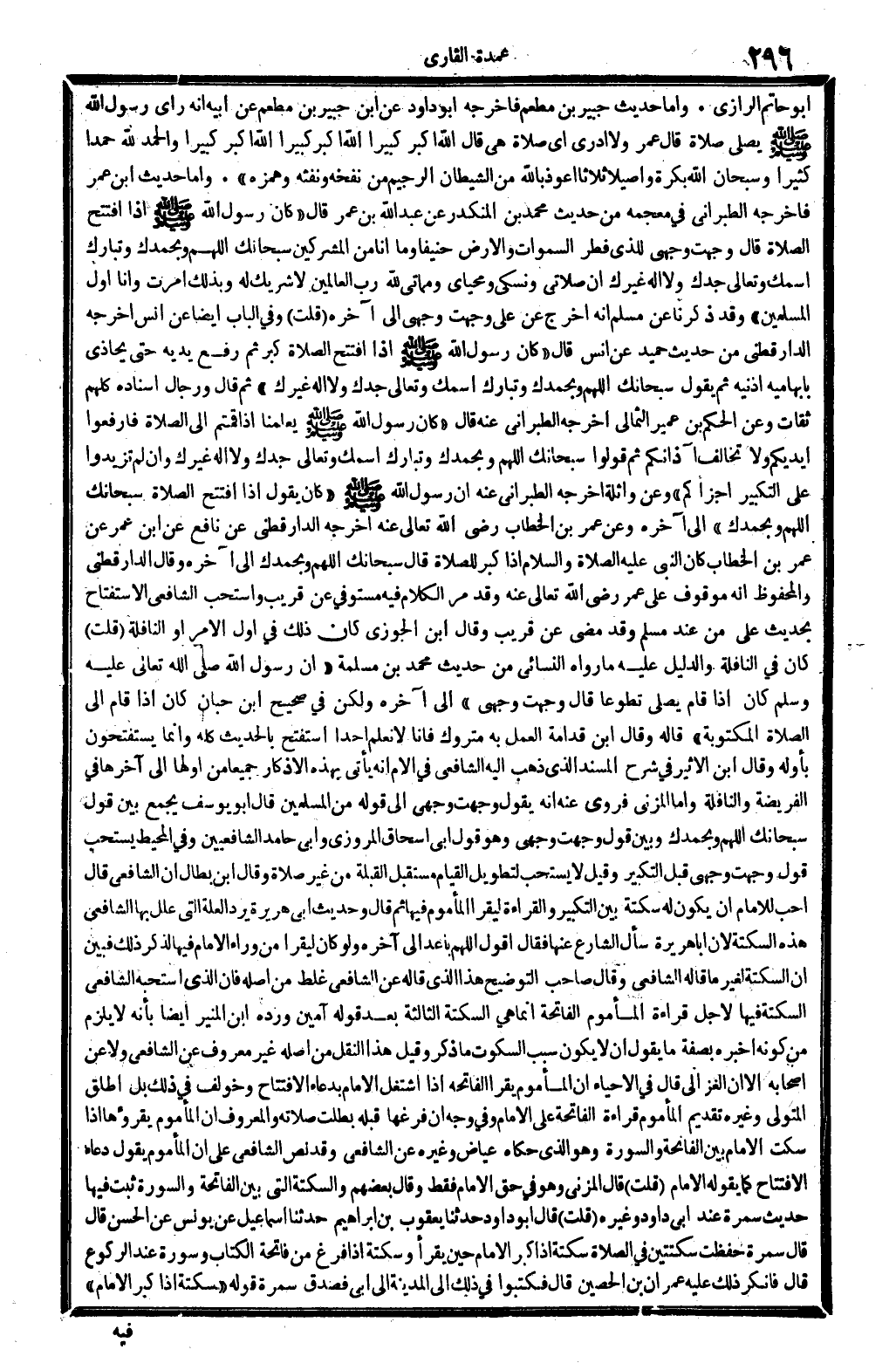 قلت: وَفِي الْبَاب أَيْضا عَن أنس أخرجه الدَّارَقُطْنِيّ من حَدِيث حميد عَن أنس، قَالَ: (كَانَ رَسُول الله صلى الله عَلَيْهِ وَسلم إِذا افْتتح الصَّلَاة كبر ثمَّ رفع يَدَيْهِ حَتَّى يُحَاذِي بإبهاميه أُذُنَيْهِ ثمَّ يَقُول: سُبْحَانَكَ اللَّهُمَّ وَبِحَمْدِك، وتبارك اسْمك وَتَعَالَى جدك وَلَا إِلَه غَيْرك) . ثمَّ قَالَ: وَرِجَال إِسْنَاده كلهم ثِقَات. وَعَن الحكم بن عُمَيْر الثمالِي أخرجه الطَّبَرَانِيّ عَنهُ، قَالَ: (كَانَ رَسُول الله صلى الله عَلَيْهِ وَسلم يعلمنَا: إِذا قُمْتُم إِلَى الصَّلَاة فارفعوا أَيْدِيكُم وَلَا تخَالف آذانكم. ثمَّ قُولُوا: سُبْحَانَكَ اللَّهُمَّ وَبِحَمْدِك وتبارك اسْمك وَتَعَالَى جدك وَلَا إِلَه غَيْرك، وَإِن لم تَزِيدُوا على التَّكْبِير أجزاكم) وَعَن وَاثِلَة أخرجه الطَّبَرَانِيّ عَنهُ: أَن رَسُول الله صلى الله عَلَيْهِ وَسلم (كَانَ يَقُول إِذا افْتتح الصَّلَاة: سُبْحَانَكَ اللَّهُمَّ وَبِحَمْدِك. .) إِلَى آخِره. وَعَن عمر بن الْخطاب، رَضِي الله تَعَالَى عَنهُ، أخرجه الدَّارَقُطْنِيّ عَن نَافِع عَن ابْن عمر عَن عمر بن الْخطاب: كَانَ النَّبِي، صلى الله عَلَيْهِ وَسلم، إِذا كبر للصَّلَاة قَالَ: (سُبْحَانَكَ اللَّهُمَّ وَبِحَمْدِك. .) إِلَى آخِره، وَقَالَ الدَّارَقُطْنِيّ، وَالْمَحْفُوظ أَنه مَوْقُوف على عمر، رَضِي الله تَعَالَى عَنهُ، وَقد مر الْكَلَام فِيهِ مُسْتَوفى عَن قريب. وَاسْتحبَّ الشَّافِعِي الاستفتاح بِحَدِيث عَليّ من عِنْد مُسلم، وَقد مضى عَن قريب. وَقَالَ ابْن الْجَوْزِيّ: كَانَ ذَلِك فِي أول الْأَمر أَو النَّافِلَة. قلت: كَانَ فِي النَّافِلَة، وَالدَّلِيل عَلَيْهِ مَا رَوَاهُ النَّسَائِيّ من حَدِيث مُحَمَّد بن مسلمة: (أَن رَسُول الله صلى الله عَلَيْهِ وَسلم كَانَ إِذا قَامَ يُصَلِّي تَطَوّعا قَالَ: وجهت وَجْهي) إِلَى آخِره. وَلَكِن فِي (صَحِيح ابْن حبَان) : كَانَ إِذا قَامَ إِلَى الصَّلَاة الْمَكْتُوبَة. .) قَالَه، وَقَالَ ابْن قدامَة: الْعَمَل بِهِ مَتْرُوك، فَإنَّا لَا نعلم أحدا استفتح بِالْحَدِيثِ كُله، وَإِنَّمَا يستفتحون بأوله. وَقَالَ ابْن الْأَثِير فِي (شرح الْمسند) : الَّذِي ذهب إِلَيْهِ الشَّافِعِي فِي (الْأُم) أَنه يَأْتِي بِهَذِهِ الْأَذْكَار جَمِيعًا من أَولهَا إِلَى آخرهَا فِي الْفَرِيضَة والنافلة، وَأما الْمُزنِيّ فروى عَنهُ أَنه يَقُول: وجهت وَجْهي ... إِلَى قَوْله: من الْمُسلمين. قَالَ أَبُو يُوسُف: يجمع بَين قَول: سُبْحَانَكَ اللَّهُمَّ وَبِحَمْدِك، وَبَين قَول: وجهت وَجْهي، وَهُوَ قَول أبي إِسْحَاق الْمروزِي وَأبي حَامِد الشافعيين. وَفِي (الْمُحِيط) : يسْتَحبّ قَول: وجهت وَجْهي قبل التَّكْبِير، وَقيل: لَا يسْتَحبّ لتطويل الْقيام مُسْتَقْبل الْقبْلَة من غير صَلَاة. وَقَالَ ابْن بطال: إِن الشَّافِعِي قَالَ: أحب للْإِمَام إِن يكون لَهُ سكتة بَين التَّكْبِير وَالْقِرَاءَة ليقْرَأ الْمَأْمُوم فِيهَا، ثمَّ قَالَ: وَحَدِيث أبي هُرَيْرَة يرد الْعلَّة الَّتِي علل بهَا الشَّافِعِي هَذِه السكتة، لِأَن أَبَا هُرَيْرَة سَأَلَ الشَّارِع عَنْهَا، فَقَالَ: أَقُول: اللَّهُمَّ باعد ... إِلَى آخِره، وَلَو كَانَ ليقْرَأ من وَرَاء الإِمَام فِيهَا لذكر ذَلِك، فَبين أَن السكتة لغير مَا قَالَه الشَّافِعِي. وَقَالَ صَاحب (التَّوْضِيح) : هَذَا الَّذِي قَالَه عَن الشَّافِعِي غلط من أَصله، فَإِن الَّذِي استحبه الشَّافِعِي السكتة فِيهَا لأجل قِرَاءَة الْمَأْمُوم الْفَاتِحَة إِنَّمَا هِيَ السكتة الثَّالِثَة بعد قَوْله: آمين، ورده ابْن الْمُنِير أَيْضا بِأَنَّهُ: لَا يلْزم من كَونه أخبرهُ بِصفة مَا يَقُول أَن لَا يكون سَبَب السُّكُوت مَا ذكر، وَقيل: هَذَا النَّقْل من أَصله غير مَعْرُوف عَن الشَّافِعِي وَلَا عَن أَصْحَابه، إلاّ أَن الْغَزالِيّ قَالَ فِي (الْإِحْيَاء) : إِن الْمَأْمُوم يقْ