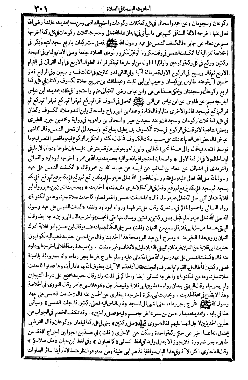 وأصحابنا احْتَجُّوا فِيمَا ذَهَبُوا إِلَيْهِ بِحَدِيث عبد الله بن عَمْرو، وَأخرجه أَبُو دَاوُد وَالنَّسَائِيّ وَالتِّرْمِذِيّ فِي الشَّمَائِل: عَن عَطاء بن السَّائِب عَن أَبِيه عَن عبد الله بن عَمْرو قَالَ: (انكسفت الشَّمْس على عهد رَسُول الله، صلى الله عَلَيْهِ وسلمد فَقَامَ رَسُول الله صلى الله عَلَيْهِ وَسلم، لم يكد يرْكَع ثمَّ ركع فَلم يكد يرفع ثمَّ رفع فَلم يكد يسْجد ثمَّ سجد فَلم يكد يرفع ثمَّ رفع، وَفعل فِي الرَّكْعَة الْأُخْرَى مثل ذَلِك) . الحَدِيث. وَبِحَدِيث النُّعْمَان بن بشير، رَوَاهُ أَبُو قلَابَة عَنهُ أَن النَّبِي، صلى الله عَلَيْهِ وَسلم، قَالَ: (إِذا خسفت الشَّمْس وَالْقَمَر فصلوا كأحدث صَلَاة صليتموها من الْمَكْتُوبَة) . رَوَاهُ النَّسَائِيّ وَأحمد وَالْحَاكِم فِي (مُسْتَدْركه) وَقَالَ: على شرطهم، وَرَوَاهُ أَبُو دَاوُد، وَلَفظه: (كسفت الشَّمْس على عهد رَسُول الله صلى الله عَلَيْهِ وَسلم، فَجعل يُصَلِّي رَكْعَتَيْنِ رَكْعَتَيْنِ وَيسْأل عَنْهَا حَتَّى انجلت) . وَأخرجه النَّسَائِيّ وَابْن مَاجَه أَيْضا وَقَالَ الْبَيْهَقِيّ: هَذَا مُرْسل، أَبُو قلَابَة لم يسمع من النُّعْمَان. قلت: صرح فِي الْكَمَال بِسَمَاعِهِ عَنهُ، وَقَالَ ابْن حزم: أَبُو قلَابَة أدْرك النُّعْمَان وروى هَذَا الْخَبَر عَنهُ، وَصرح ابْن عبد الْبر بِصِحَّة هَذَا الحَدِيث، وَقَالَ: من أحسن حَدِيث ذهب إِلَيْهِ الْكُوفِيُّونَ حَدِيث أبي قلَابَة عَن النُّعْمَان، فَرد كَلَام الْبَيْهَقِيّ، فَإِنَّهُ بِلَا دَلِيل، وَلِأَنَّهُ ناف وَغَيره مُثبت. وَبِحَدِيث قبيصَة الْهِلَالِي: أخرجه أَبُو دَاوُد عَنهُ قَالَ: (كسفت الشَّمْس على عهد رَسُول الله، صلى الله عَلَيْهِ وَسلم، فَخرج فَزعًا يجر رِدَاءَهُ، وَأَنا مَعَه يَوْمئِذٍ بِالْمَدِينَةِ، فصلى رَكْعَتَيْنِ فَأطَال فِيهَا الْقيام، ثمَّ انْصَرف وانجلت، فَقَالَ: إِنَّمَا هَذِه الْآيَات يخوف الله بهَا فَإِذا رأيتموها فصلوا كأحدث صَلَاة صليتموها من الْمَكْتُوبَة) . وَأخرجه النَّسَائِيّ أَيْضا وَالْحَاكِم فِي (الْمُسْتَدْرك) وَقَالَ: حَدِيث صَحِيح على شَرط الشَّيْخَيْنِ، وَلم يخرجَاهُ. وَقَالَ الْبَيْهَقِيّ بعد أَن رَوَاهُ سقط بَين أبي قلَابَة وَقبيصَة رجل وَهُوَ: هِلَال بن عَامر، وَقَالَ النَّوَوِيّ فِي (الْخُلَاصَة) : وَهَذَا لَا يقْدَح فِي صِحَة الحَدِيث. وَبِحَدِيث أبي بكرَة أخرجه البُخَارِيّ عَن الْحسن عَنهُ، قَالَ: (خسفت الشَّمْس على عهد رَسُول الله صلى الله عَلَيْهِ وَسلم فَخرج يجر رِدَاءَهُ حَتَّى انْتهى إِلَى الْمَسْجِد وثاب النَّاس إِلَيْهِ، فصلى رَكْعَتَيْنِ فانجلت الشَّمْس) . وَسَيَأْتِي هَذَا فِي بَابه. وَبِحَدِيث عبد الرَّحْمَن بن سَمُرَة، أخرجه مُسلم وَفِيه: (فصلى رَكْعَتَيْنِ) .