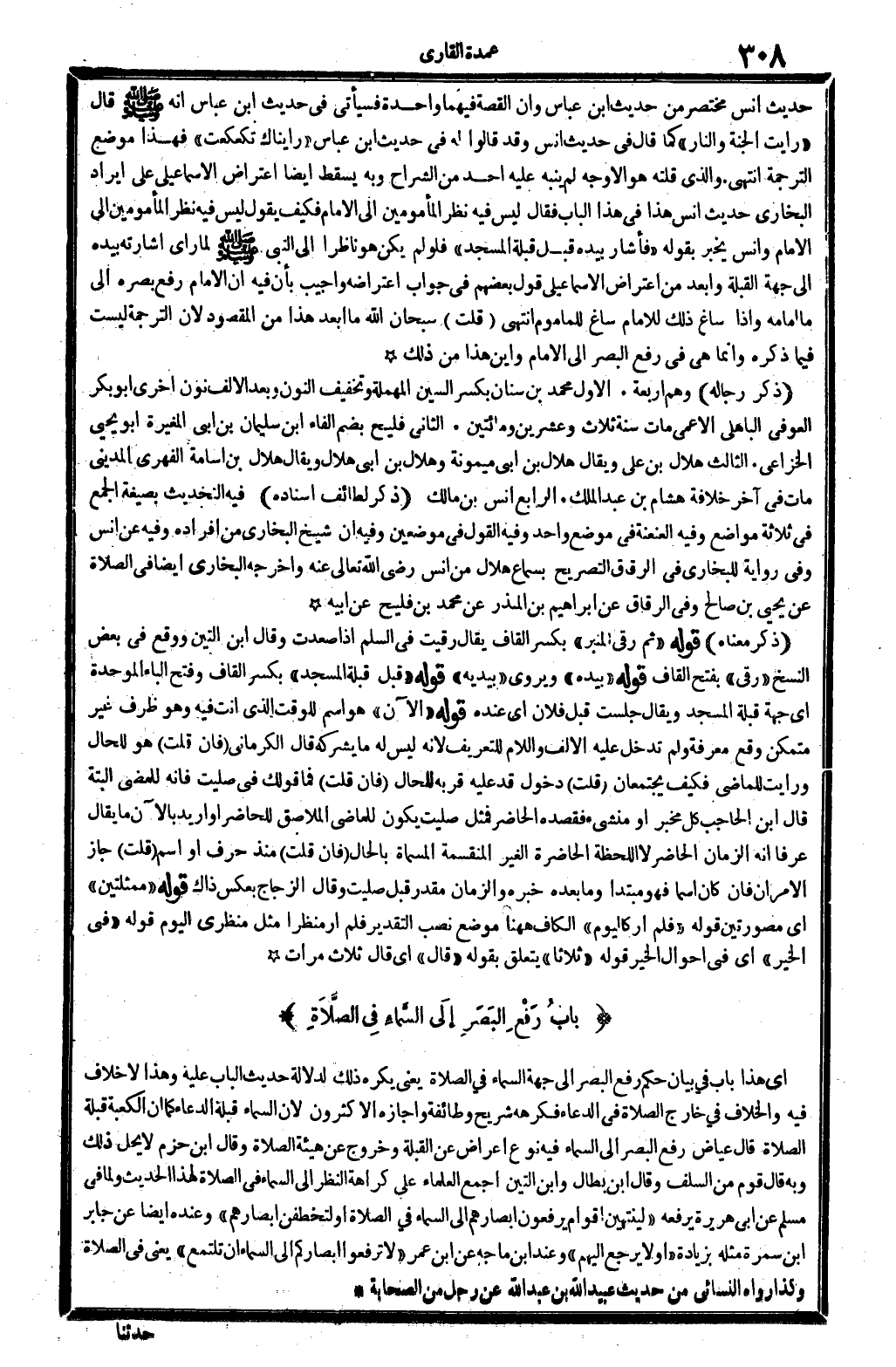 حَدِيث أنس مُخْتَصر من حَدِيث ابْن عَبَّاس وَأَن الْقِصَّة فيهمَا وَاحِدَة فَسَيَأْتِي فِي حَدِيث ابْن عَبَّاس أَنه - صَلَّى اللَّهُ عَلَيْهِ وَسَلَّم َ - قَالَ " رَأَيْت الْجنَّة وَالنَّار " كَمَا قَالَ فِي حَدِيث أنس وَقد قَالُوا لَهُ فِي حَدِيث ابْن عَبَّاس " رَأَيْنَاك تكعكعت " فَهَذَا مَوضِع التَّرْجَمَة انْتهى. وَالَّذِي قلته هُوَ الْأَوْجه لم يُنَبه عَلَيْهِ أحد من الشُّرَّاح وَبِه يسْقط أَيْضا اعْتِرَاض الْإِسْمَاعِيلِيّ على إِيرَاد البُخَارِيّ حَدِيث أنس هَذَا فِي هَذَا الْبَاب فَقَالَ لَيْسَ فِيهِ نظر الْمَأْمُومين إِلَى الإِمَام فَكيف يَقُول لَيْسَ فِيهِ نظر الْمَأْمُومين إِلَى الإِمَام وَأنس يخبر بقوله " فَأَشَارَ بِيَدِهِ قبل قبْلَة الْمَسْجِد " فَلَو لم يكن هُوَ نَاظرا إِلَى النَّبِي - صَلَّى اللَّهُ عَلَيْهِ وَسَلَّم َ - لما رأى إِشَارَته بِيَدِهِ إِلَى جِهَة الْقبْلَة وَأبْعد من اعْتِرَاض الْإِسْمَاعِيلِيّ قَول بَعضهم فِي جَوَاب اعتراضه وَأجِيب بِأَن فِيهِ أَن الإِمَام رفع بَصَره إِلَى مَا أَمَامه وَإِذا سَاغَ ذَلِك للْإِمَام سَاغَ للْمَأْمُوم انْتهى (قلت) سُبْحَانَ الله مَا أبعد هَذَا من الْمَقْصُود لِأَن التَّرْجَمَة لَيست فِيمَا ذكره وَإِنَّمَا هِيَ فِي رفع الْبَصَر إِلَى الإِمَام وَأَيْنَ هَذَا من ذَلِك (ذكر رِجَاله) وهم أَرْبَعَة. الأول مُحَمَّد بن سِنَان بِكَسْر السِّين الْمُهْملَة وَتَخْفِيف النُّون وَبعد الْألف نون أُخْرَى أَبُو بكر الْعَوْفِيّ الْبَاهِلِيّ الْأَعْمَى مَاتَ سنة ثَلَاث وَعشْرين وَمِائَتَيْنِ. الثَّانِي فليح بِضَم الْفَاء ابْن سُلَيْمَان بن أبي الْمُغيرَة أَبُو يحيى الْخُزَاعِيّ. الثَّالِث هِلَال بن عَليّ وَيُقَال هِلَال بن أبي مَيْمُونَة وهلال بن أبي هِلَال وَيُقَال هِلَال بن أُسَامَة الفِهري الْمَدِينِيّ مَاتَ فِي آخر خلَافَة هِشَام بن عبد الْملك. الرَّابِع أنس بن مَالك. (ذكر لطائف إِسْنَاده) فِيهِ التحديث بِصِيغَة الْجمع فِي ثَلَاثَة مَوَاضِع وَفِيه العنعنة فِي مَوضِع وَاحِد وَفِيه القَوْل فِي موضِعين وَفِيه أَن شيخ البُخَارِيّ من أَفْرَاده وَفِيه عَن أنس وَفِي رِوَايَة للْبُخَارِيّ فِي الرقَاق التَّصْرِيح بِسَمَاع هِلَال من أنس رَضِي الله تَعَالَى عَنهُ وَأخرجه البُخَارِيّ أَيْضا فِي الصَّلَاة عَن يحيى بن صَالح وَفِي الرقَاق عَن إِبْرَاهِيم بن الْمُنْذر عَن مُحَمَّد بن فليح عَن أَبِيه (ذكر مَعْنَاهُ) قَوْله " ثمَّ رقي الْمِنْبَر " بِكَسْر الْقَاف يُقَال رقيت فِي السّلم إِذا صعدت وَقَالَ ابْن التِّين وَوَقع فِي بعض النّسخ " رقي " بِفَتْح الْقَاف قَوْله " بِيَدِهِ " ويروى " بيدَيْهِ " قَوْله " قبل قبْلَة الْمَسْجِد " بِكَسْر الْقَاف وَفتح الْبَاء الْمُوَحدَة أَي جِهَة قبْلَة الْمَسْجِد وَيُقَال جَلَست قبل فلَان أَي عِنْده قَوْله " الْآن " هُوَ اسْم للْوَقْت الَّذِي أَنْت فِيهِ وَهُوَ ظرف غير مُتَمَكن وَقع معرفَة وَلم تدخل عَلَيْهِ الْألف وَاللَّام للتعريف لِأَنَّهُ لَيْسَ لَهُ مَا يشركهُ قَالَ الْكرْمَانِي (فَإِن قلت) هُوَ للْحَال وَرَأَيْت للماضي فَكيف يَجْتَمِعَانِ (قلت) دُخُول قد عَلَيْهِ قربه للْحَال (فَإِن قلت) فَمَا قَوْلك فِي صليت فَإِنَّهُ للمضي الْبَتَّةَ قَالَ ابْن الْحَاجِب كل مخبر أَو منشىء فقصده الْحَاضِر فَمثل صليت يكون للماضي الملاصق للحاضر أَو أُرِيد بالآن مَا يُقَال عرفا أَنه الزَّمَان الْحَاضِر لَا اللحظة الْحَاضِرَة الْغَيْر المنقسمة الْمُسَمَّاة بِالْحَال (فَإِن قلت) مُنْذُ حرف أَو اسْم (قلت) جَازَ الْأَمْرَانِ فَإِن كَانَ اسْما فَهُوَ مُبْتَدأ وَمَا بعده خَبره وَالزَّمَان مُقَدّر قبل صليت وَقَالَ الزّجاج بعكس ذَلِك قَوْله " ممثلتين " أَي مصورتين قَوْله " فَلم أر كَالْيَوْمِ " الْكَاف هَهُنَا وضع نصب التَّقْدِير فَلم أر منْظرًا مثل منظري الْيَوْم قَوْ