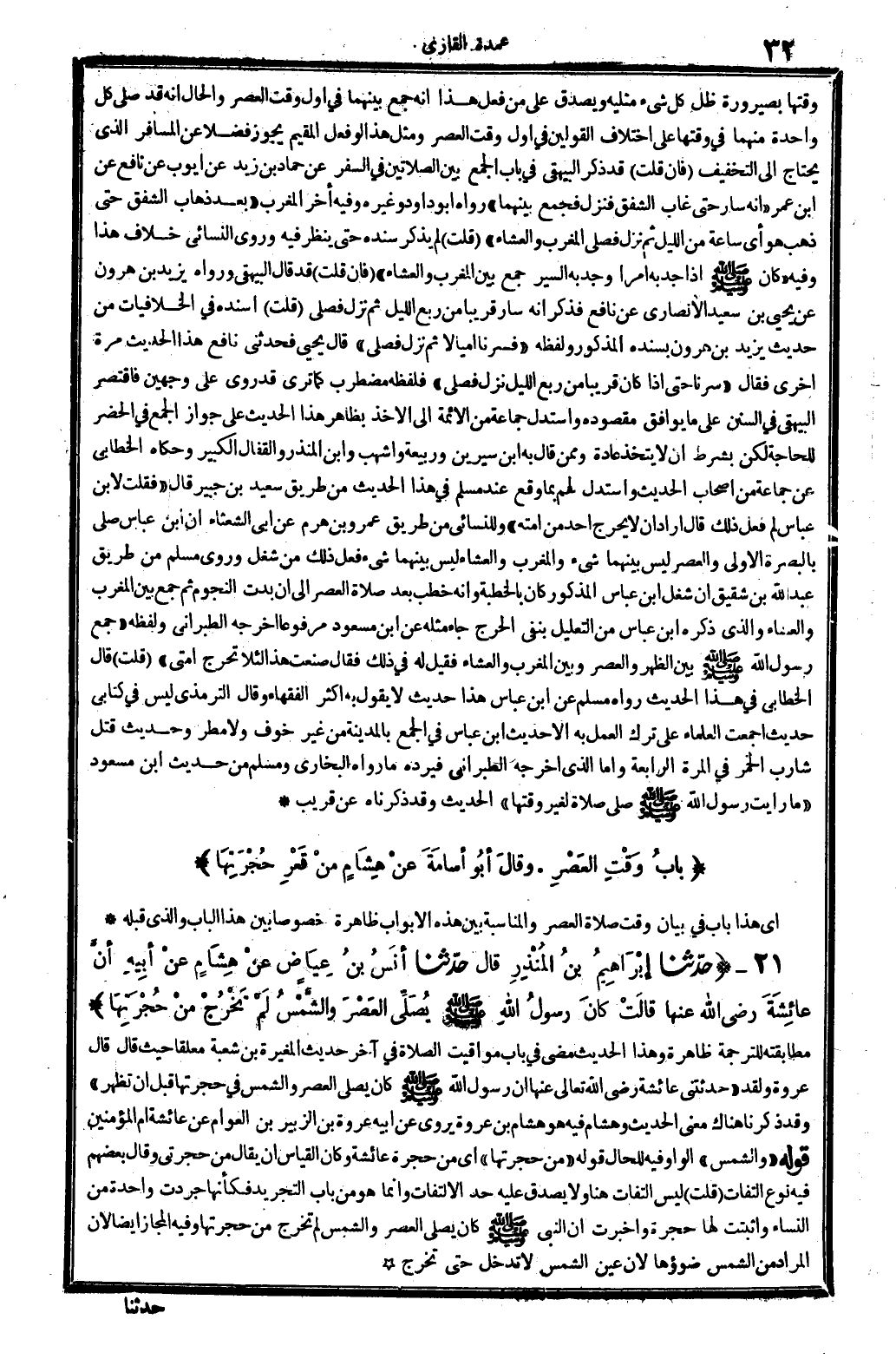وَقتهَا بصيرورة ظلّ كل شَيْء مثلَيْهِ، وَيصدق على من فعل هَذَا أَنه جمع بَينهمَا فِي أول وَقت الْعَصْر، وَالْحَال أَنه قد صلى كل وَاحِدَة مِنْهُمَا فِي وَقتهَا على اخْتِلَاف الْقَوْلَيْنِ فِي أول وَقت الْعَصْر، وَمثل هَذَا لَو فعل الْمُقِيم يجوز فضلا عَن الْمُسَافِر الَّذِي يحْتَاج إِلَى التَّخْفِيف. فَإِن قلت: قد ذكر الْبَيْهَقِيّ فِي بَاب الْجمع بَين الصَّلَاتَيْنِ فِي السّفر: عَن حَمَّاد بن زيد عَن أَيُّوب عَن نَافِع عَن ابْن عمر: (أَنه سَار حَتَّى غَابَ الشَّفق فَنزل فَجمع بَينهمَا) ، رَوَاهُ أَبُو دَاوُد وَغَيره، وَفِيه: أخر الْمغرب (بعد ذهَاب الشَّفق حَتَّى ذهب هُوَ أَي: سَاعَة من اللَّيْل، ثمَّ نزل فصلى الْمغرب وَالْعشَاء) قلت: لم يذكر سَنَده حَتَّى ينظر فِيهِ، وروى النَّسَائِيّ خلاف هَذَا وَفِيه: (كَانَ صلى الله عَلَيْهِ وَسلم إِذا جد بِهِ أَمر أَو جد بِهِ السّير جمع بَين الْمغرب وَالْعشَاء) . فَإِن قلت: قد قَالَ الْبَيْهَقِيّ: وَرَوَاهُ يزِيد بن هَارُون عَن يحيى بن سعيد الْأنْصَارِيّ عَن نَافِع، فَذكر أَنه سَار قَرِيبا من ربع اللَّيْل، ثمَّ نزل فصلى قلت: أسْندهُ فِي (الخلافيات) من حَدِيث يزِيد بن هَارُون بِسَنَدِهِ الْمَذْكُور وَلَفظه: (فسرنا أميالاً ثمَّ نزل فصلى) . قَالَ يحيى: فَحَدثني نَافِع هَذَا الحَدِيث مرّة أُخْرَى فَقَالَ: (سرنا حَتَّى إِذا كَانَ قَرِيبا من ربع اللَّيْل نزل فصلى) . فلفظه مُضْطَرب كَمَا ترى، قد رُوِيَ على وَجْهَيْن فاقتصر الْبَيْهَقِيّ فِي (السّنَن) على مَا يُوَافق مَقْصُوده، وَاسْتدلَّ جمَاعَة من الْأَئِمَّة إِلَى الْأَخْذ بِظَاهِر هَذَا الحَدِيث على جَوَاز الْجمع فِي الْحَضَر للْحَاجة، لَكِن بِشَرْط أَن لَا يتَّخذ عَادَة، وَمِمَّنْ قَالَ بِهِ: ابْن سِيرِين وَرَبِيعَة وَأَشْهَب وَابْن الْمُنْذر والقفال الْكَبِير، وَحَكَاهُ الْخطابِيّ عَن جمَاعَة من أَصْحَاب الحَدِيث، وَاسْتدلَّ لَهُم بِمَا وَقع عِنْد مُسلم فِي هَذَا الحَدِيث من طَرِيق سعيد بن جُبَير، قَالَ: (فَقلت لِابْنِ عباسِ: لِمَ فعل ذَلِك؟ قَالَ: أَرَادَ أَن لَا يُحرج أحد من أمته) . وللنسائي من طَرِيق عَمْرو بن هرم: عَن أبي الشعْثَاء أَن ابْن عَبَّاس صلى بِالْبَصْرَةِ الأولى وَالْعصر لَيْسَ بَينهمَا شَيْء، وَالْمغْرب وَالْعشَاء لَيْسَ بَينهمَا شَيْء، فعل ذَلِك من شغل. وروى مُسلم من طَرِيق عبد الله بن شَقِيق أَن شغل ابْن عَبَّاس الْمَذْكُور كَانَ بِالْخطْبَةِ، وَأَنه خطب بعد صَلَاة الْعَصْر إِلَى أَن بَدَت النُّجُوم، ثمَّ جمع بَين الْمغرب وَالْعشَاء، وَالَّذِي ذكره ابْن عَبَّاس من التَّعْلِيل بِنَفْي الْحَرج جَاءَ مثله عَن ابْن مَسْعُود مَرْفُوعا، أخرجه الطَّبَرَانِيّ، وَلَفظه: (جمع رَسُول الله صلى الله عَلَيْهِ وَسلم بَين الظّهْر وَالْعصر وَبَين الْمغرب وَالْعشَاء، فَقيل لَهُ فِي ذَلِك، فَقَالَ: صنعت هَذَا لِئَلَّا تُحرج أمتِي) . قلت: قَالَ الْخطابِيّ فِي هَذَا الحَدِيث: رَوَاهُ مُسلم عَن ابْن عَبَّاس، هَذَا حَدِيث لَا يَقُول بِهِ أَكثر الْفُقَهَاء. وَقَالَ التِّرْمِذِيّ: لَيْسَ فِي كتابي حَدِيث أَجمعت الْعلمَاء على ترك الْعَمَل بِهِ إلاَّ حَدِيث ابْن عَبَّاس فِي الْجمع بِالْمَدِينَةِ من غير خوف وَلَا مطر، وَحَدِيث قتل شَارِب الْخمر فِي الْمرة الرَّابِعَة. وَأما الَّذِي أخرجه الطَّبَرَانِيّ فَيردهُ مَا رَوَاهُ البُخَارِيّ وَمُسلم من حَدِيث ابْن مَسْعُود: (مَا رَأَيْت رَسُول الله صلى الله عَلَيْهِ وَسلم صلى صَلَاة لغير وَقتهَا) الحَدِيث، وَقد ذَكرْنَاهُ عَن قريب.