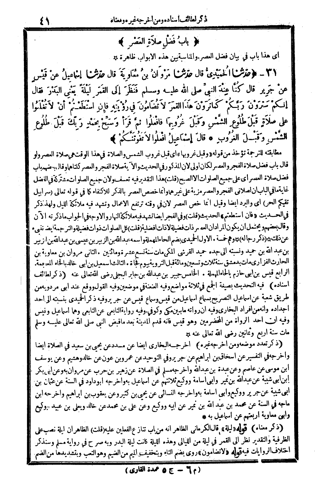 554 - حدَّثنا الحُمَيْدِي قَالَ حدَّثنا مَرْوَانُ بنُ مُعَاوِيَةَ قَالَ حدَّثنا إسْمَاعِيلُ عنْ قَيْسٍ عنْ جَرِير قَالَ كُنَّا عِنْدَ النبيِّ صلى الله عَلَيْهِ وَسلم فَنَظَرَ إلَى القَمَرِ لَيْلَةً يَعْنِي البَدْرَ فَقَالَ إنَّكُمْ سَتَرَوْنَ رَبَّكُمْ كَما تَرَوْنَ هَذَا القَمَرَ لاَ تُضَامُونَ فِي رُؤْيَتِهِ فإنِ اسْتَطَعْتُمْ أنْ لاَ تُغْلَوْا عَلَى صَلاَةٍ قَبْلَ طُلُوعِ الشَّمْسِ وَقَبْلَ غُرُوبِهَا فافْعَلُوا ثمَّ قَرَأَ وَسَبِّح بِحَمْدِ رَبِّكَ قَبْلَ طُلُوعِ الشَّمْسِ وَقَبْلَ الغُرُوبِ. قالَ إسْمَاعِيلُ افْعَلوا لاَ تَفُوتَنَّكُمْ. . [/ نه