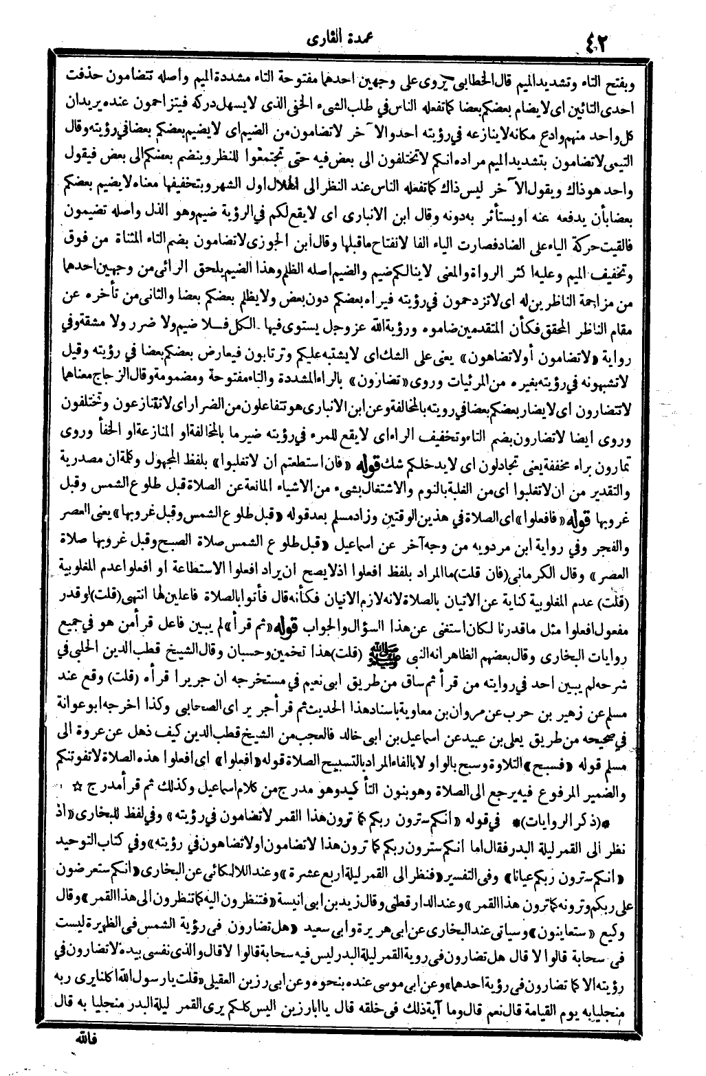 وبفتح التَّاء وَتَشْديد الْمِيم، قَالَ الْخطابِيّ: يرْوى على وَجْهَيْن: أَحدهمَا: مَفْتُوحَة التَّاء مُشَدّدَة الْمِيم، وَأَصله: تتضامون، حذفت إِحْدَى التائين، أَي: لَا يضام بَعْضكُم بَعْضًا كَمَا تَفْعَلهُ النَّاس فِي طلب الشَّيْء الْخَفي الَّذِي لَا يسهل دركه فيتزاحمون عِنْده، يُرِيد أَن كل وَاحِد مِنْهُم وادع مَكَانَهُ لَا ينازعه فِي رُؤْيَته أحد. وَالْآخر: لَا تضَامون من: الضيم، أَي: لَا يضيم بَعْضكُم بَعْضًا فِي رُؤْيَته. وَقَالَ التَّيْمِيّ: لَا تضَامون، بتَشْديد الْمِيم، مُرَاده: أَنكُمْ لَا تختلفون إِلَى بعض فِيهِ حَتَّى تجتمعوا للنَّظَر، وينضم بَعْضكُم إِلَى بعض فَيَقُول وَاحِد: هُوَ ذَاك، وَيَقُول الآخر: لَيْسَ ذَاك، كَمَا تَفْعَلهُ النَّاس عِنْد النّظر إِلَى الْهلَال أول الشَّهْر، وبتخفيفها، مَعْنَاهُ: لَا يضيم بَعْضكُم بَعْضًا بِأَن يَدْفَعهُ عَنهُ أَو يستأثر بِهِ دونه. وَقَالَ ابْن الْأَنْبَارِي أَي: لَا يَقع لكم فِي الرُّؤْيَة ضيم وَهُوَ الذل، وَأَصله: تضيمون فالقيت حَرَكَة الْيَاء على الضَّاد فَصَارَت الْيَاء ألفا لانفتاح مَا قبلهَا. وَقَالَ ابْن الْجَوْزِيّ: لَا تضَامون، بِضَم التَّاء الْمُثَنَّاة من فَوق وَتَخْفِيف الْمِيم، وَعَلِيهِ أَكثر الروَاة، وَالْمعْنَى لَا ينالكم ضيم، والضيم أَصله: الظُّلم، وَهَذَا الضيم يلْحق الرَّائِي من وَجْهَيْن: أَحدهمَا من مزاحمة الناظرين لَهُ، أَي: لَا تزدحمون فِي رُؤْيَته فيراه بَعْضكُم دون بعض، وَلَا يظلم بَعْضكُم بَعْضًا. وَالثَّانِي: من تَأَخره عَن مقَام النَّاظر الْمُحَقق، فَكَأَن الْمُتَقَدِّمين ضاموه، ورؤية الله عز وَجل يَسْتَوِي فِيهَا الْكل، فَلَا ضيم وَلَا ضَرَر وَلَا مشقة. وَفِي رِوَايَة: (لَا تضَامون، أَو لَا تضاهون) . يَعْنِي: على الشَّك، أَي: لَا يشْتَبه عَلَيْكُم وترتابون فيعارض بَعْضكُم بَعْضًا فِي رُؤْيَته. وَقيل: لَا تشبهونه فِي رُؤْيَته بِغَيْرِهِ من المرئيات. وَرُوِيَ: (تضَارونَ) ، بالراء الْمُشَدّدَة وَالتَّاء مَفْتُوحَة ومضمومة. وَقَالَ الزّجاج: مَعْنَاهُمَا لَا تتضارون أَي: لَا يضار بَعْضكُم بَعْضًا فِي رُؤْيَته بالمخالفة. وَعَن ابْن الْأَنْبَارِي: هُوَ تتفاعلون من الضرار، أَي: لَا تتنازعون وتختلفون. وَرُوِيَ إيضا: لَا تضَارونَ، بِضَم التَّاء وَتَخْفِيف الرَّاء، أَي: لَا يَقع للمرء فِي رُؤْيَته ضير مَا بالمخالفة أَو الْمُنَازعَة أَو الخفأ. وَرُوِيَ: تمارون، برَاء مُخَفّفَة يَعْنِي: تجادلون أَي لَا يدخلكم شكّ قَوْله (فان اسْتَطَعْتُم ان لَا تغلبُوا) بِلَفْظ الْمَجْهُول وَكلمَة ان مَصْدَرِيَّة وَالتَّقْدِير ان لاتغلبوا أَي: من الْغَلَبَة بِالنَّوْمِ والاشتغال بِشَيْء من الْأَشْيَاء الْمَانِعَة عَن الصَّلَاة قبل طُلُوع الشَّمْس، وَقبل غُرُوبهَا قَوْله: (فافعلوا) أَي: الصَّلَاة فِي هذَيْن الْوَقْتَيْنِ، وَزَاد مُسلم بعد قَوْله: قبل طُلُوع الشَّمْس وَقبل غُرُوبهَا يَعْنِي الْعَصْر وَالْفَجْر وَفِي رِوَايَة ابْن مردوية من وَجه آخر عَن اسماعيل (قبل طُلُوع الشَّمْس صَلَاة الصُّبْح، وَقبل غُرُوبهَا صَلَاة الْعَصْر) . وَقَالَ الْكرْمَانِي: فَإِن قلت: مَا المُرَاد بِلَفْظ: إفعلوا؟ إِذْ لَا يَصح أَن يُرَاد إفعلوا الِاسْتِطَاعَة، أَو إفعلوا عدم المغلوبية؟ قلت: عدم المغلوبية كِنَايَة عَن الْإِتْيَان بِالصَّلَاةِ، لِأَنَّهُ لَازم الْإِتْيَان، فَكَأَنَّهُ قَالَ: فَأتوا بِالصَّلَاةِ فاعلين لَهَا. انْتهى. قلت: لَو وَقدر مفعول: إفعلوا، مثل مَا قَدرنَا لَكَانَ اسْتغنى عَن هَذَا السُّؤَال وَالْجَوَاب. قَوْله: (ثمَّ قَرَأَ) لم يبين فَاعل: قَرَأَ، من هُوَ فِي جَمِيع رِوَايَات البُخَارِيّ. وَقَالَ بَعضهم: الظَّاهِر أَنه النَّبِي صلى الله عَلَيْهِ وَسلم، قلت: هَذَا تخمين وحسبان. وَقَالَ الشَّيْخ قطب الدّين الْحلَبِي فِي شَرحه: لم يبين أحد فِي رِوَايَته من قَرَأَ