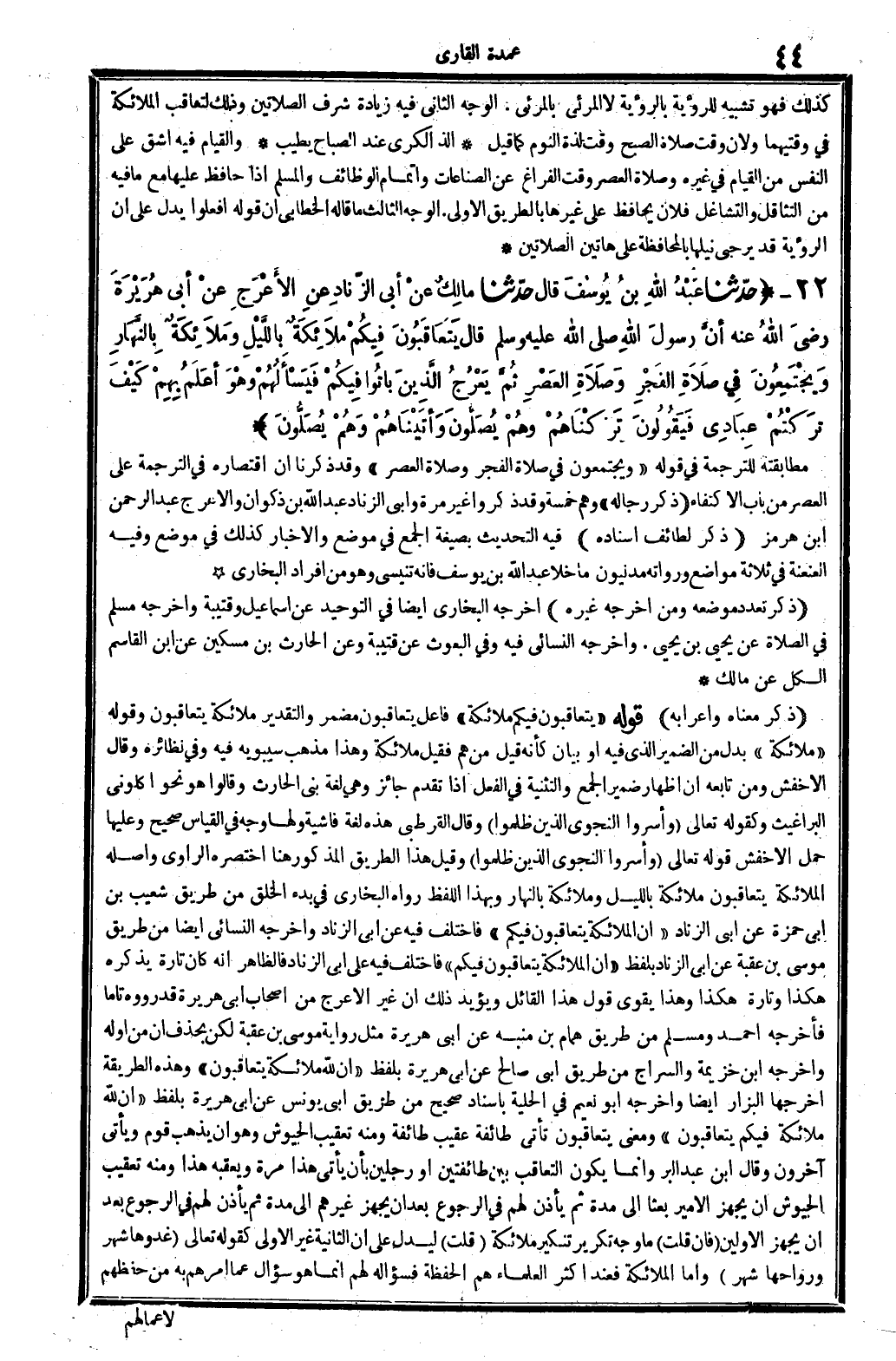 555 - حدَّثنا عَبْدُ الله بنُ يُوسُف قَالَ حدَّثنا مالِكٌ عنْ أبي الزِّنادِ عنِ الأعْرَجِ عنْ أَبي هُرَيْرَة رَضِي الله تَعَالَى عَنهُ أنَّ رَسُولَ الله صلى الله عَلَيْهِ وَسلم قَالَ يَتَعَاقَبُونَ فِيكُمْ مَلاَئِكَةٌ بِاللَّيْلِ ومَلاَئِكَةٌ بِالنَّهَارِ وَيَجْتَمِعُونَ فِي صَلاَةِ الفَجْرِ وَصَلاَةِ العَصْرِ ثُمَّ يَعْرُجُ الَّذِينَ باتُوا فِيكُمْ فَيَسْأَلُهُمْ وهْوَ أَعْلَمُ بِهِمْ كَيْفَ تَرَكْتُمْ عِبَادِي فَيَقُولُونَ تَرَكْنَاهُمْ وهُمْ يُصَلُّونَ وَأَتَيْنَاهُمْ وهُمْ يُصَلُّونَ. .