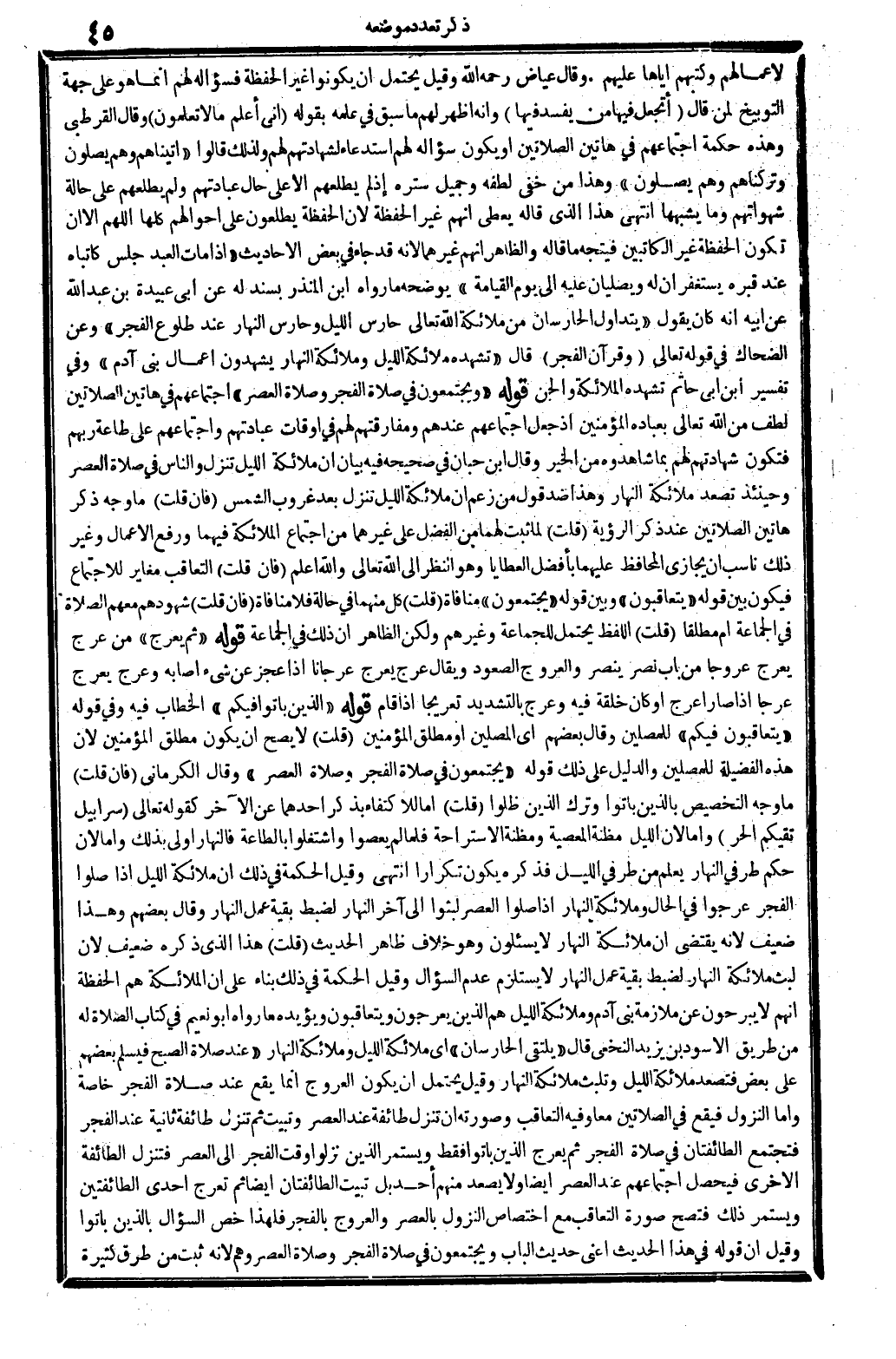 وَقَالَ عِيَاض، رَحمَه الله: وَقيل: يحْتَمل أَن يَكُونُوا غير الْحفظَة، فسؤاله لَهُم إِنَّمَا هُوَ على جِهَة التوبيخ لمن قَالَ: {أَتجْعَلُ فِيهَا من يفْسد فِيهَا} (الْبَقَرَة: 30) . وَإنَّهُ اظهر لَهُم مَا سبق فِي علمه بقوله (اني اعْلَم مَا لَا تعلمُونَ) وَقَالَ الْقُرْطُبِيّ: وَهَذِه حِكْمَة اجْتِمَاعهم فِي هَاتين الصَّلَاتَيْنِ، أَو يكون سُؤَاله لَهُم استدعاءً لشهادتهم لَهُم، وَلذَلِك قَالُوا: (أتيناهم وهم يصلونَ وتركناهم وهم يصلونَ) . وَهَذَا من خَفِي لطفه وَجَمِيل ستره، إِذا لم يطلعهم إلاَّ على حَال عِبَادَتهم، وَلم يطلعهم على حَالَة شهواتهم وَمَا يشبهها. انْتهى. هَذَا الَّذِي قَالَه يُعْطي أَنهم غير الْحفظَة، لِأَن الْحفظَة يطلعون على أَحْوَالهم كلهَا، اللَّهُمَّ إلاَّ أَن تكون الْحفظَة غير الْكَاتِبين، فَيتَّجه مَا قَالَه. وَالظَّاهِر أَنهم غَيرهمَا، لِأَنَّهُ قد جَاءَ فِي بعض الْأَحَادِيث: (إِذا مَاتَ العَبْد جلس كاتباه عِنْد قَبره يستغفران لَهُ ويصليان عَلَيْهِ إِلَى يَوْم الْقِيَامَة) . يُوضحهُ مَا رَوَاهُ ابْن الْمُنْذر بِسَنَد لَهُ عَن أبي عُبَيْدَة بن عبد الله عَن أَبِيه أَنه كَانَ يَقُول: (يتداول الحارسان من مَلَائِكَة الله تَعَالَى: حارس اللَّيْل وحارس النَّهَار، عِنْد طُلُوع الْفجْر) . وَعَن الضَّحَّاك فِي قَوْله تَعَالَى: {وَقُرْآن الْفجْر} (الْإِسْرَاء: 78) . قَالَ: (تشهد مَلَائِكَة اللَّيْل وملائكة النَّهَار يشْهدُونَ أَعمال بني آدم) . وَفِي تَفْسِير ابْن أبي حَاتِم: تشهده الْمَلَائِكَة وَالْجِنّ.