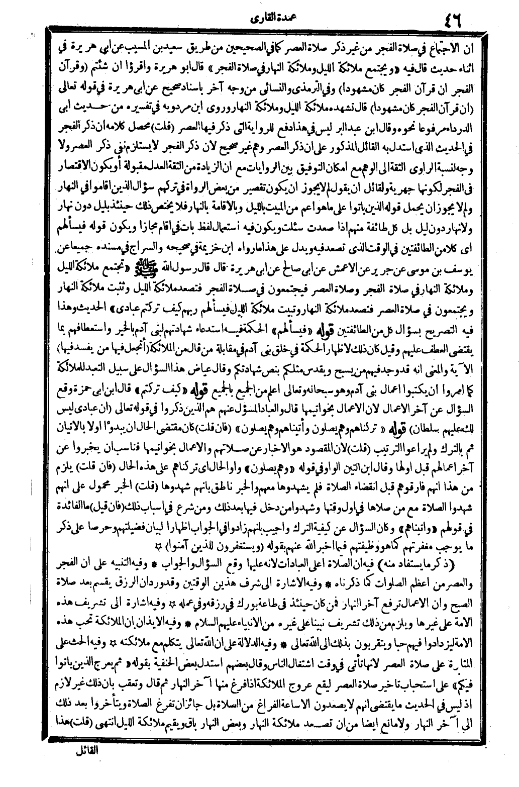 أَن الِاجْتِمَاع فِي صَلَاة الْفجْر من غير ذكر صَلَاة الْعَصْر، كَمَا فِي (الصَّحِيحَيْنِ) من طَرِيق سعيد بن الْمسيب عَن أبي هُرَيْرَة فِي اثناء حَدِيث، قَالَ فِيهِ: (ويجتمع مَلَائِكَة اللَّيْل وملائكة النَّهَار فِي صَلَاة الْفجْر) . قَالَ أَبُو هُرَيْرَة: واقرأوا إِن شِئْتُم: {وَقُرْآن الْفجْر إِن قُرْآن الْفجْر كَانَ مشهودا} (الْإِسْرَاء: 78) : وَفِي التِّرْمِذِيّ وَالنَّسَائِيّ من وَجه آخر بِإِسْنَاد صَحِيح عَن أبي هُرَيْرَة فِي قَوْله تَعَالَى: {إِن قُرْآن الْفجْر كَانَ مشهودا} (الْإِسْرَاء: 78) . قَالَ: تشهده مَلَائِكَة اللَّيْل وملائكة النَّهَار. وروى ابْن مرْدَوَيْه فِي تَفْسِيره من حَدِيث أبي الدَّرْدَاء مَرْفُوعا نَحوه، وَقَالَ ابْن عبد الْبر: لَيْسَ فِي هَذَا دفع للرواية الَّتِي ذكر فِيهَا الْعَصْر. قلت: مُحَصل كَلَامه أَن ذكر الْفجْر فِي الحَدِيث الَّذِي اسْتدلَّ بِهِ الْقَائِل الْمَذْكُور على أَن ذكر الْعَصْر وهم غير صَحِيح، لِأَن ذكر الْفجْر لَا يسْتَلْزم نفي ذكر الْعَصْر، وَلَا وَجه لنسبة الرَّاوِي الثِّقَة إِلَى الْوَهم مَعَ إِمْكَان التَّوْفِيق بَين الرِّوَايَات، مَعَ أَن الزِّيَادَة من الثِّقَة الْعدْل مَقْبُولَة، أَو يكون الِاقْتِصَار فِي الْفجْر لكَونهَا جهرية، وَلقَائِل أَن يَقُول: لِمَ لَا يجوز أَن يكون تَقْصِير من بعض الروَاة فِي تَركهم سُؤال الَّذين أَقَامُوا فِي النَّهَار؟ ولِمَ لَا يجوز أَن يحمل قَوْله: الَّذين باتوا، على مَا هُوَ أَعم من الْمبيت بِاللَّيْلِ وبالإقامة بِالنَّهَارِ، فَلَا يخْتَص ذَلِك حِينَئِذٍ بلَيْل دون نَهَار، وَلَا نَهَار دون ليل، بل كل طَائِفَة مِنْهُم إِذا صعدت سُئِلت؟ وَيكون فِيهِ اسْتِعْمَال لفظ: بَات، فِي أَقَامَ مجَازًا، وَيكون قَوْله: فيسألهم، أَي: كلاًّ من الطَّائِفَتَيْنِ فِي الْوَقْت الَّذِي تصعد فِيهِ؟ وَيدل على هَذَا مَا رَوَاهُ ابْن خُزَيْمَة فِي (صَحِيحه) والسراج فِي (مُسْنده) جَمِيعًا عَن يُوسُف بن مُوسَى عَن جرير عَن الْأَعْمَش عَن أبي صَالح عَن أبي هُرَيْرَة، قَالَ: قَالَ رَسُول الله صلى الله عَلَيْهِ وَسلم: (تَجْتَمِع مَلَائِكَة اللَّيْل وملائكة النَّهَار فِي صَلَاة الْفجْر وَصَلَاة الْعَصْر، فيجتمعون فِي صَلَاة الْفجْر، فتصعد مَلَائِكَة اللَّيْل وَتثبت مَلَائِكَة النَّهَار، ويجتمعون فِي صَلَاة الْعَصْر، فتصعد مَلَائِكَة النَّهَار وتبيت مَلَائِكَة اللَّيْل، فيسألهم رَبهم: كَيفَ تركْتُم عبَادي؟) الحَدِيث، وَهَذَا فِيهِ التَّصْرِيح بسؤال كل من الطَّائِفَتَيْنِ. قَوْله: (فيسألهم) الْحِكْمَة فِيهِ استدعاء شَهَادَتهم لبني آدم بِالْخَيرِ، واستعطافهم بِمَا يَقْتَضِي الْعَطف عَلَيْهِم، وَقيل: كَانَ ذَلِك لإِظْهَار الْحِكْمَة فِي خلق بني آدم فِي مُقَابلَة من قَالَ من الْمَلَائِكَة {أَتجْعَلُ فِيهَا من يفْسد فِيهَا} (الْبَقَرَة: 30) . الْآيَة وَالْمعْنَى: أَنه قد وجد فيهم من يسبح ويقدس مثلكُمْ بِنَصّ شهادتكم. وَقَالَ عِيَاض: هَذَا السُّؤَال على سَبِيل التَّعَبُّد للْمَلَائكَة، كَمَا أمروا أَن يكتبوا أَعمال بني آدم، وَهُوَ سُبْحَانَهُ وَتَعَالَى أعلم من الْجَمِيع بِالْجَمِيعِ. قَوْله: (كَيفَ تركْتُم؟) قَالَ ابْن أبي حَمْزَة: وَقع السُّؤَال عَن آخر الْأَعْمَال، لِأَن الْأَعْمَال بخواتيمها. قَالَ: والعباد المسؤول عَنْهُم هم الَّذين ذكرُوا فِي قَوْله تَعَالَى: {إِن عبَادي لَيْسَ لَك عَلَيْهِم سُلْطَان} (الْحجر: 242 والإسراء: 65) . قَوْله: (تركناهم وهم يصلونَ وأتيناهم وهم يصلونَ) . فَإِن قلت: كَانَ مُقْتَضى الْحَال أَن يبدؤا أَولا بالإتيان ثمَّ بِالتّرْكِ، وَلم يراعوا التَّرْتِيب؟ قلت: لِأَن الْمَقْصُود هُوَ الْإِخْبَار عَن صلَاتهم، والأعمال بخواتيمها، فَنَاسَبَ أَن يخبروا عَن آخر أَعْمَالهم قبل أَولهَا. وَقَالَ ابْن التِّين: الْوَاو، فِي قَوْله: (وهم يصلونَ) وَاو الْحَا