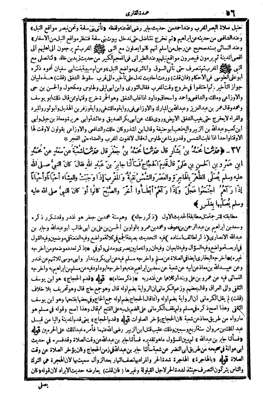 560 - حدَّثنا مُحَمَّدُ بنُ بَشَّارٍ قَالَ حدَّثنا مُحَمَّدُ بنُ جَعْفَرٍ قَالَ حدَّثنا شُعْبَةَ عنْ سَعْدٍ عنْ مُحَمَّدِ ابنِ عَمْرِو بنِ الحَسَنِ بنِ عَليٍّ قَالَ قَدِمَ الحَجّاجُ فَسَأَلْنا جَابِرَ بنَ عَبْدِ الله فقالَ كانَ النَّبيُّ صلى الله عَلَيْهِ وَسلم يُصَلِّي الظُّهْرَ بِالهَاجِرَةِ والعَصْرَ والشَّمْسُ نَقِيَّةٌ وَالْمَغْرِبَ إذَا وَجَبَتْ والعِشَاءَ أَحْيَانا وأَحْيَانا إذَا رَآهُمُ اجْتَمَعُوا عَجَّلَ وَإِذَا رَآهُمْ أبْطَأُوا أخَّرَ والصُّبْحَ كانُوا أوْ كانَ النبيُّ صلى الله عَلَيْهِ وَسلم يُصَلِّيهَا بِغَلَسٍ. (الحَدِيث 560 طرفه فِي: 565) .