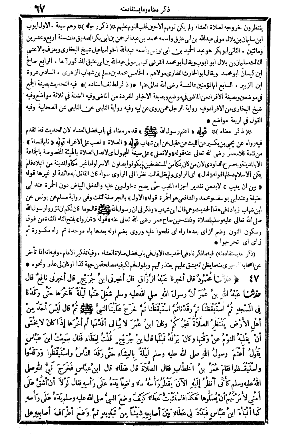 570 - 571 حدَّثنا مَحْمُودُ قَالَ أخبرنَا عَبْدُ الرَّزَّاقِ قَالَ أَخْبرنِي ابنُ جُرَيْجٍ قَالَ أَخْبرنِي نافِعٌ قَالَ حدَّثنا عَبْدُ الله بنُ عُمَرَ أنَّ رسولَ الله صلى الله عَلَيْهِ وَسلم شُغِلَ عَنْهَا لَيْلَةً فَأخَّرَهَا حَتَّى رَقَدْنَا فِي المَسْجِدِ ثُمَّ اسْتَيْقَظْنَا ثمَّ رَقَدْنَا ثُمَّ اسْتَيْقَظْنَاثُمَّ خَرَجَ عَلَيْنَا النَّبيُّ صلى الله عَلَيْهِ وَسلم ثُمَّ قَالَ لَيْسَ أحَدٌ مِنْ أهْلِ الأرْضِ يَنْتَظِرُ الصَّلاَةَ غَيْرُكُمْ وكانَ ابنُ عُمَرَ لَا يُبَالِي أقَدَّمَهَا أم أخَّرَهَا إذَا كانَ لاَ يَخْشَى أنْ يَغْلِبَهُ النوْمُ عنْ وَقْتِهَا وكانَ يَرْقُدُ قَبْلَهَا قَالَ ابنُ جُرَيْجٍ قُلْتُ لِعَطَاءٍ فقَالَ سَمِعْتُ ابنَ عَبَّاسٍ يَقُولُ أعْتَمَ رسولُ الله لَيْلَةً بِالعِشَاءِ حَتَّى رَقَدَ النَّاسُ واسْتَيْقَظُوا وَرَقَدُوا واسْتَيْقَظُوا فقامَ عُمَرُ بنُ الخَطَّابِ فَقَالَ الصَّلاَةَ قَالَ عَطَاءٌ قَالَ ابنُ عبَّاسٍ فِخَرَجَ نَبِيُّ الله صلى الله عَلَيْهِ وَسلم كأنِّي أنْظُرُ إلَيْهِ الآنَ يَقْطُرُ رَأْسُهُ مَاء واضِعا يَدَهُ عَلَى رَأسِهِ فَقَالَ لَوْلاَ أنْ أشُقَّ عَلَى أُمَّتِي لأَمَرْتُهُمْ أنْ يُصَلُّوها هَكَذَا فاسْتَثْبَتُّ عَطَاءً كَيْفَ وضعَ النبيُّ صلى الله عَلَيْهِ وَسلم يَدَهُ عَلَى رَأسِهِ كَمَا أنْبَأَهُ ابنُ عبَّاسٍ فَبَدَّدَ لِي عَطَاءٌ بَيْنَ أصَابِعِهِ شَيْئَا مِنْ تَبْدِيدٍ ثمَّ وَضَعَ أطْرَافَ أصَابِعِه على