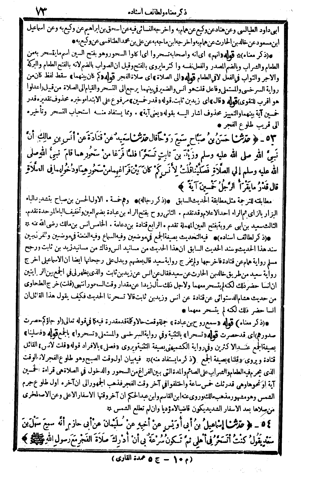 ذكر لطائف إِسْنَاده فِيهِ: التحديث بِصِيغَة الْجمع فِي موضِعين. وَفِيه: السماع. وَفِيه: العنعنة فِي موضِعين، وَالْفرق بَين سَنَد هَذَا الحَدِيث وَسَنَد الحَدِيث السَّابِق أَن هَذَا الحَدِيث من مسانيد أنس، وَذَاكَ من مسانيد زيد بن ثَابت، وَرجح مُسلم رِوَايَة همام عَن قَتَادَة فأخرجها وَلم يخرج رِوَايَة سعيد. قَالَ بَعضهم: وَيدل على رُجْحَانهَا أَيْضا أَن الْإِسْمَاعِيلِيّ أخرج رِوَايَة سعيد من طَرِيق خَالِد بن الْحَارِث عَن سعيد فَقَالَ: عَن أنس عَن زيد بن ثَابت، وَالَّذِي يظْهر لي فِي الْجمع بَين الرِّوَايَتَيْنِ أَن أنسا حضر ذَلِك لكنه لم يتسحر مَعَهُمَا، وَلأَجل ذَلِك سَأَلَ زيدا عَن مِقْدَار وَقت السّحُور. انْتهى. قلت: خرج الطَّحَاوِيّ من حَدِيث هِشَام الدستوَائي عَن قَتَادَة عَن أنس وَزيد بن ثَابت قَالَا: تسحرنا. . الحَدِيث، فَكيف يَقُول هَذَا الْقَائِل: إِن أنسا حضر ذَلِك لكنه لم يتسحر مَعَهُمَا؟